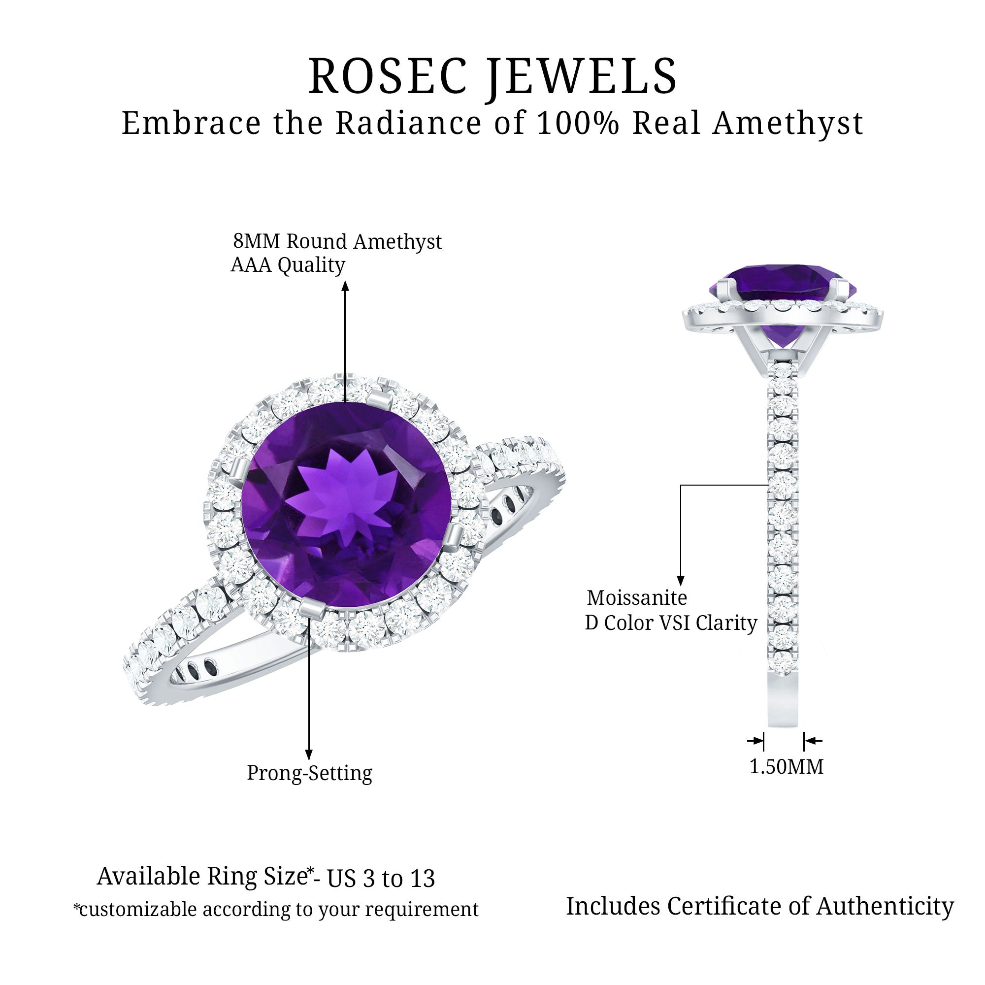 Elevate your proposal with this Classic Engagement Ring, encircled by a brilliant Moissanite Halo. The 7 MM Amethyst takes center stage, captivating with its deep purple hue. Moissanite gems surrounding the amethyst create a dazzling contrast, adding brilliance and opulence. This ring is a timeless blend of elegance and modern luxury, making it an ideal choice for declaring your love and commitment in style.