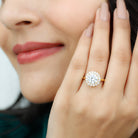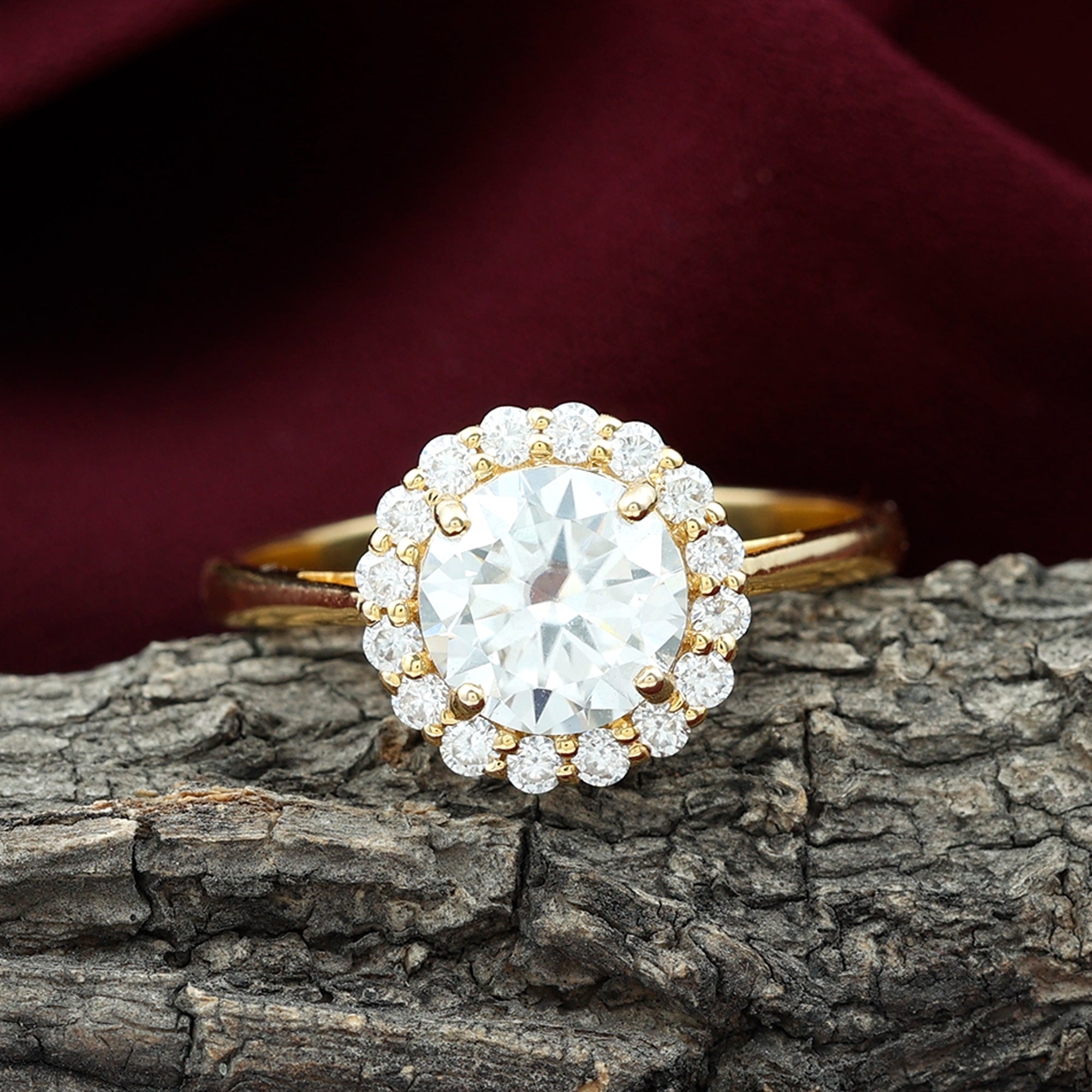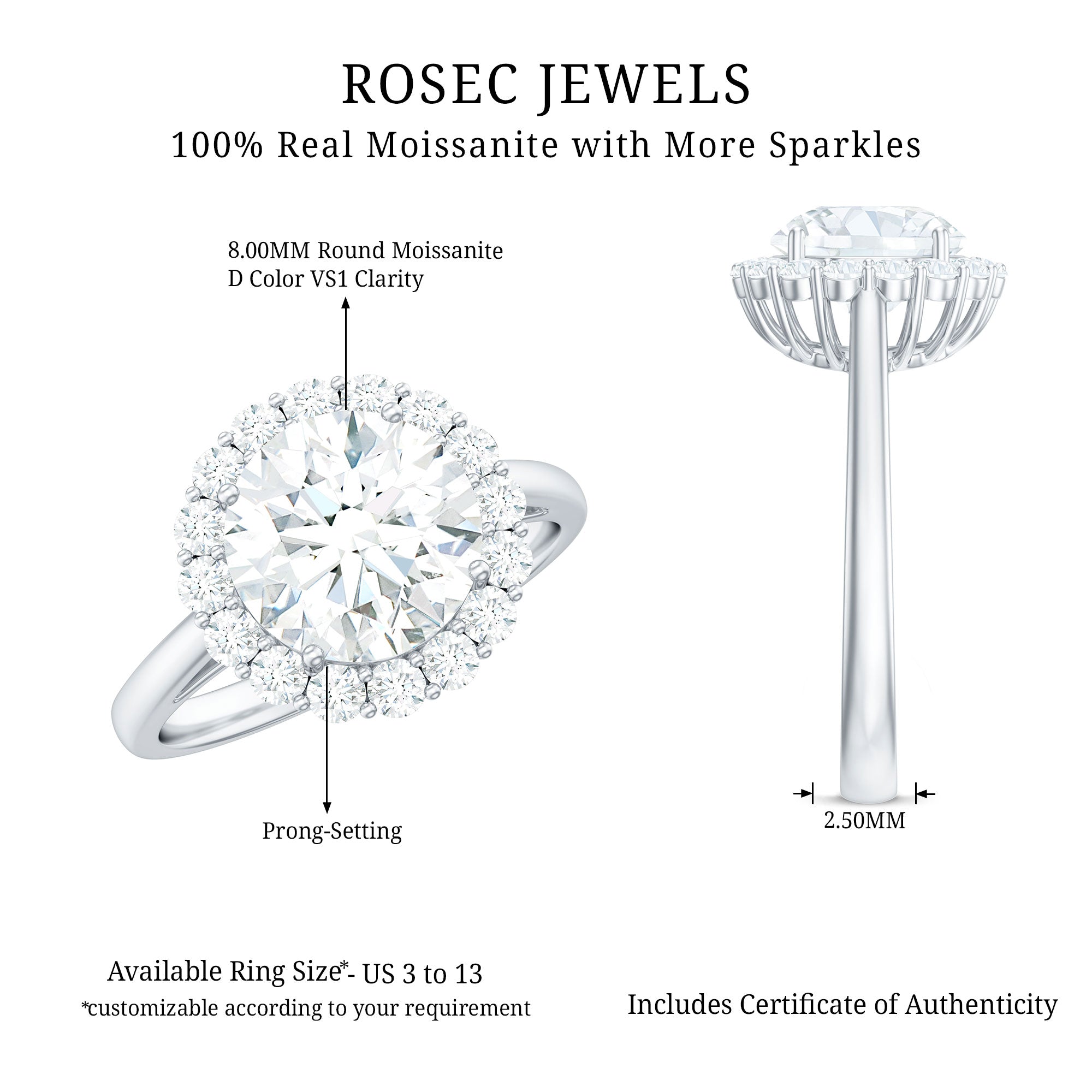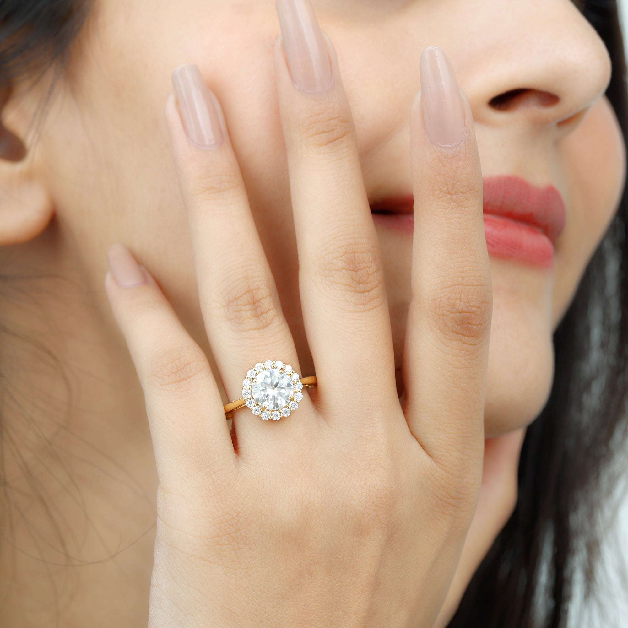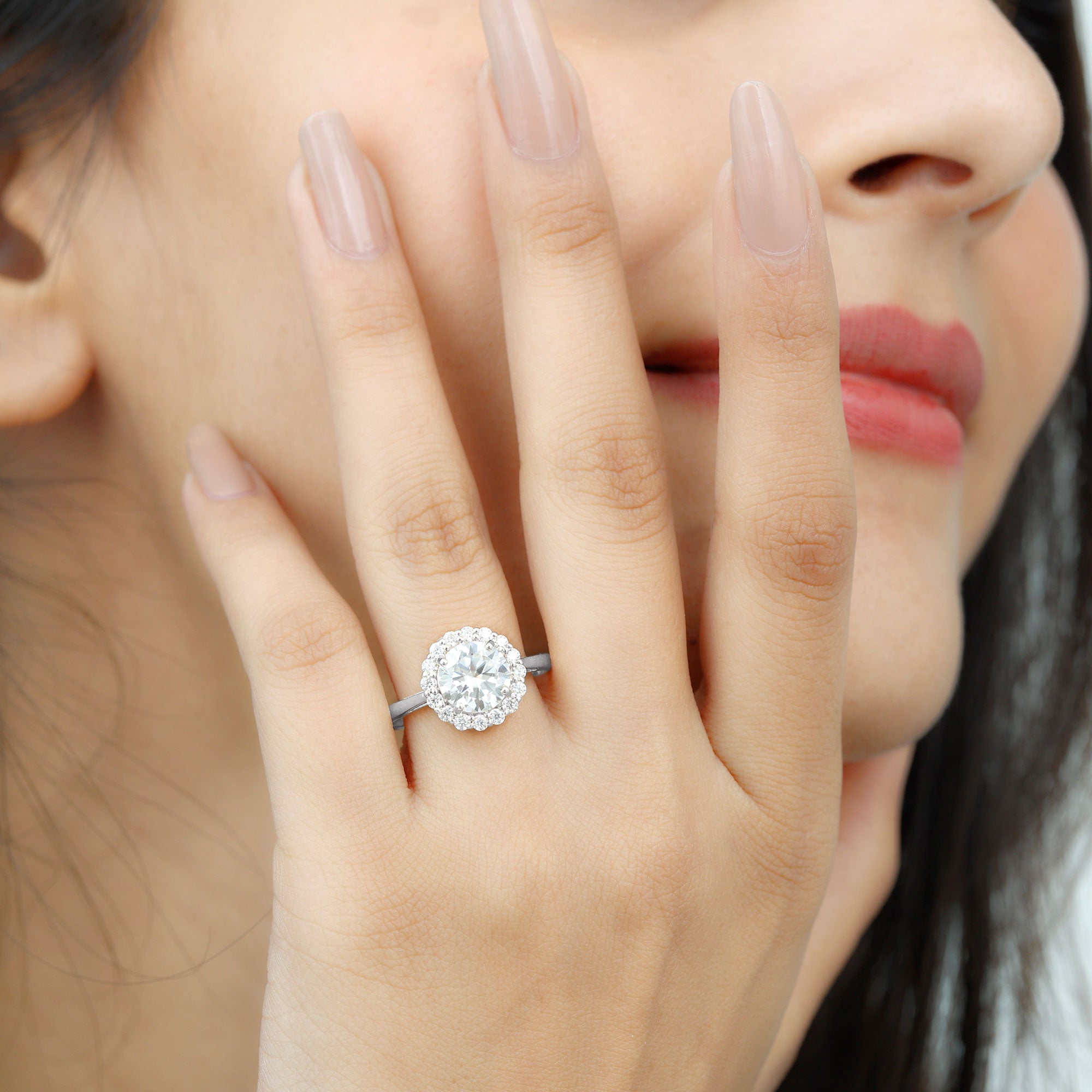 Start your forever with the stunning Moissanite Halo Engagement Ring, a beautiful piece made to celebrate your love in its truest form. At the center of this classic design is an 8 MM round cut moissanite, securely held in prong setting and surrounded by a shining halo of smaller moissanite stones. This halo not only enhances the center stones sparkle and brilliance but also adds a touch of elegance, making this Round Engagement Ring a memorable symbol of commitment. Designed for those who appreciate elegance with a purpose, this Moissanite Engagement Ring merges the beauty of traditional design with the glow of sustainable gemstones. The simple band allows the halo and center stone to shine, while still providing a comfortable fit for daily wear. Whether you are planning a lovely proposal or looking to purchase a beloved piece, this Halo Ring delivers a significant message, elegant, radiant, and responsibly made. Available in US ring sizes 3 to 13, this piece guarantees a perfect fit for every bride-to-be. Packaged in a luxurious jewelry box, it is prepared to make the moment unforgettable. Let this 2 Carat Moissanite Ring be the promise you cherish every day.