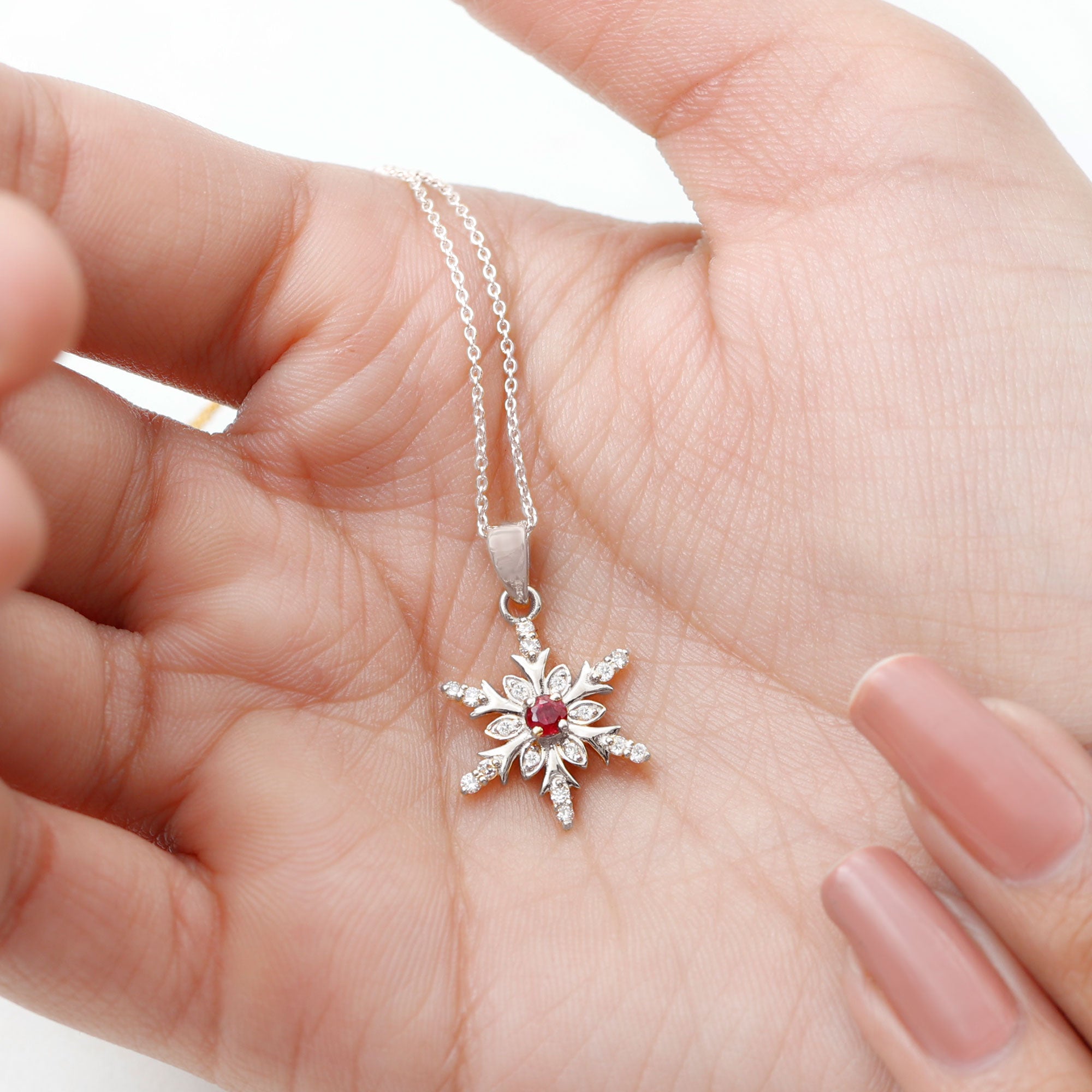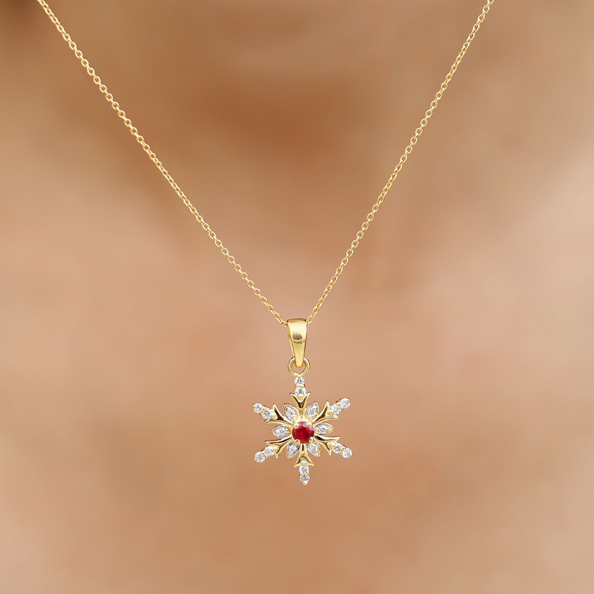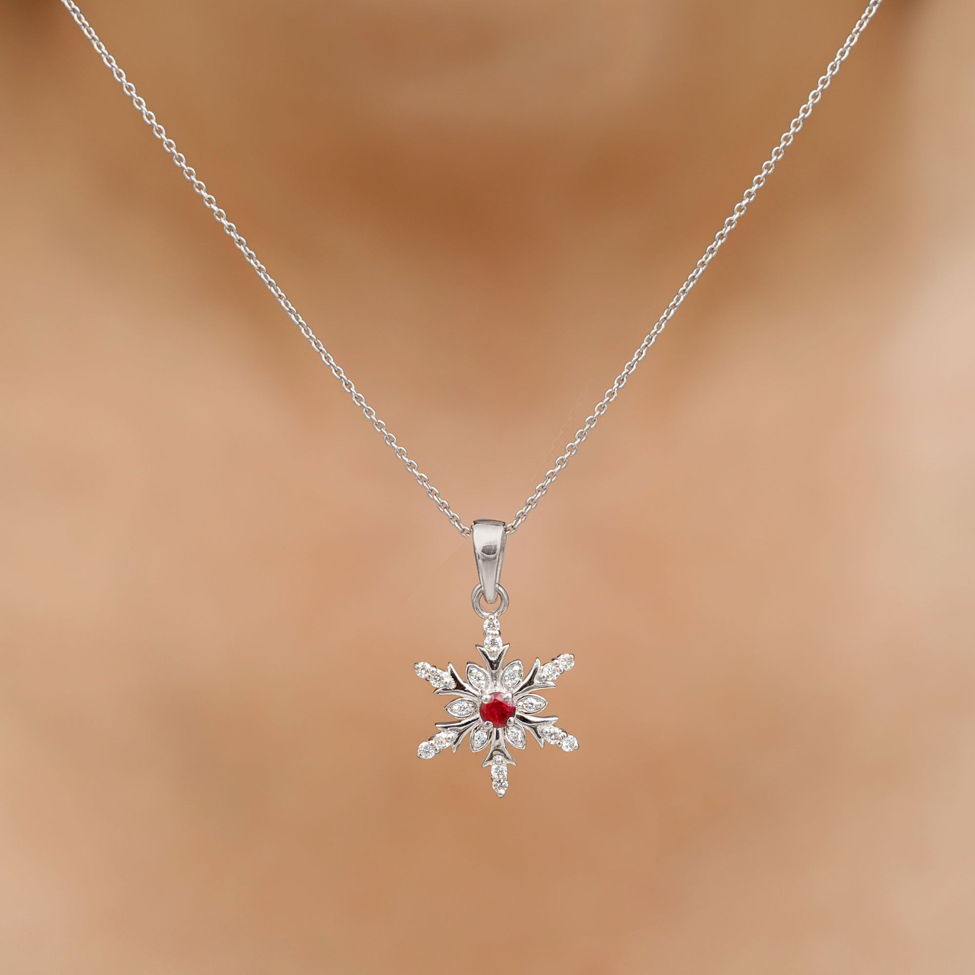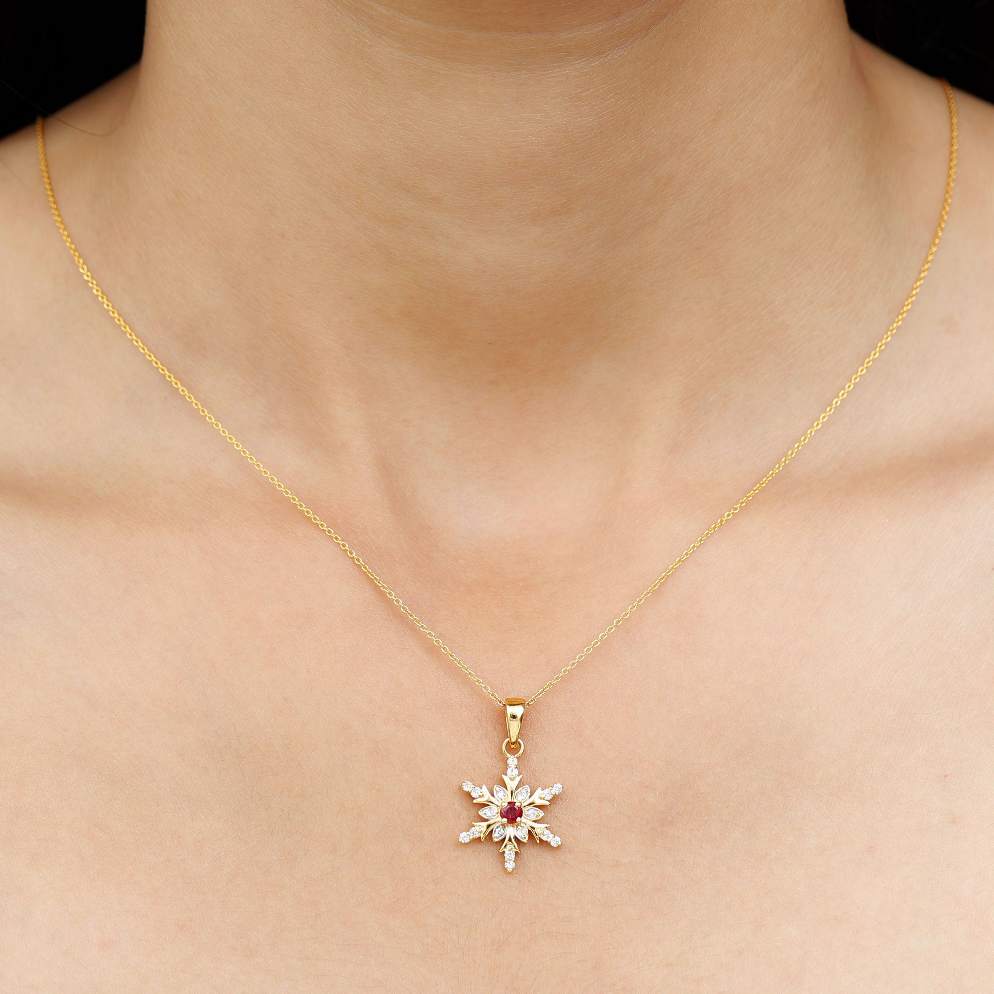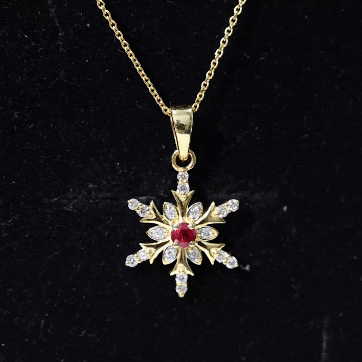 Elevate your everyday look with our Snowflake pendant, adorned with a Round Shape Ruby as the Solitaire in a Prong Setting. Complemented by Round Shape Diamond Stones set in Prong Setting. This piece is the perfect way to add a touch of luxury to your everyday attire.