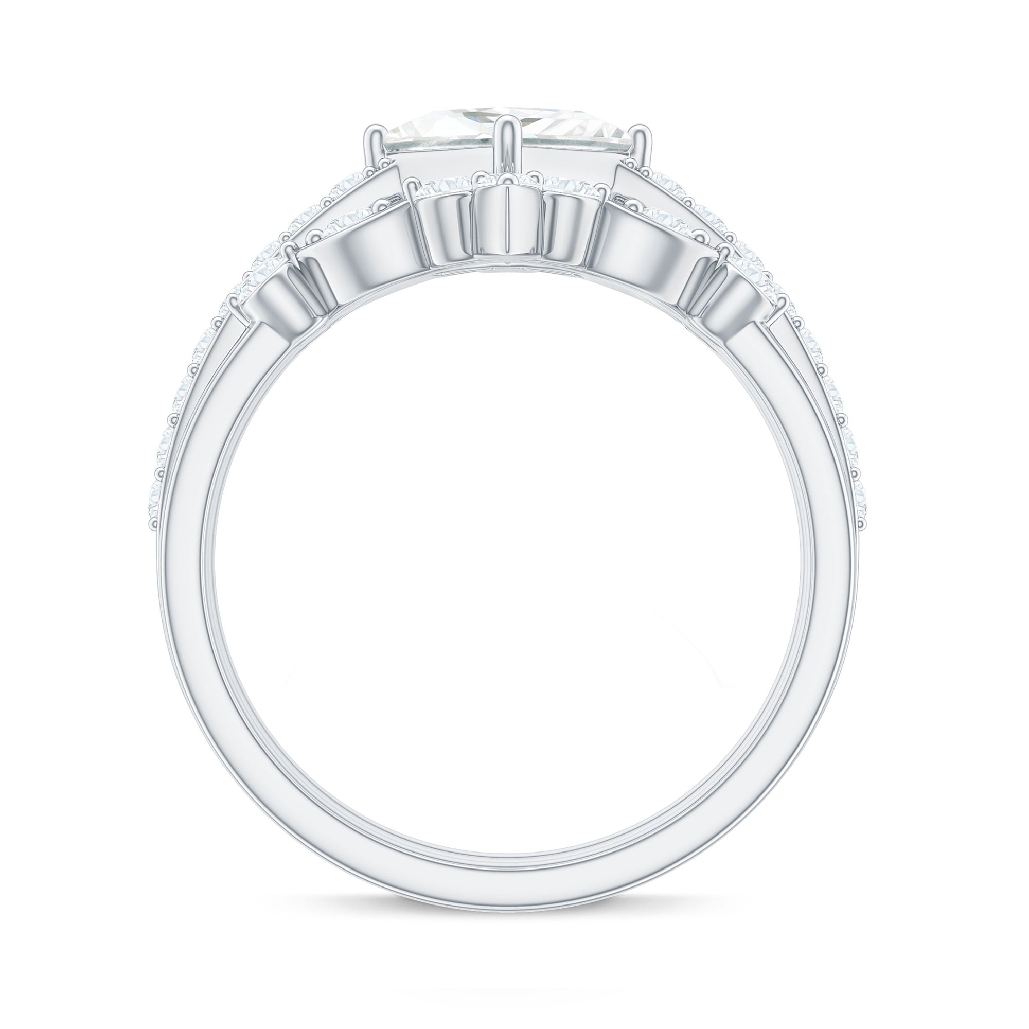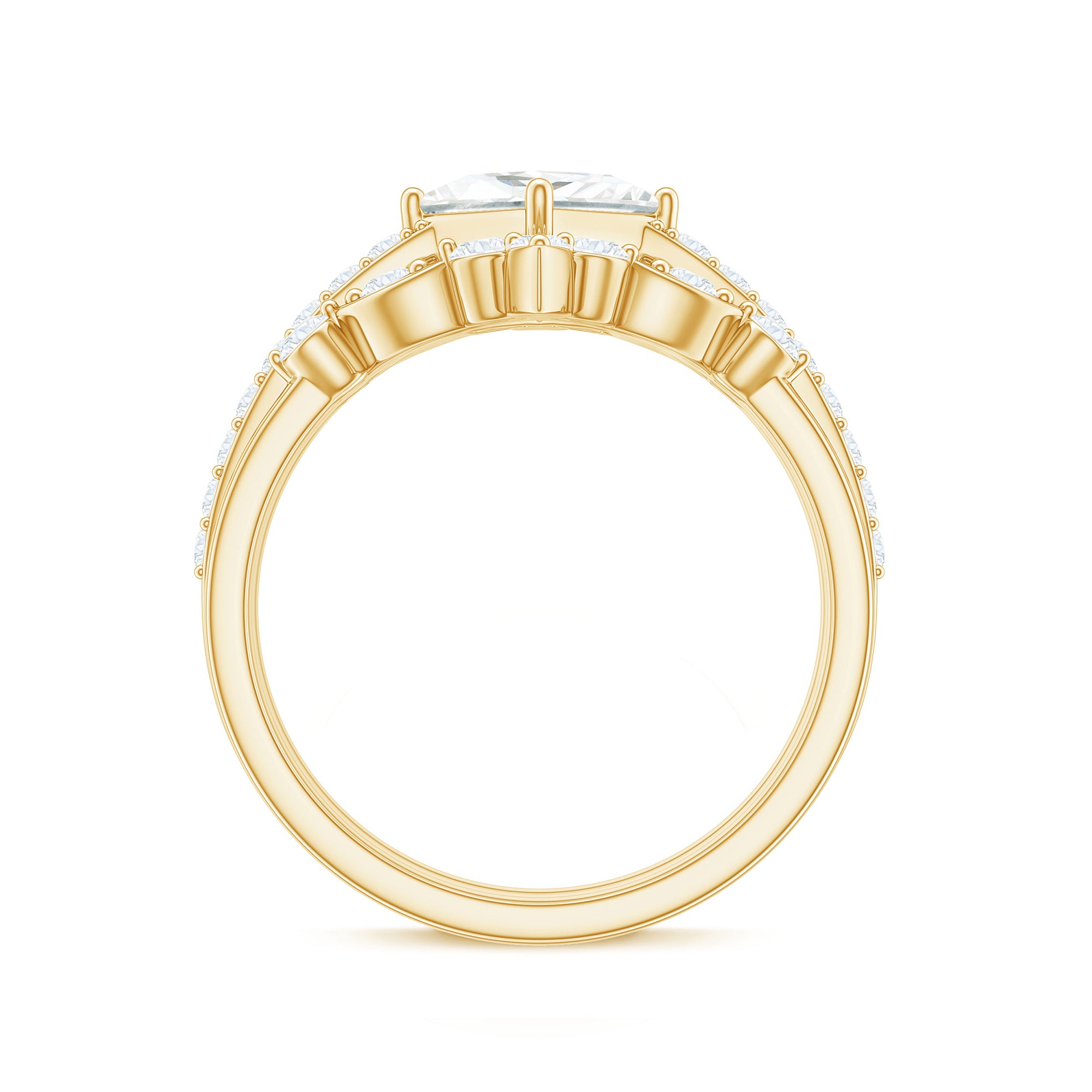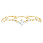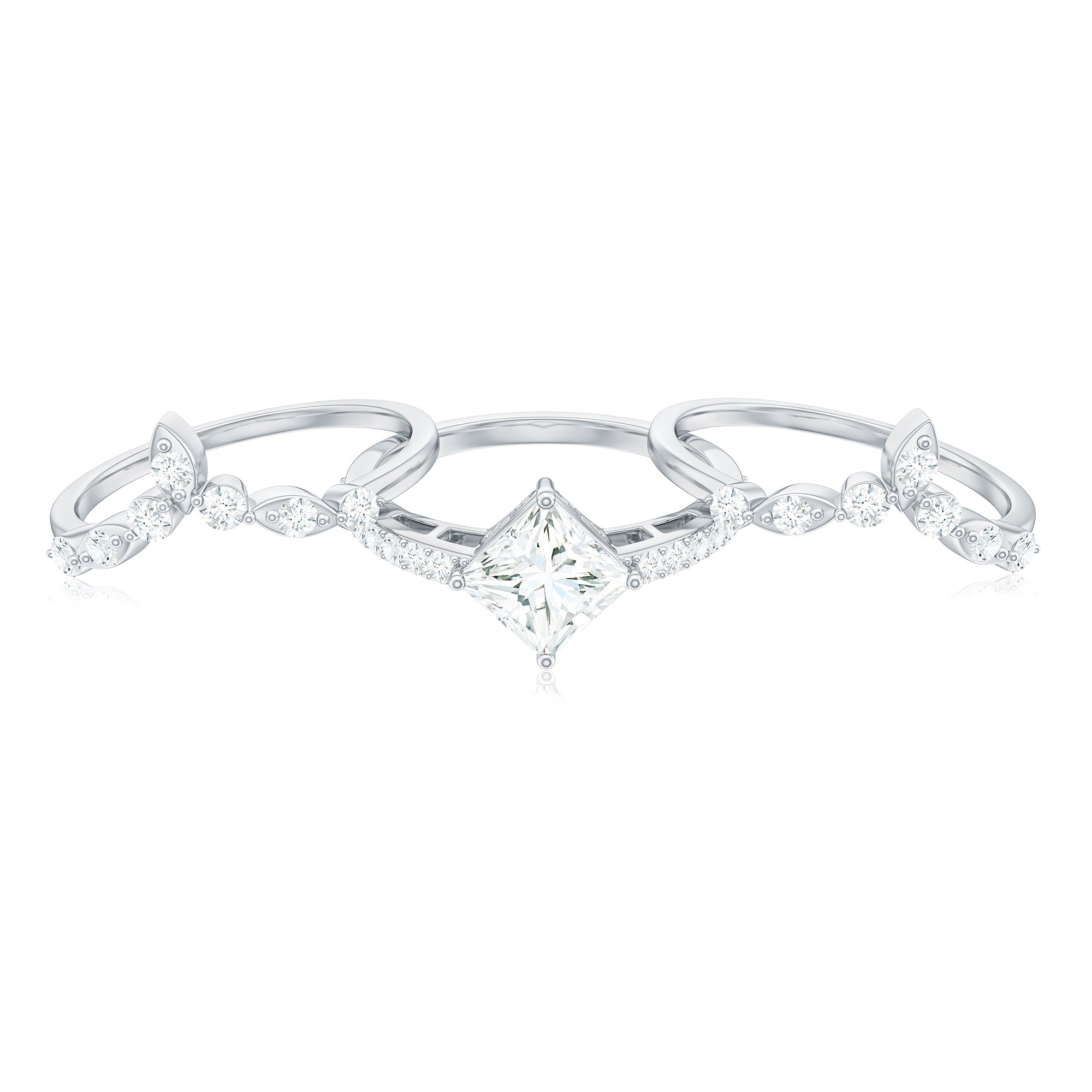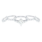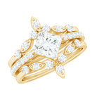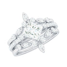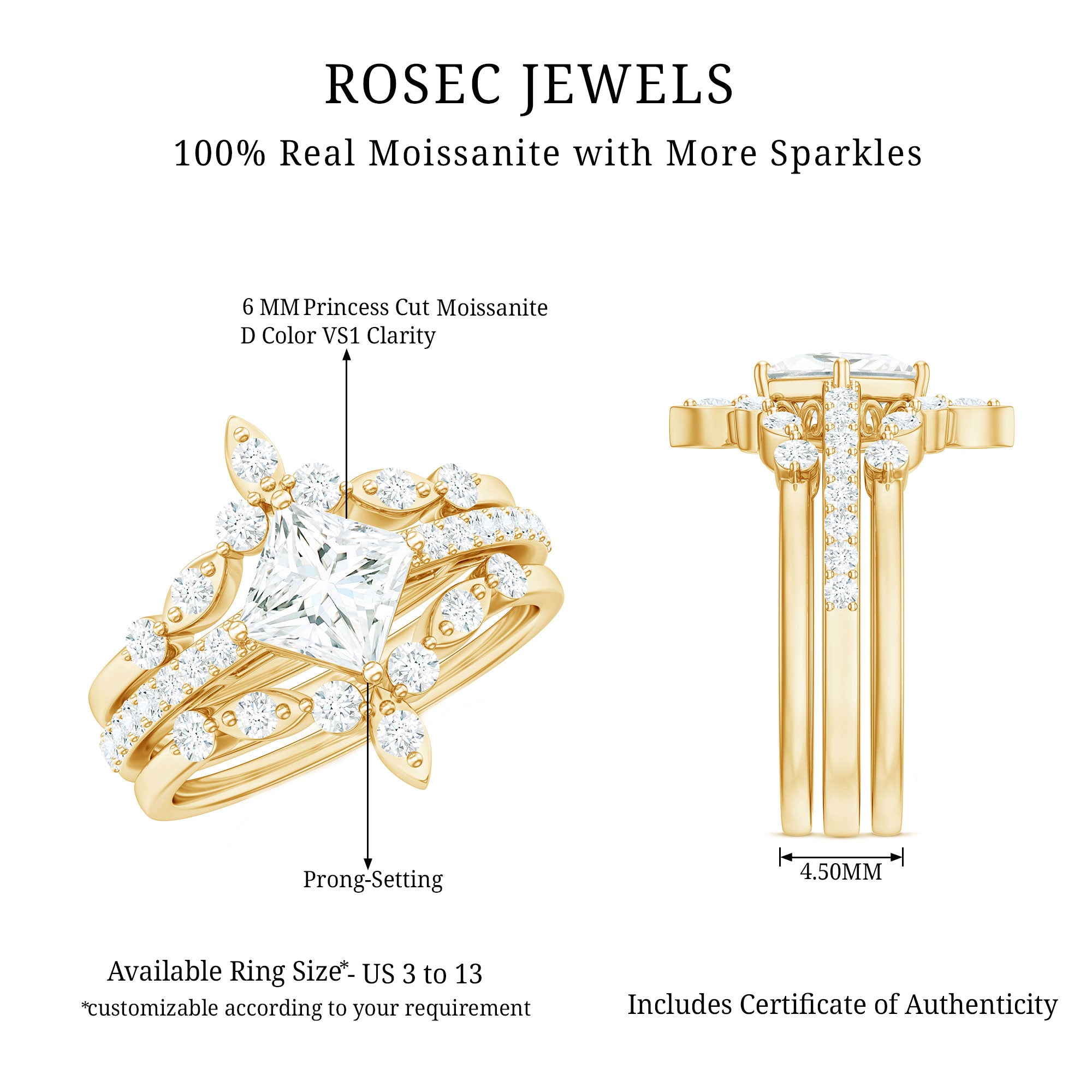 Mark your lifetime memory with this Moissanite Engagement Ring Set, it is as unique as your bond. Designed with elegance and brilliance in mind, this 3 Piece Bridal Ring Set is a beautiful representation of everlasting love. At the center of the set is a stunning 6 MM princess cut moissanite, expertly crafted and set with side stones. Securely held in prong setting, this D-VS1 quality moissanite dazzles with incredible fire and clarity, providing a luxurious appearance that can compete with the finest diamonds. Its brilliance is beautifully enhanced by two matching ring guards, each featuring round cut moissanite stones over marquise designs that gently frame the center ring on both sides. The outcome is a glamorous Trio Wedding Ring Set that radiates elegance from every angle. Made from high quality materials and designed to last, this Princess Cut Wedding Set strikes the perfect balance between modern design and timeless beauty. Whether worn as a complete set for a stunning wedding day look or styled separately for everyday elegance, these rings fit seamlessly into your lifestyle while always reminding you of your love story. This Engagement Ring with Wedding Band Set comes in a luxurious jewelry box along with a Gemstone Authenticity Certificate, providing peace of mind and a premium unboxing experience.