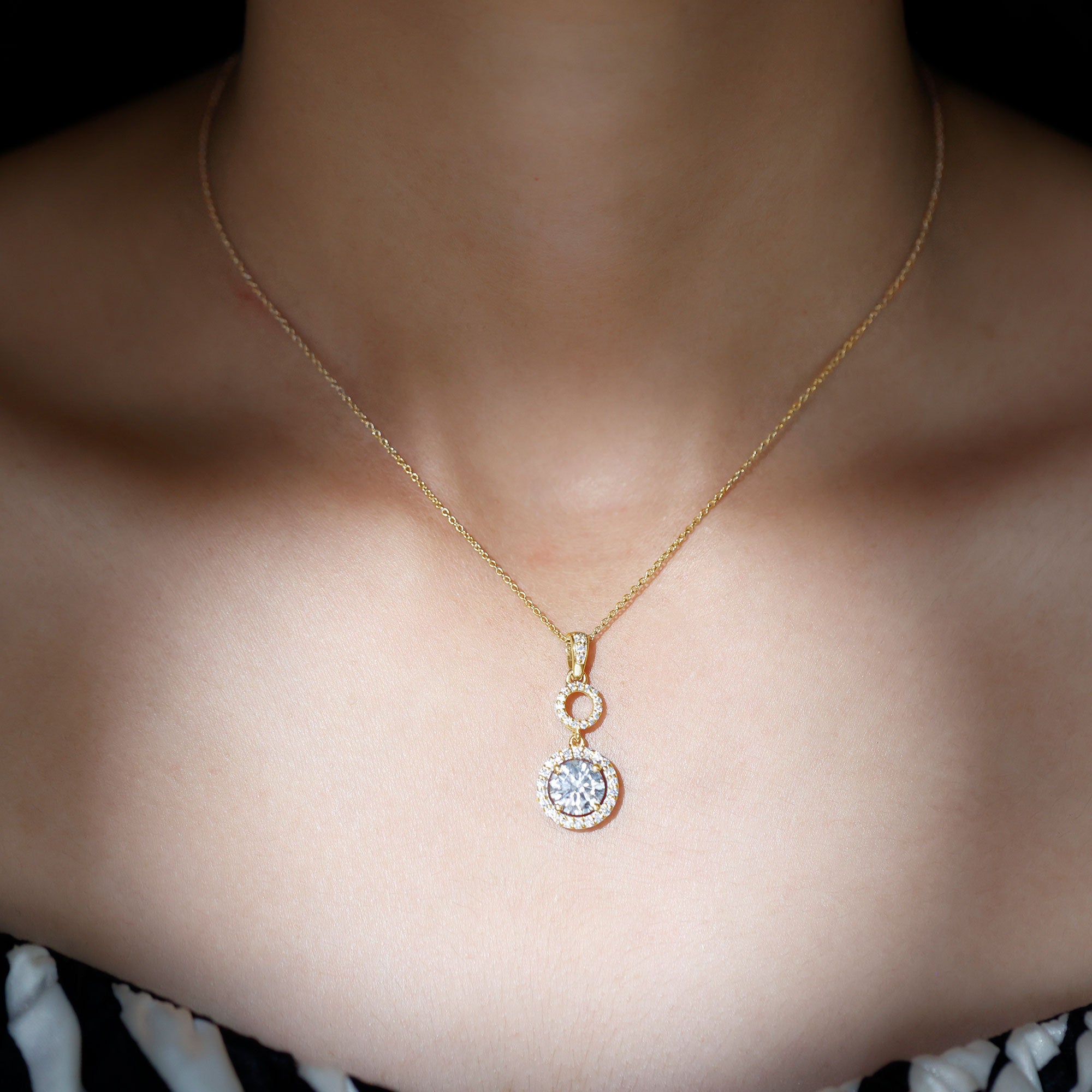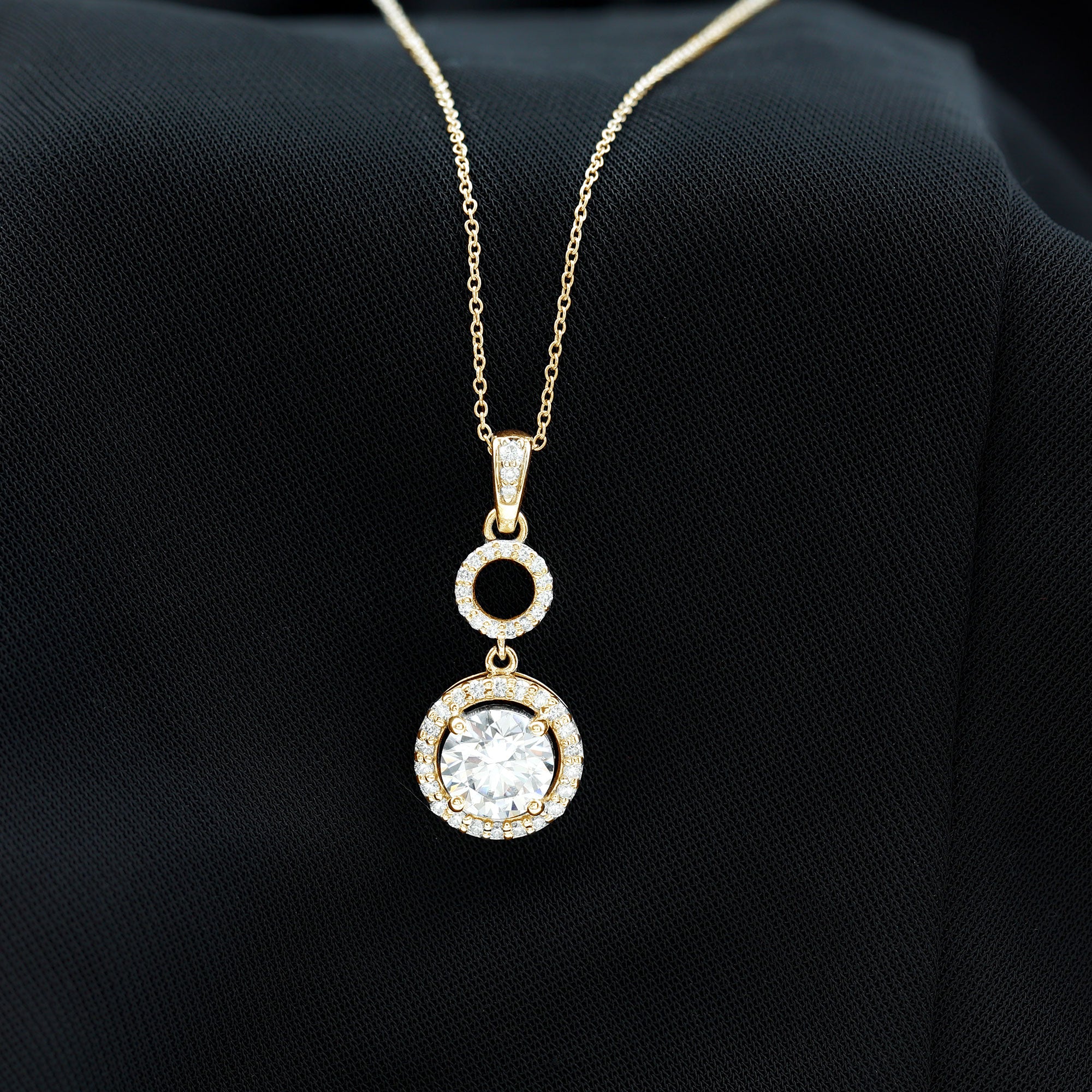 An enchanting round moissanite, held securely in claw prongs, elegantly adorns the center of this pendant necklace. It is surrounded by a radiant halo of moissanite stones, creating a captivating and dazzling effect. The pendant is further enhanced by a shimmering circular frame adorned with round moissanite stones, adding to its resplendent beauty. Its drop style exudes elegance and is impossible to ignore.