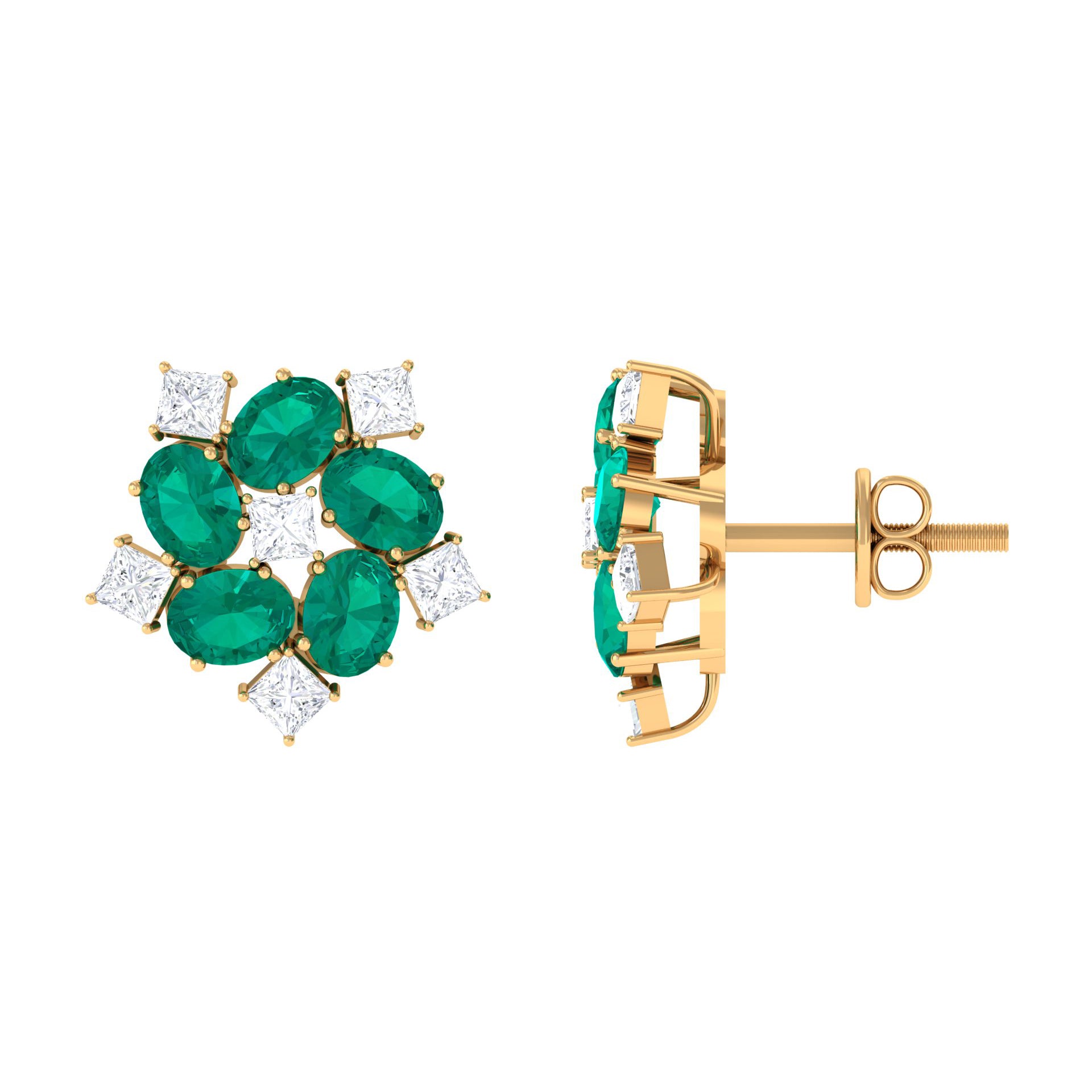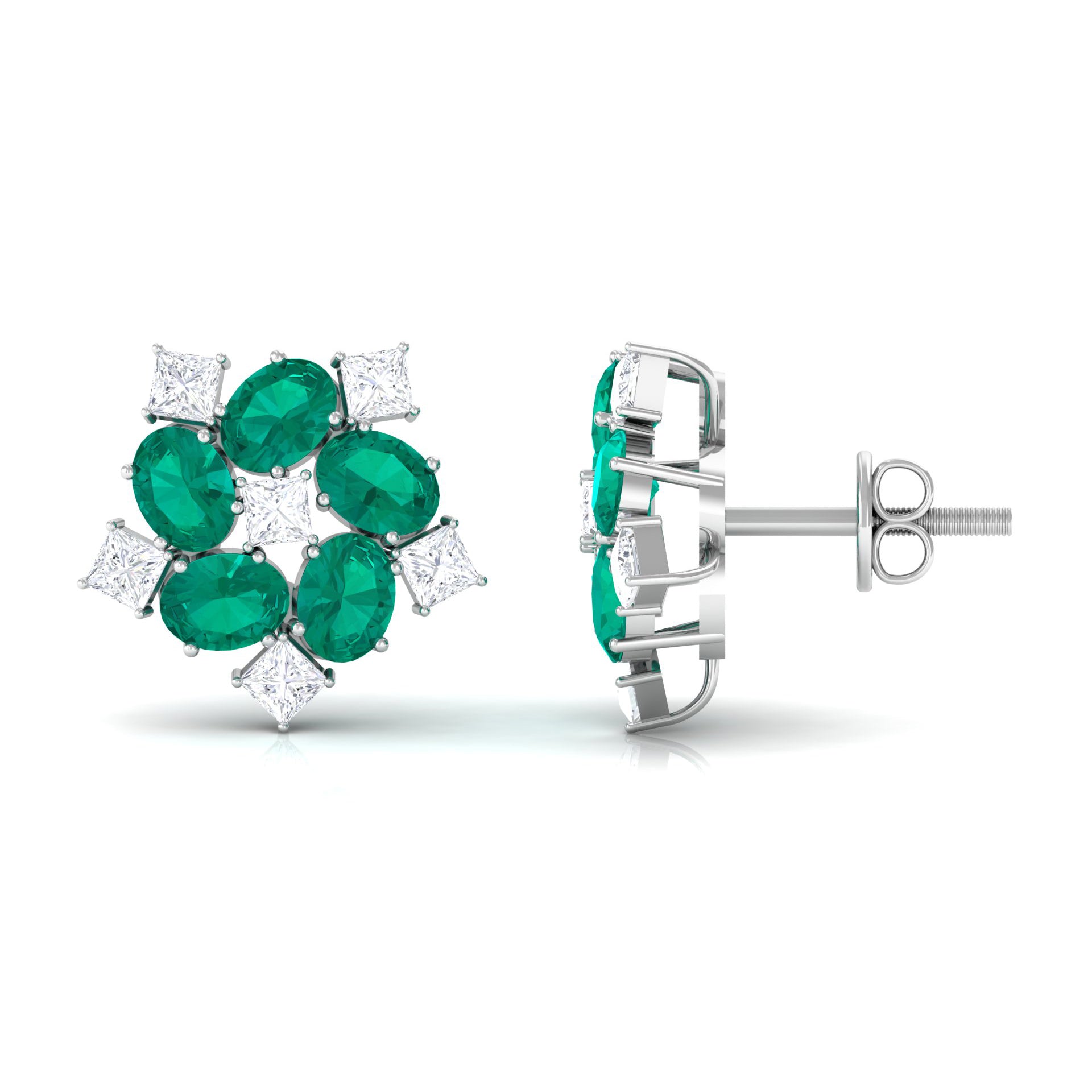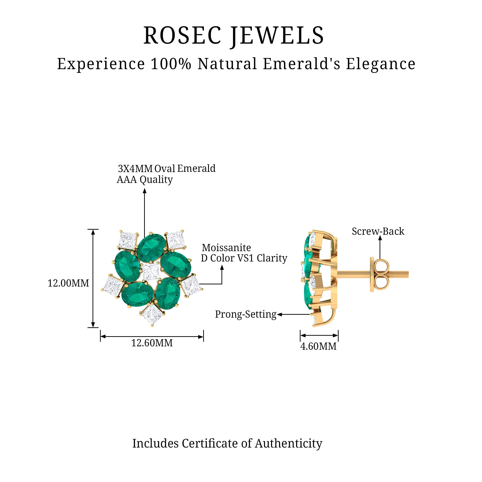 Stand out your look with these Cluster Stud Earrings and make a statement, embellished with Oval Emerald and Princess Cut Moissanite set in Prong Setting.