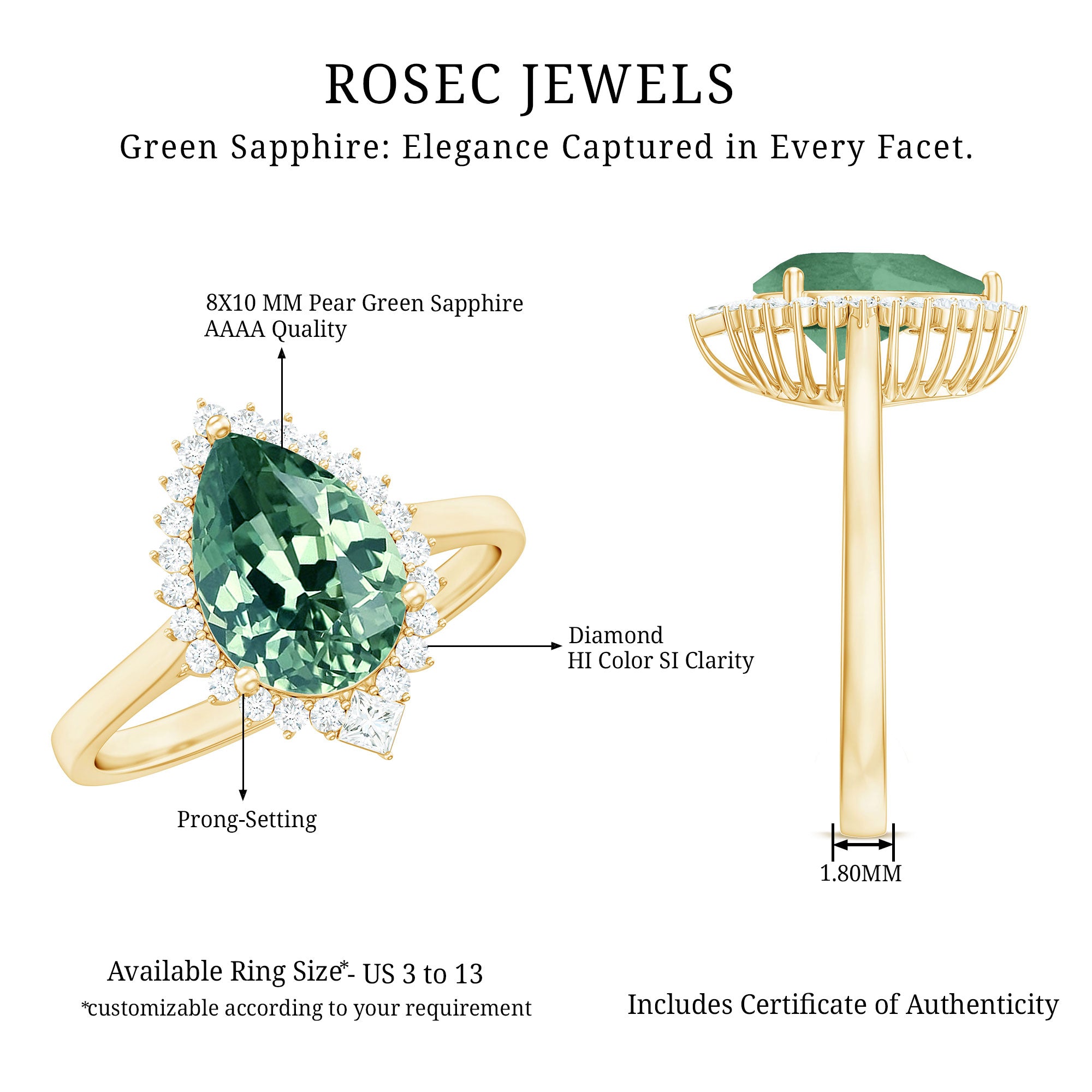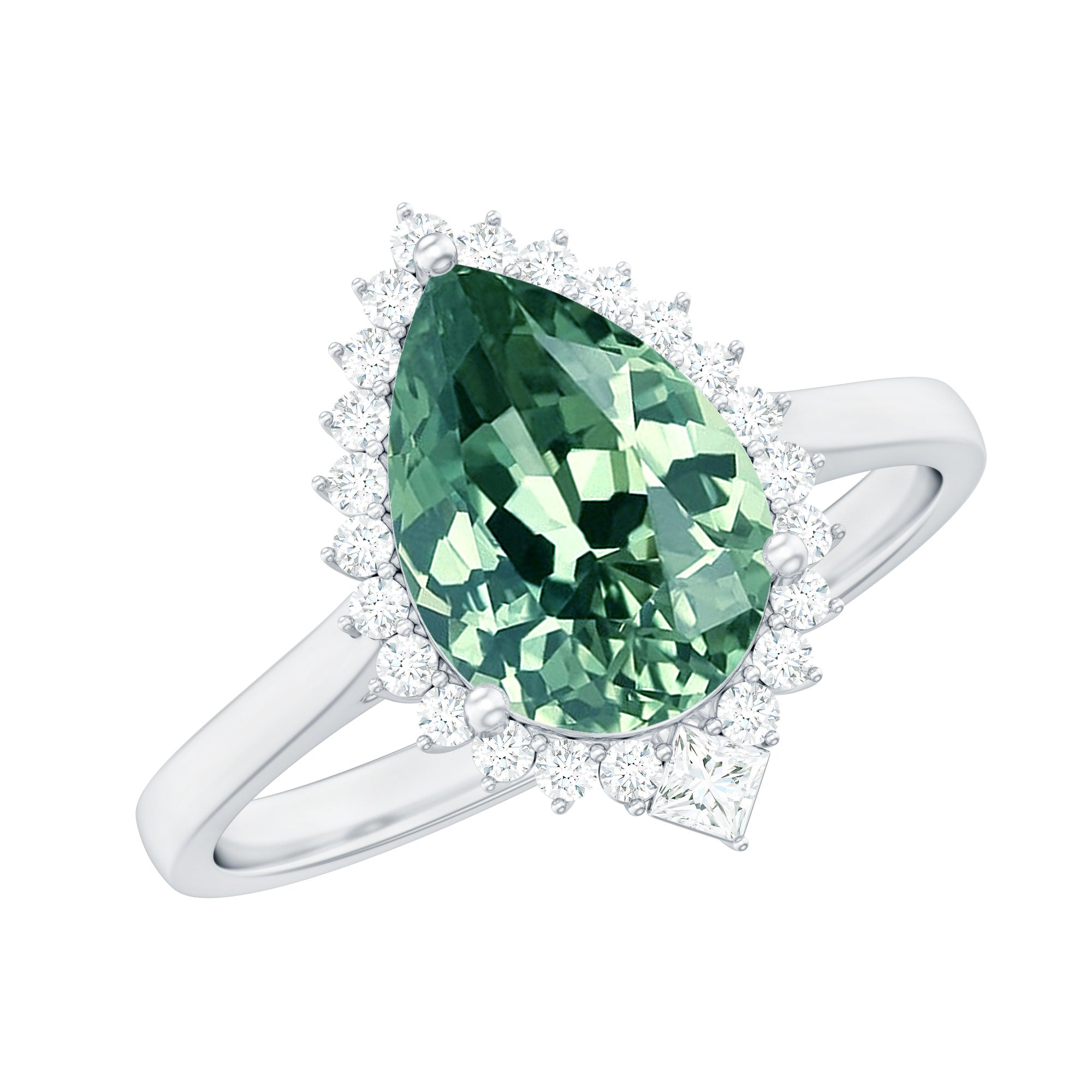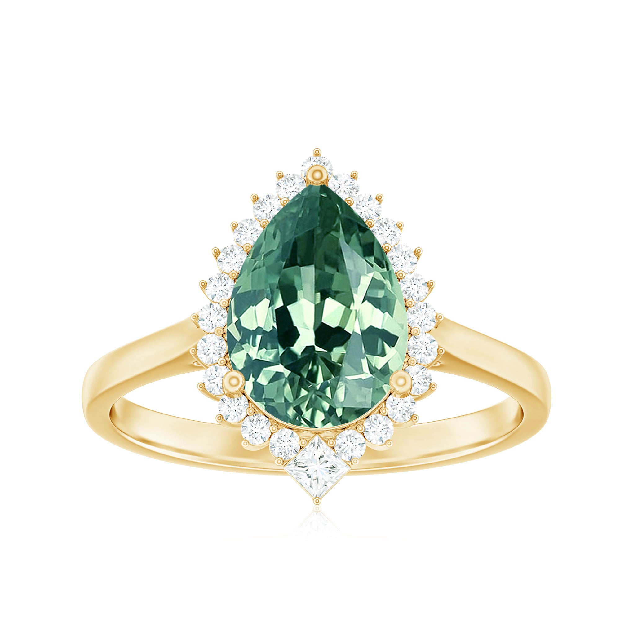 An eloquent expression of emotions, the Created Green Sapphire Engagement Ring is the perfect token of love for your better half. This beautiful ring will leave her on cloud nine, effortlessly captivating their attention. With a Pear Cut Created Green Sapphire embraced by a Diamond Halo, it exudes a glistening allure.