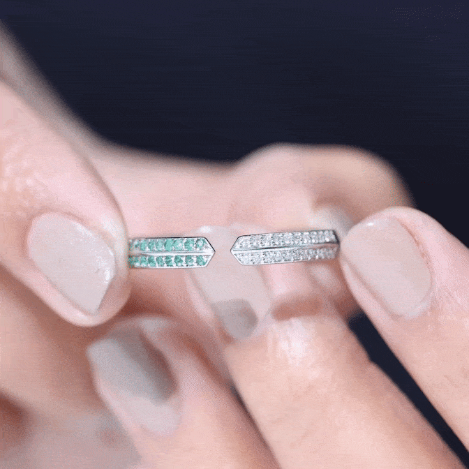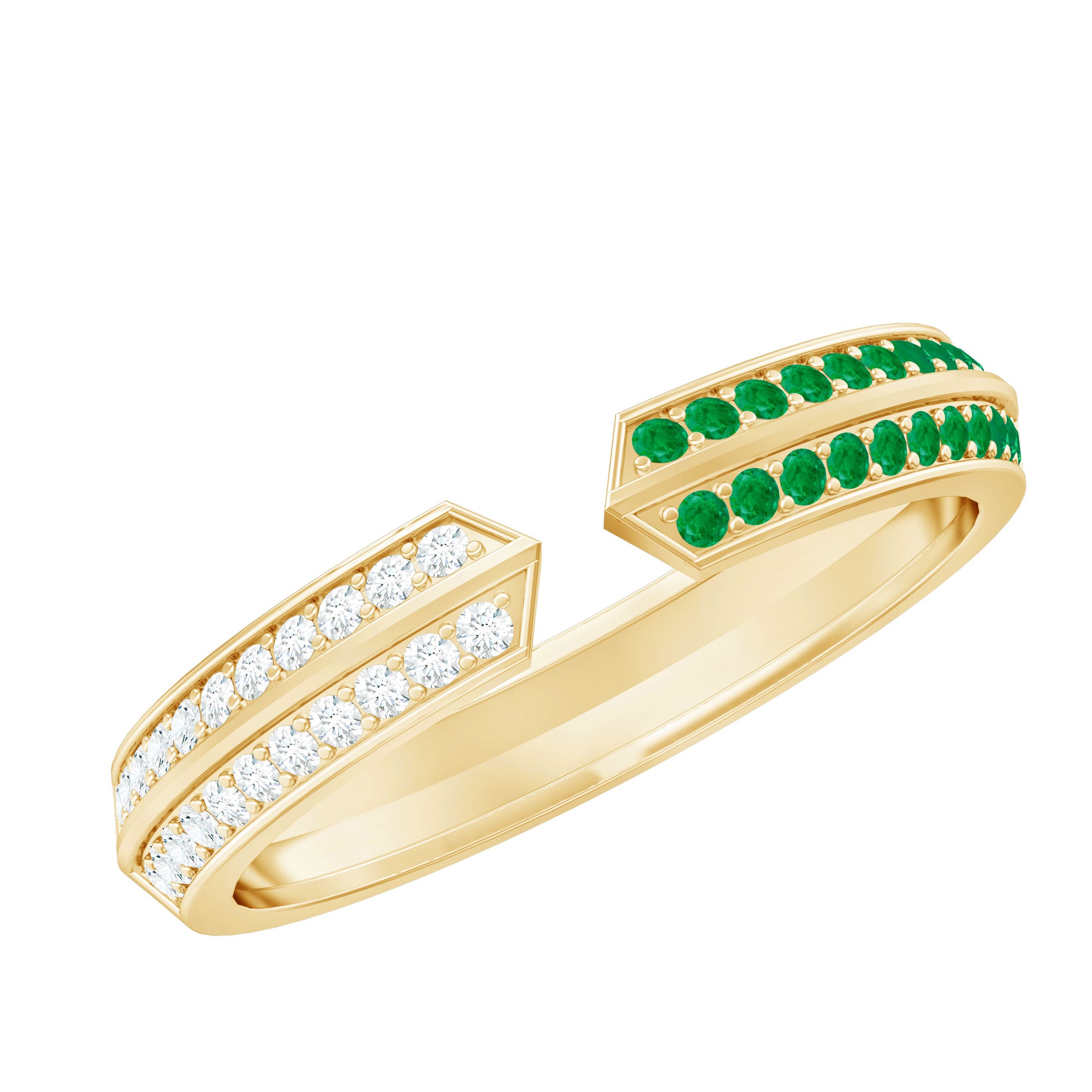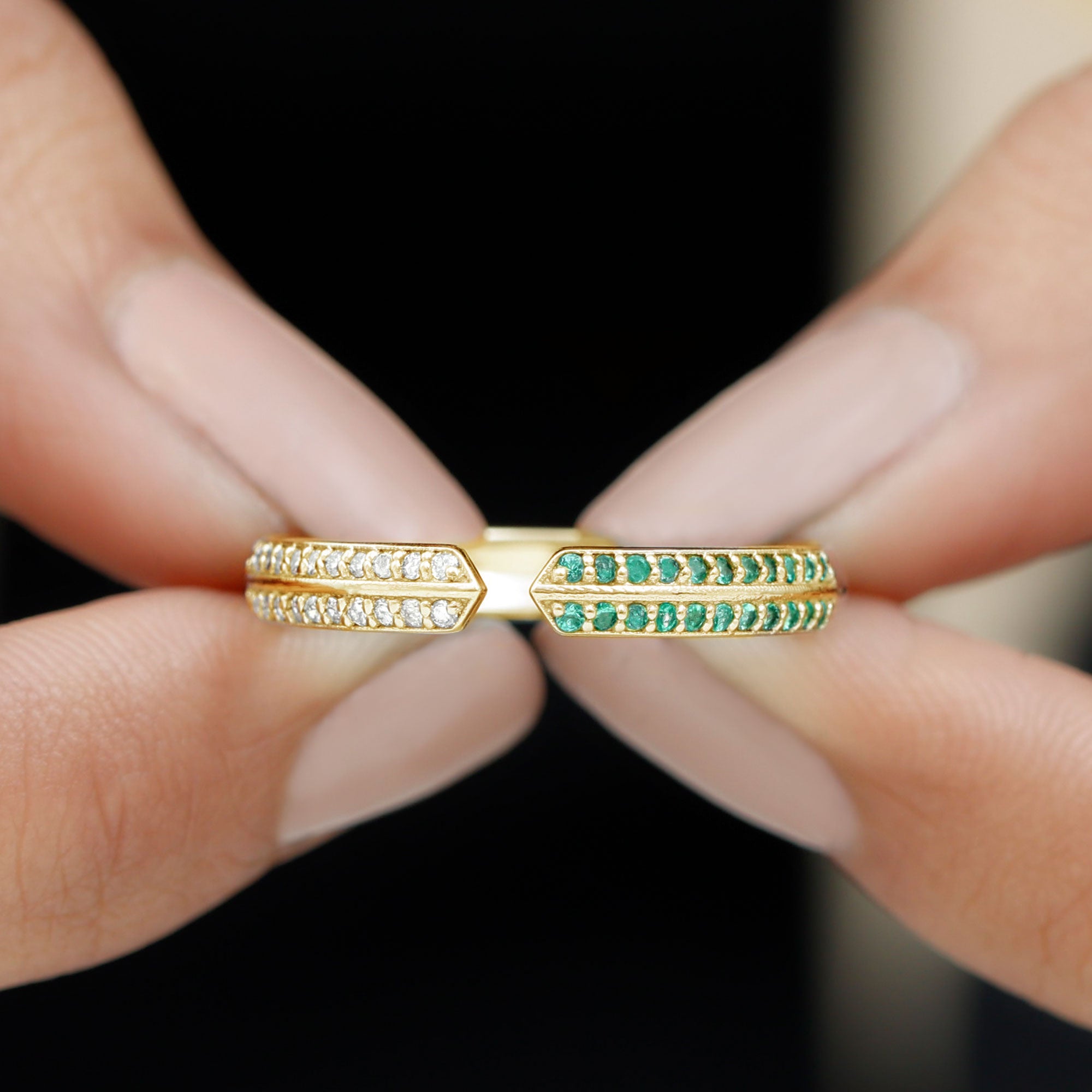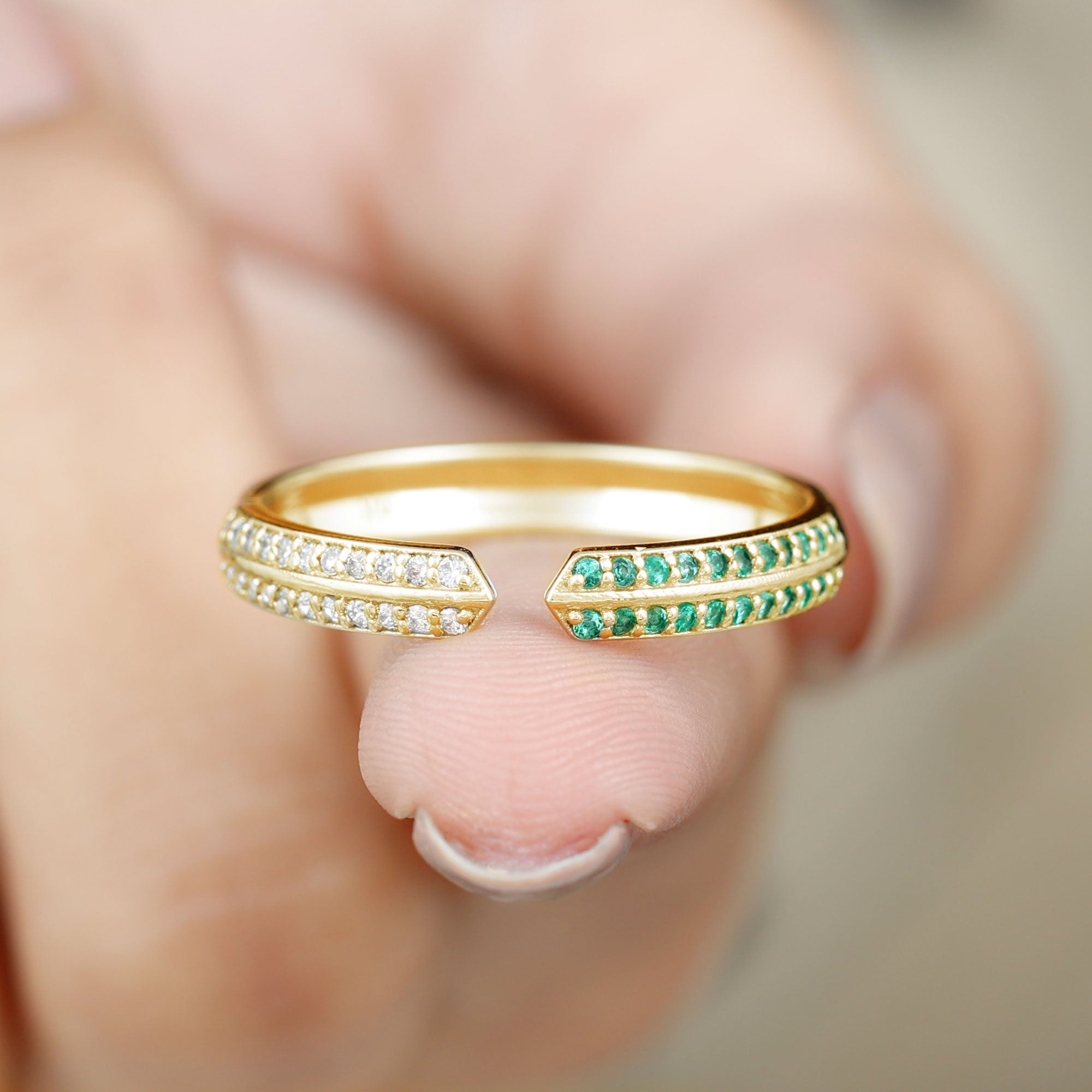 This Emerald Cuff Ring is a beautiful piece that celebrates individuality and modern style. Made with an open-ended design, it features two rows of sparkling round emeralds on one side and two rows of shining moissanite stones on the other. Each stone is carefully set in a secure pave setting, giving the Wrap Ring a bright and elegant look. At both ends of the cuff, arrow-shaped tips point toward each other, adding a bold and stylish touch that makes the design stand out. Perfect for any occasion, this Emerald and Moissanite Ring makes a meaningful gift for an anniversary, wedding, or special celebration. Its sleek design allows it to be worn alone for a simple and elegant look or stacked with other rings for a unique, layered style. The open design also makes it comfortable to wear and easy to adjust for the perfect fit. Crafted with care and attention to detail, this Open Wedding Band comes with a certificate of authenticity and is beautifully packed in a signature jewelry box, ready for gifting or safekeeping. You can also choose your preferred metal type and color to match your personal taste. Available in US sizes 3 to 13, this Emerald Ring Enhancer is a lovely blend of elegance, meaning, and style.