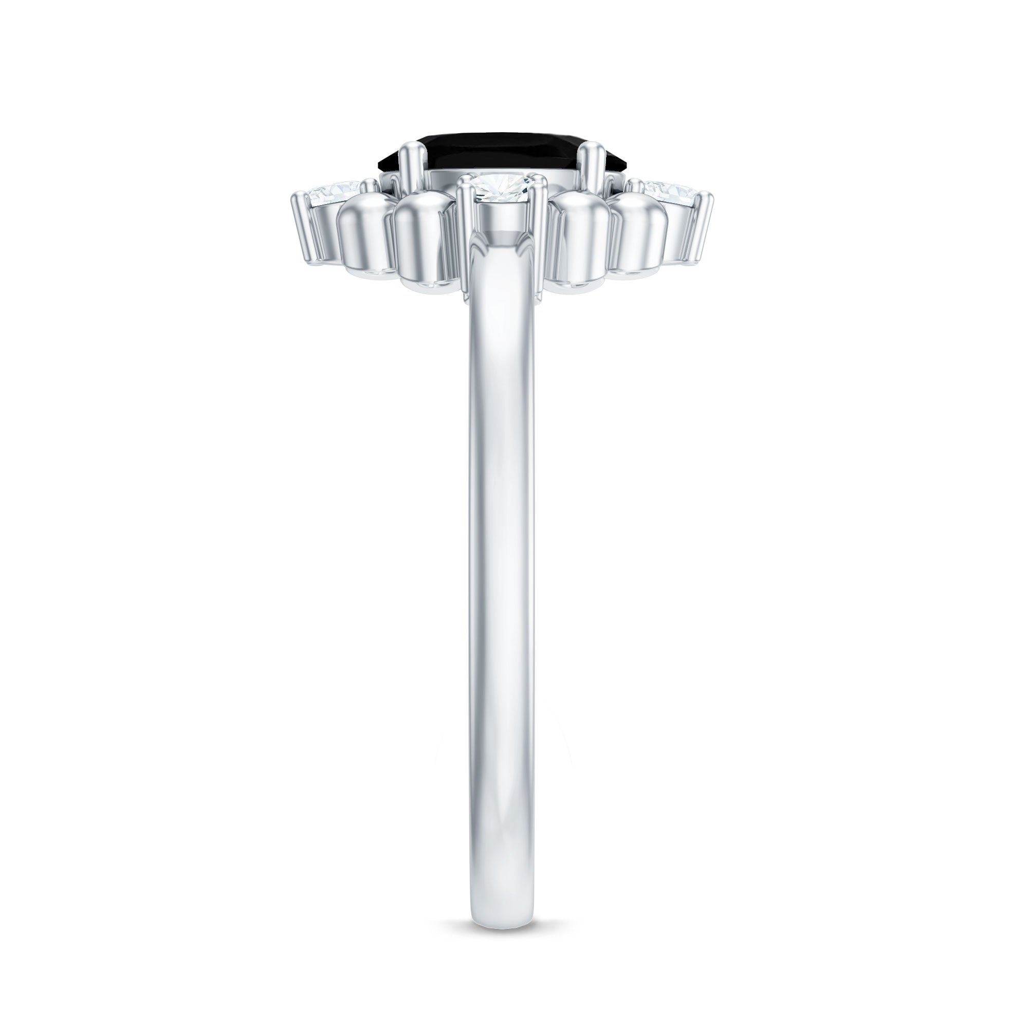 A perfect ring is a more precise ways to express emotions to your better half. This beautiful engagement ring will make her feel on cloud nine, the Created Black Diamond Ring effortlessly draws your attention. This ring is embellished with Oval Created Black Diamond with Round Shape Diamond Accent and gold beaded detail, creating a glistening appeal. This Created Black Diamond Ring is excellent choice for Cocktail Engagement jewelry.