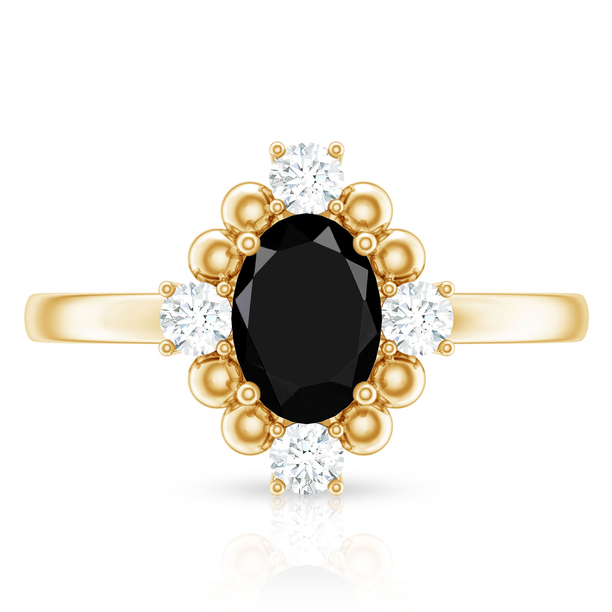A perfect ring is a more precise ways to express emotions to your better half. This beautiful engagement ring will make her feel on cloud nine, the Created Black Diamond Ring effortlessly draws your attention. This ring is embellished with Oval Created Black Diamond with Round Shape Diamond Accent and gold beaded detail, creating a glistening appeal. This Created Black Diamond Ring is excellent choice for Cocktail Engagement jewelry.