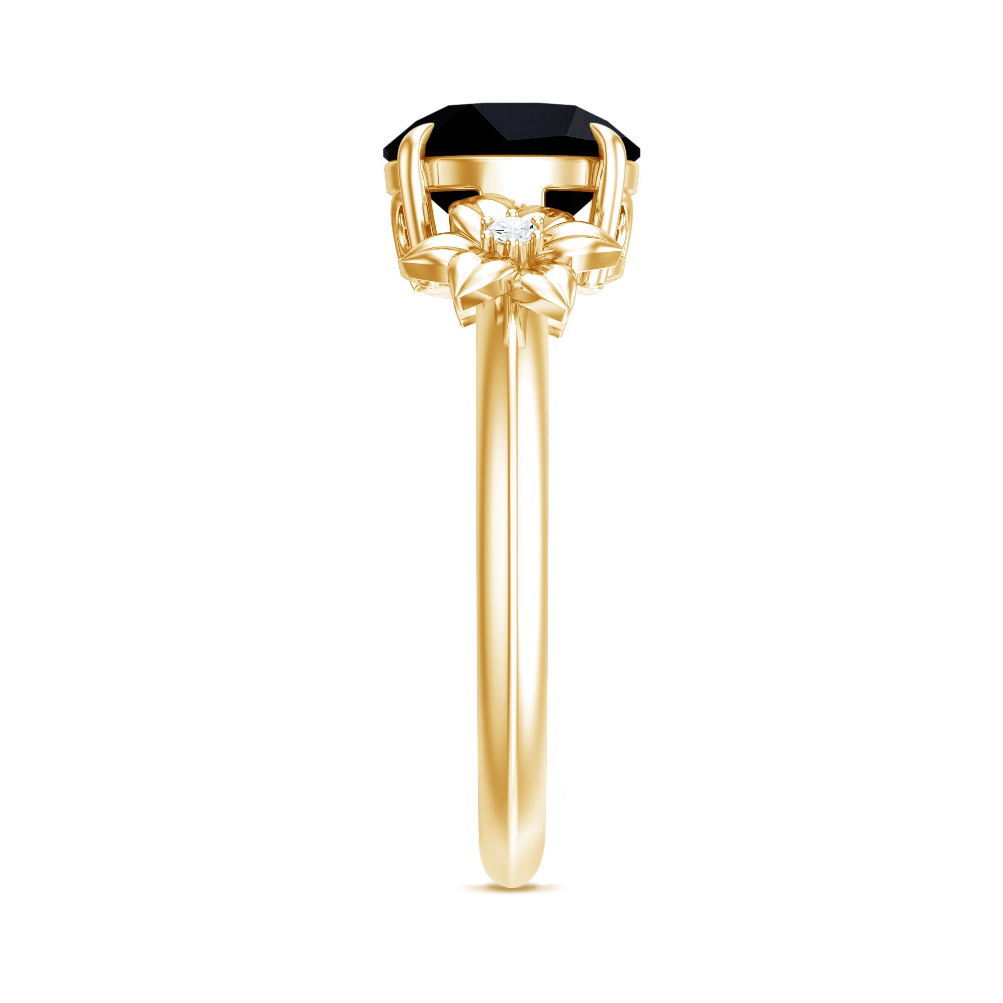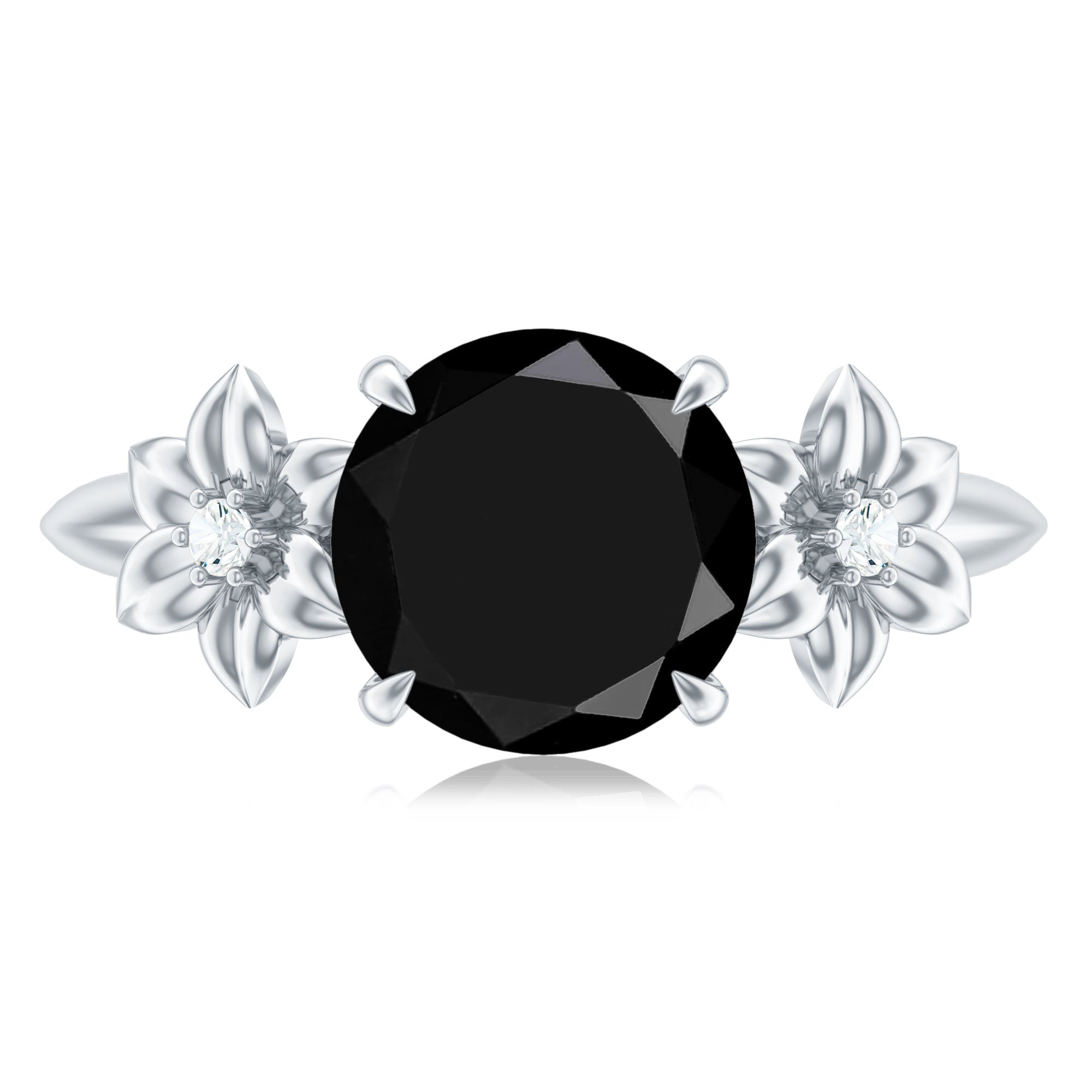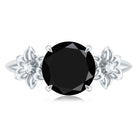 This exquisite floral engagement ring features a magnificent 8 MM round-cut Created Black Diamond, beautifully set in a claw setting. The solitaire stone has sparkling round-cut Diamond stones in a six-prong setting on both sides, which adds a dazzling touch of elegance to the ring. This stunning piece of jewelry serves as a reminder of the love you share with your significant other and is sure to capture their heart. Whether its a special occasion or just because this solitaire ring is the perfect way to express your love and commitment.