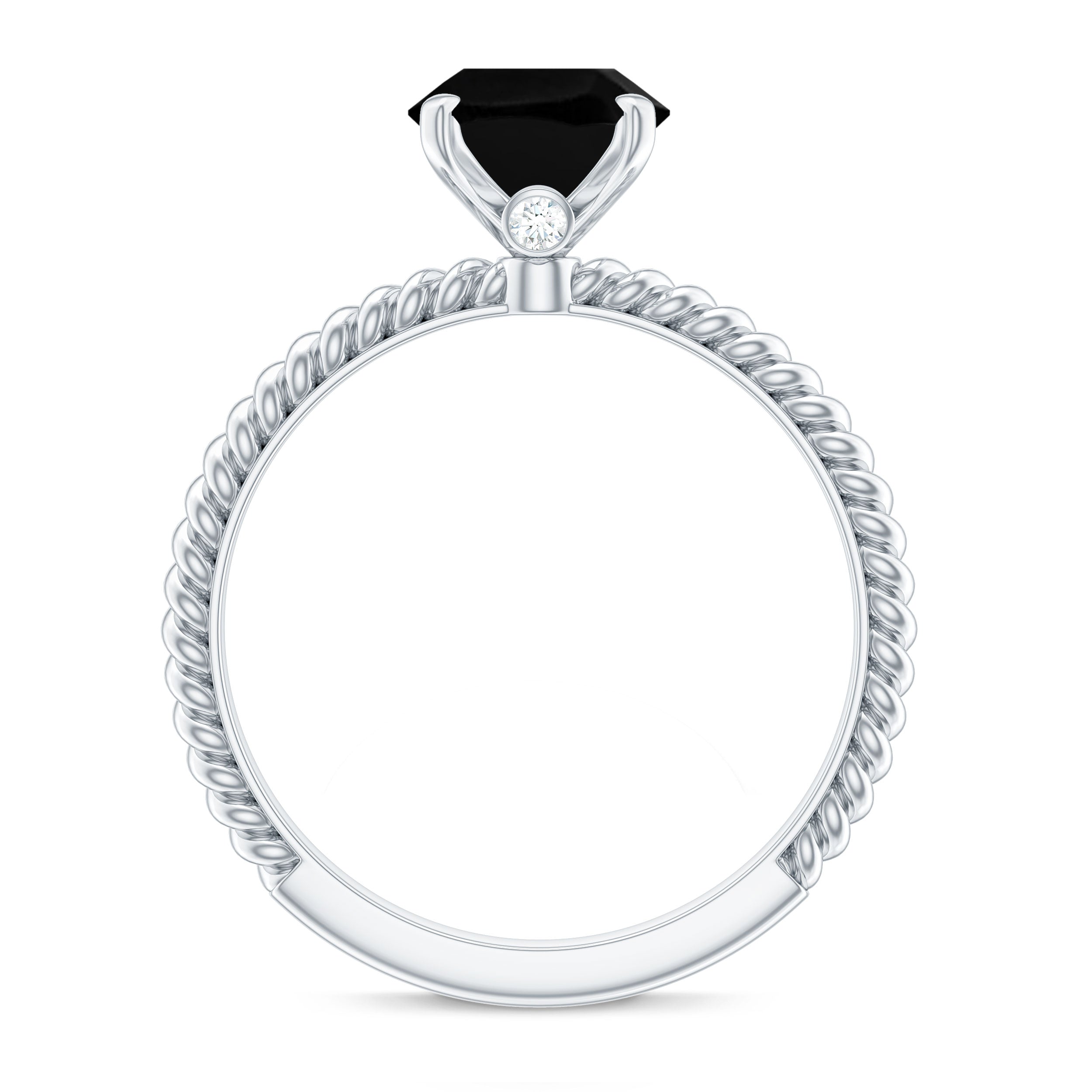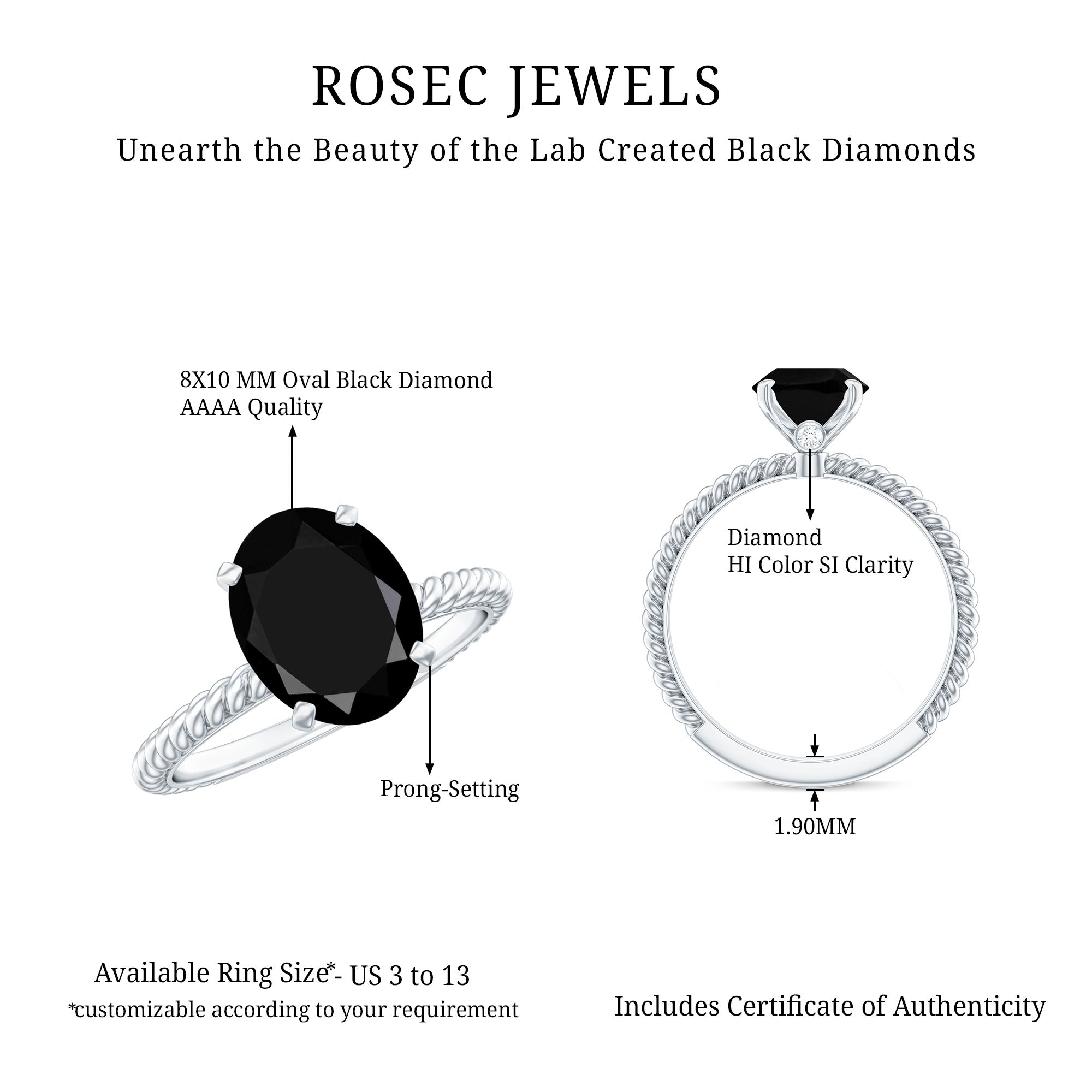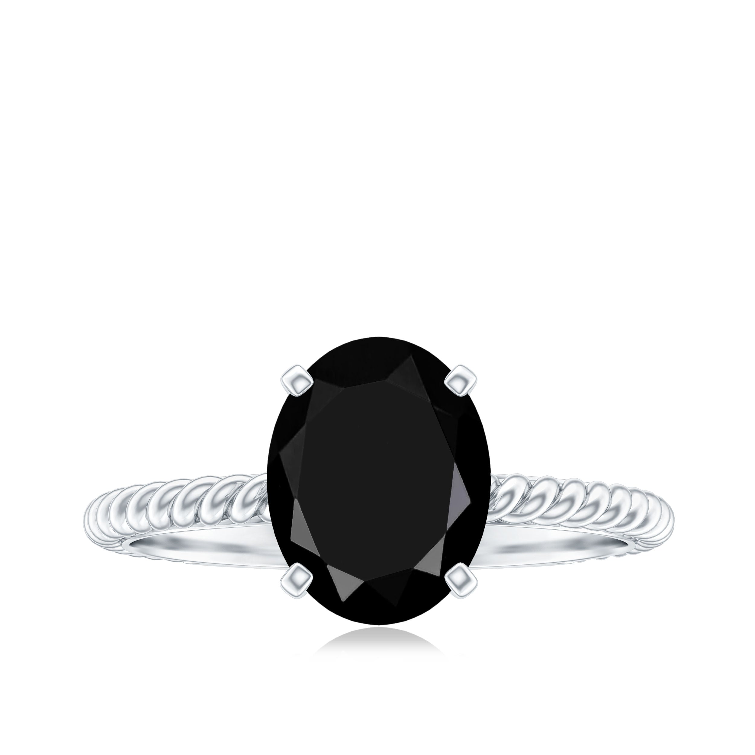 Embrace the enchanting beauty of this Solitaire Ring adorned with a captivating oval created black diamond. The twisted rope shank gracefully embraces the centerpiece, while Surprise Diamond adds a touch of dazzling brilliance. With its exquisite design, this ring exudes elegance and allure that is simply irresistible. Let it grace your finger and captivate all with its undeniable charm.