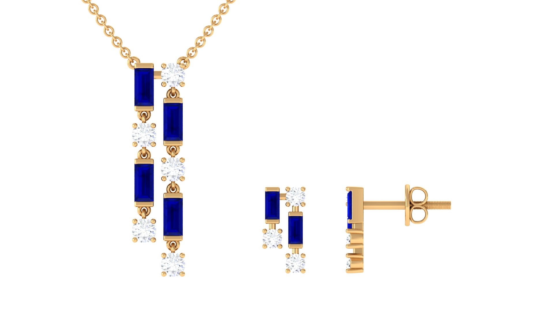 Make a statement with this beautiful Dangle Necklace and Earrings Set, featuring Baguette Cut Created Blue Sapphire in a bar setting and round Diamond stones. The intricate design and exquisite craftsmanship of this jewelry set to create a stunning contrast, making it a standout piece of jewelry. This Created blue sapphire necklace set is perfect for adding a touch of luxury to any outfit or special occasion.