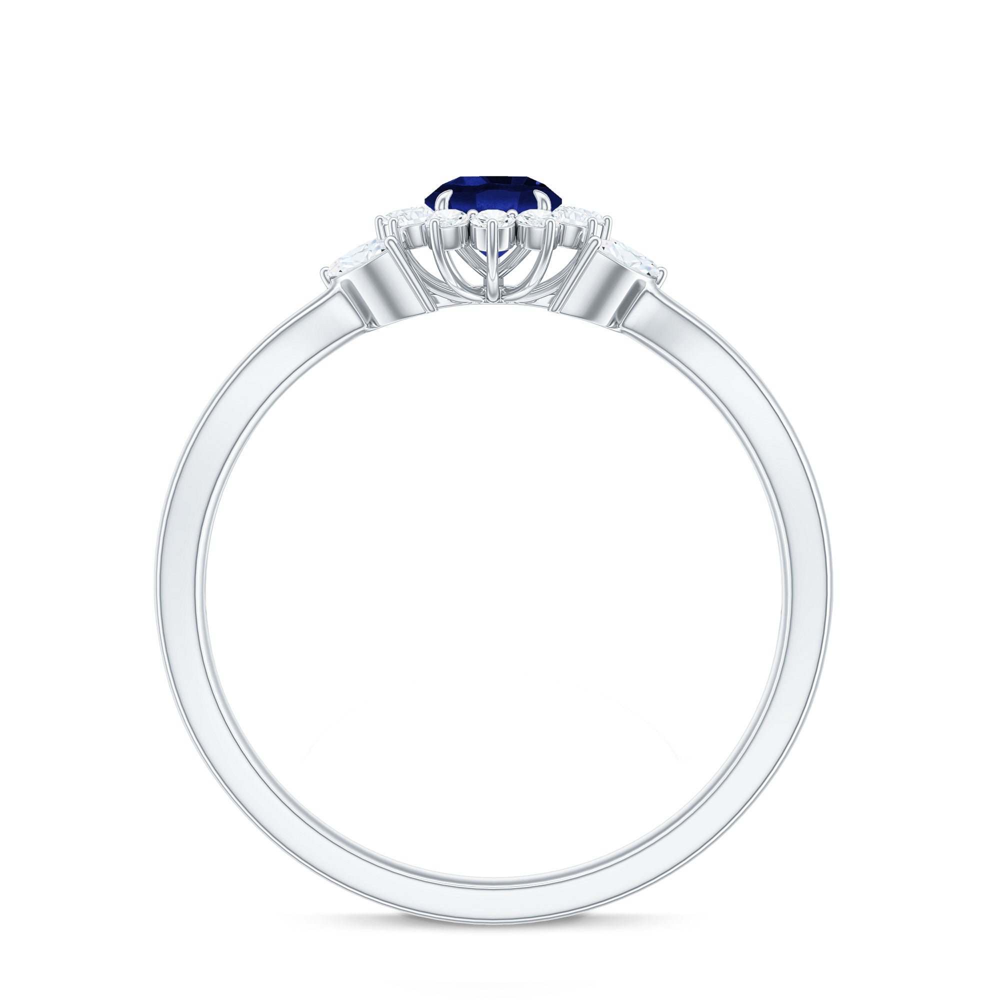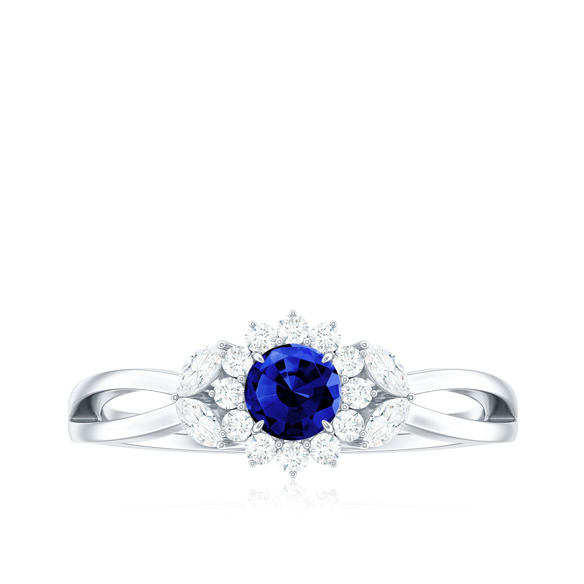 The Floral Ring is featuring a Round Created Blue Sapphire, held in a Claw Setting, and a Halo of Round Diamond along with a Marquise Cut Diamond. This Created Blue Sapphire Engagement Ring is an alluring piece of fine jewelry, it has a split shank to give it a captivating touch.