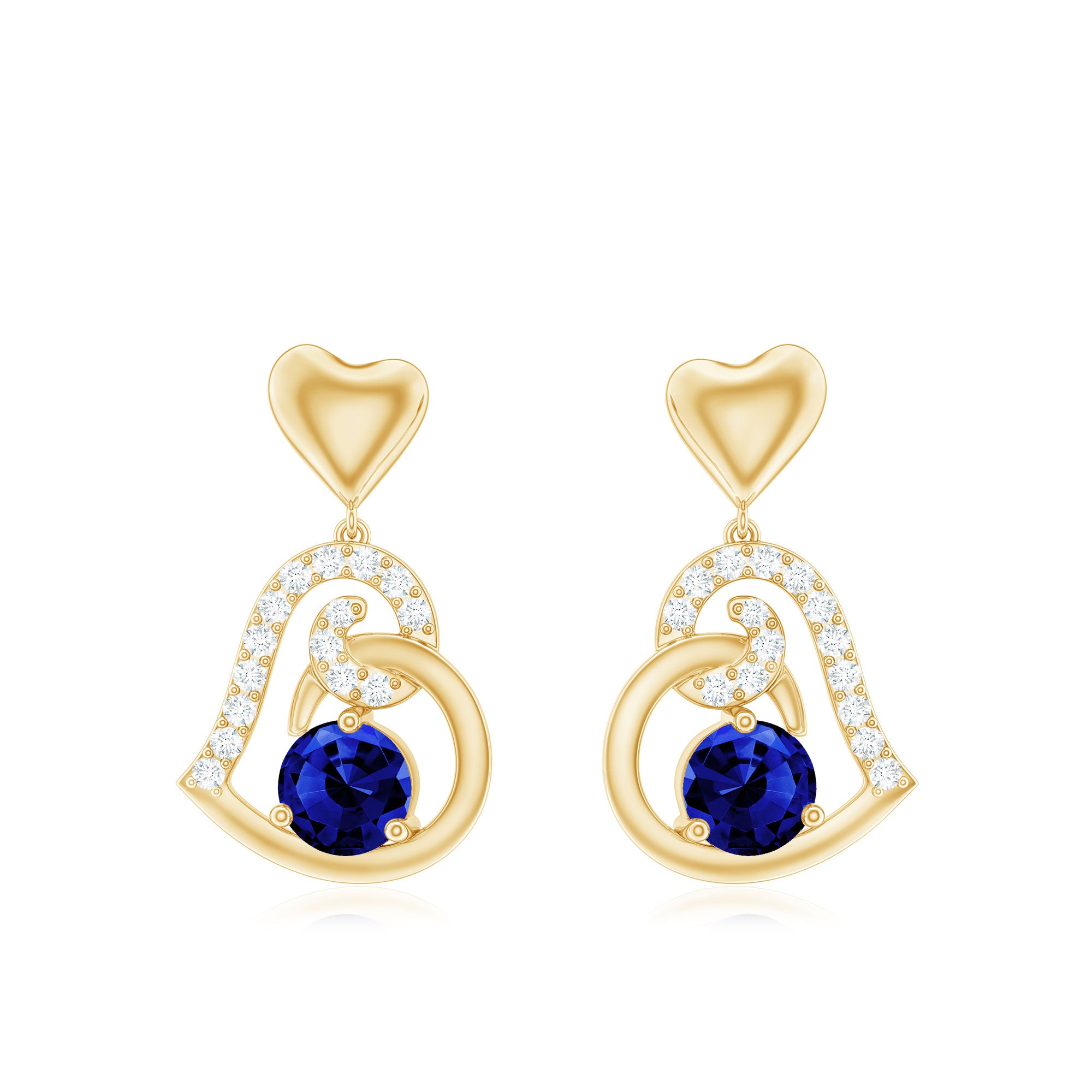 Be Dazzle with these beautiful Heart Drop Earrings. These earrings are embellished with Round Shape Created Blue Sapphire Solitaire, held in 3 Prong Setting and Round Shape Diamond accentuating the half part of the gold heart. These earrings are both cool and classy! So, get your hands on these earrings and adorn yourself with a new accessory.