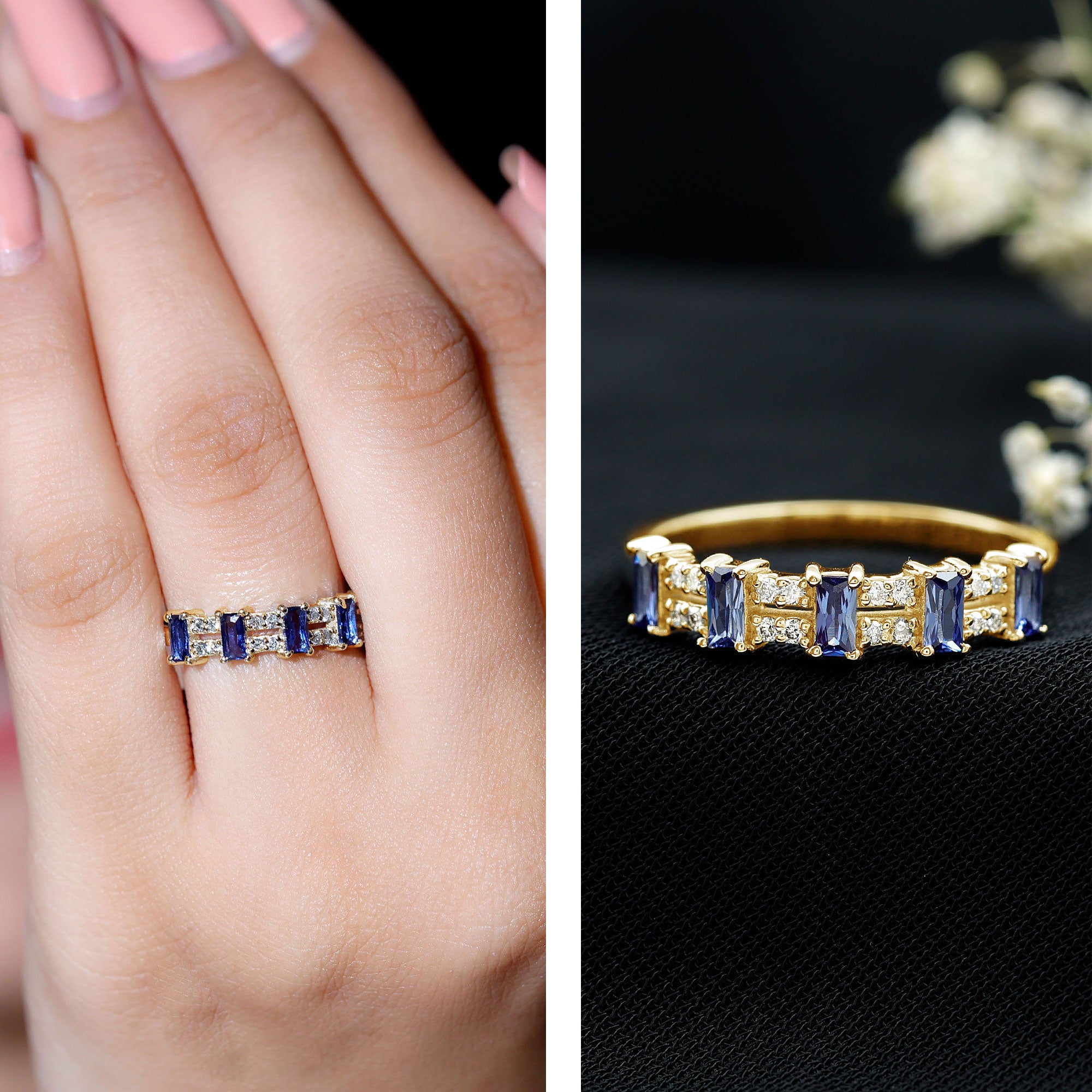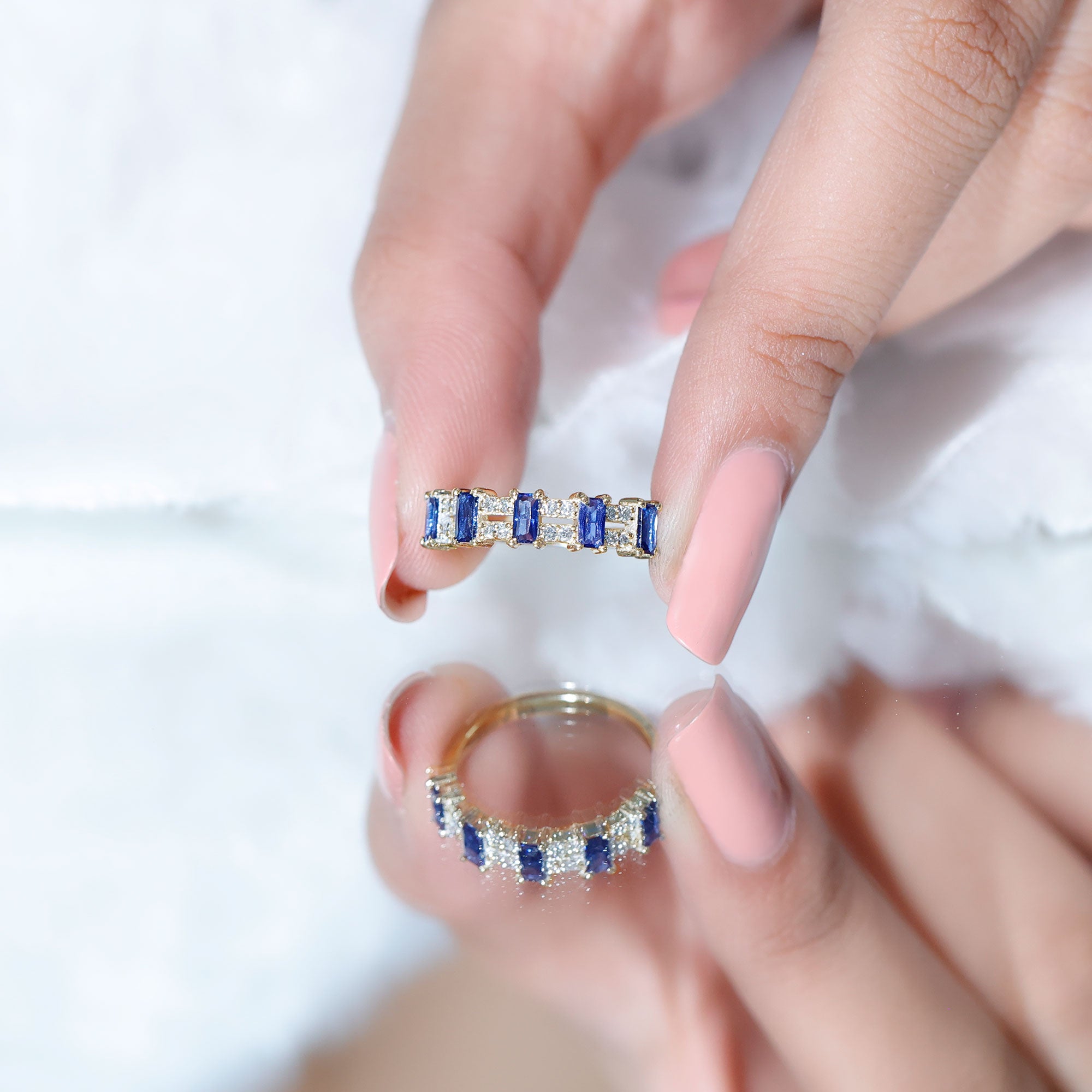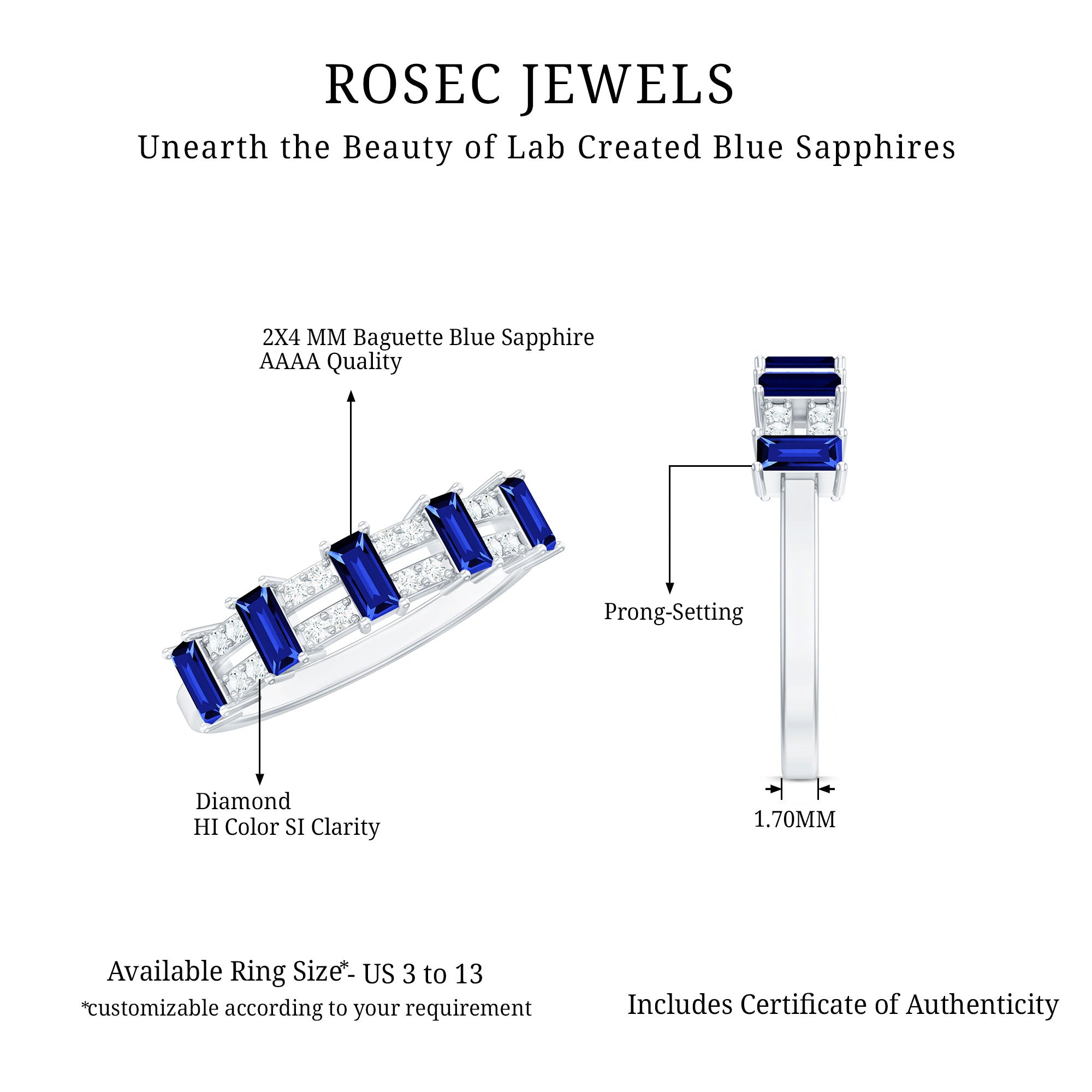 Elevate your style with the opulence of this luxurious Half Eternity Ring, embellished with prong-set baguette-cut lab-created blue sapphires and accented with shimmering Diamond. This exquisite ring exudes charm and elegance, enhancing your overall look. When you present this captivating blue and white gemstone ring to your beloved on your anniversary, her heart will flutter with sheer happiness. The allure of this alluring piece will undoubtedly leave a lasting impression, symbolizing your enduring love and creating a cherished memory on this special occasion.
