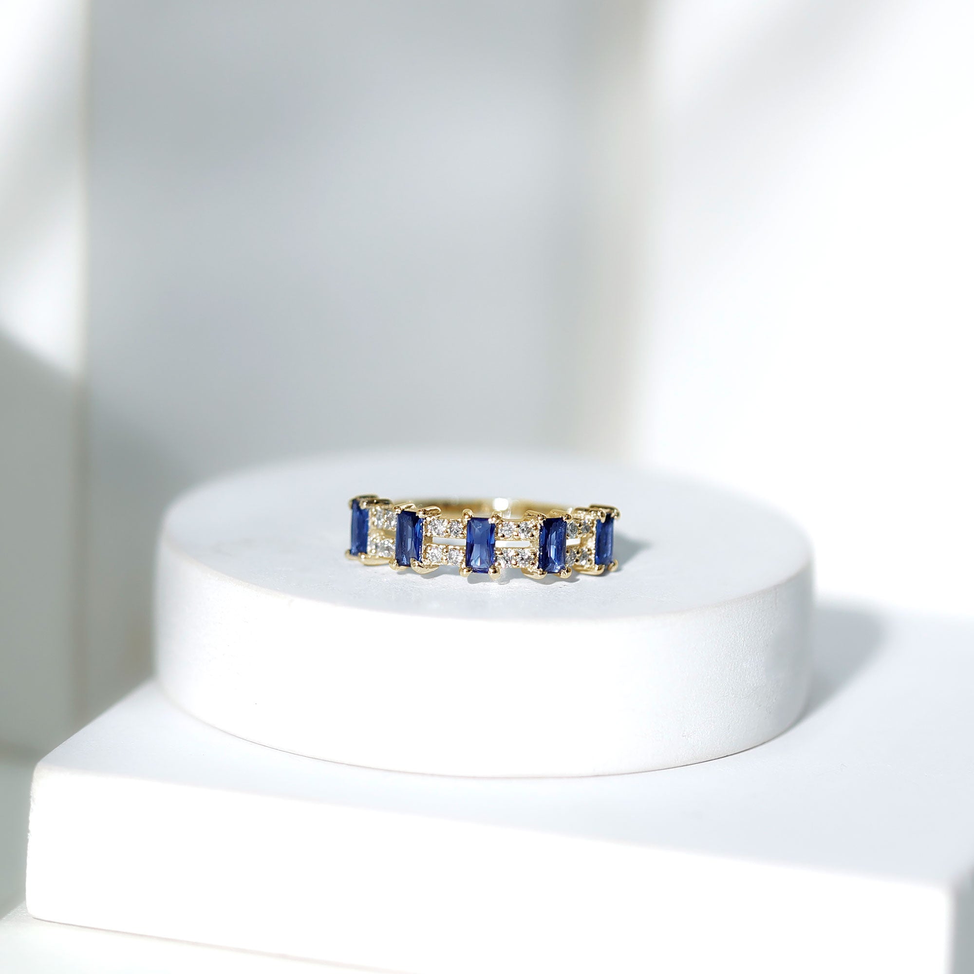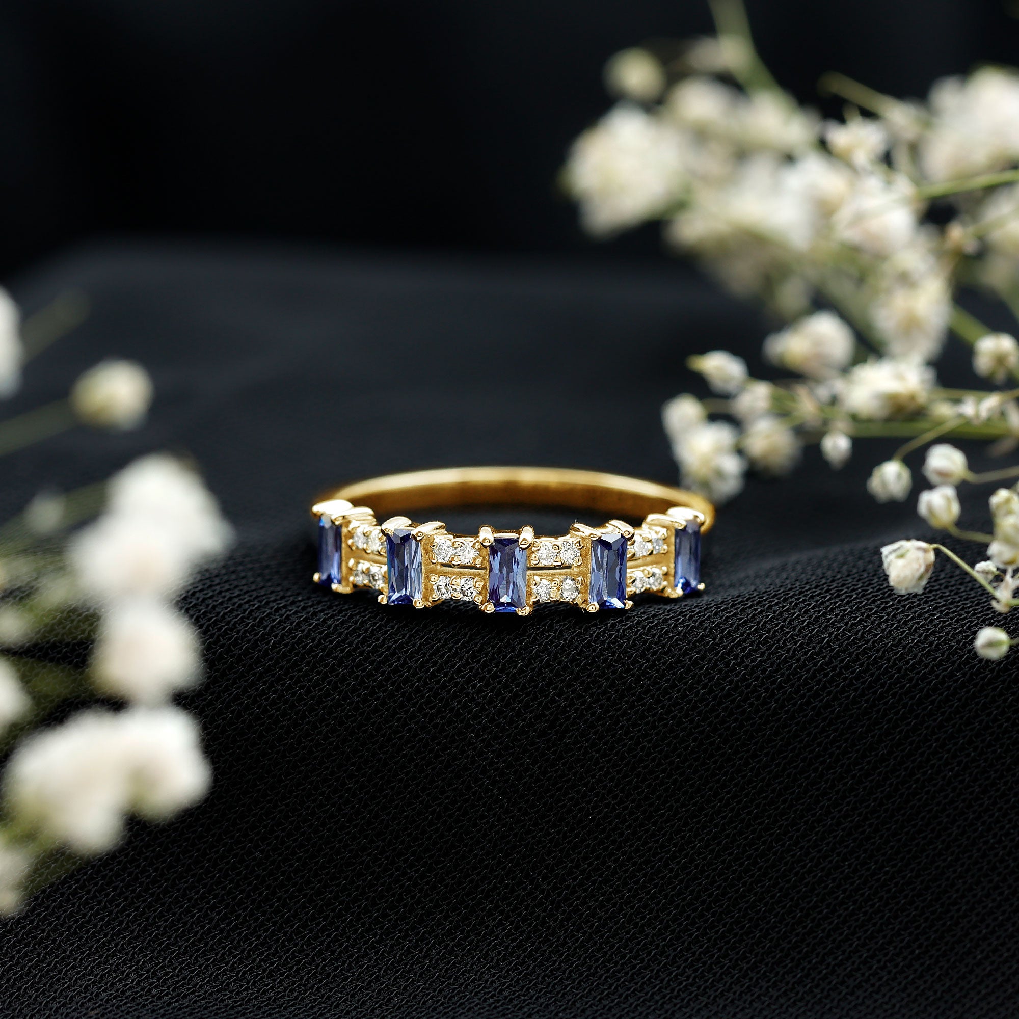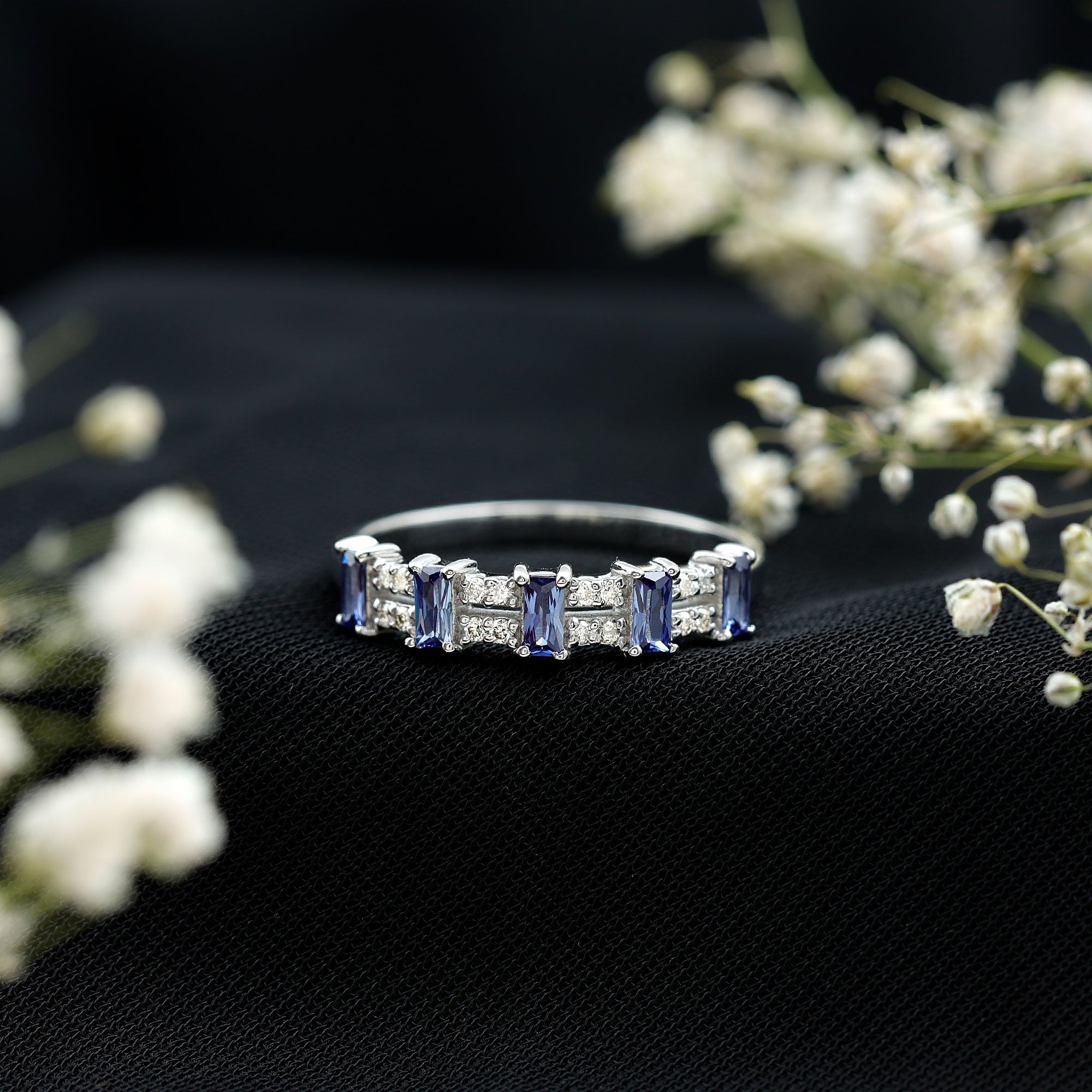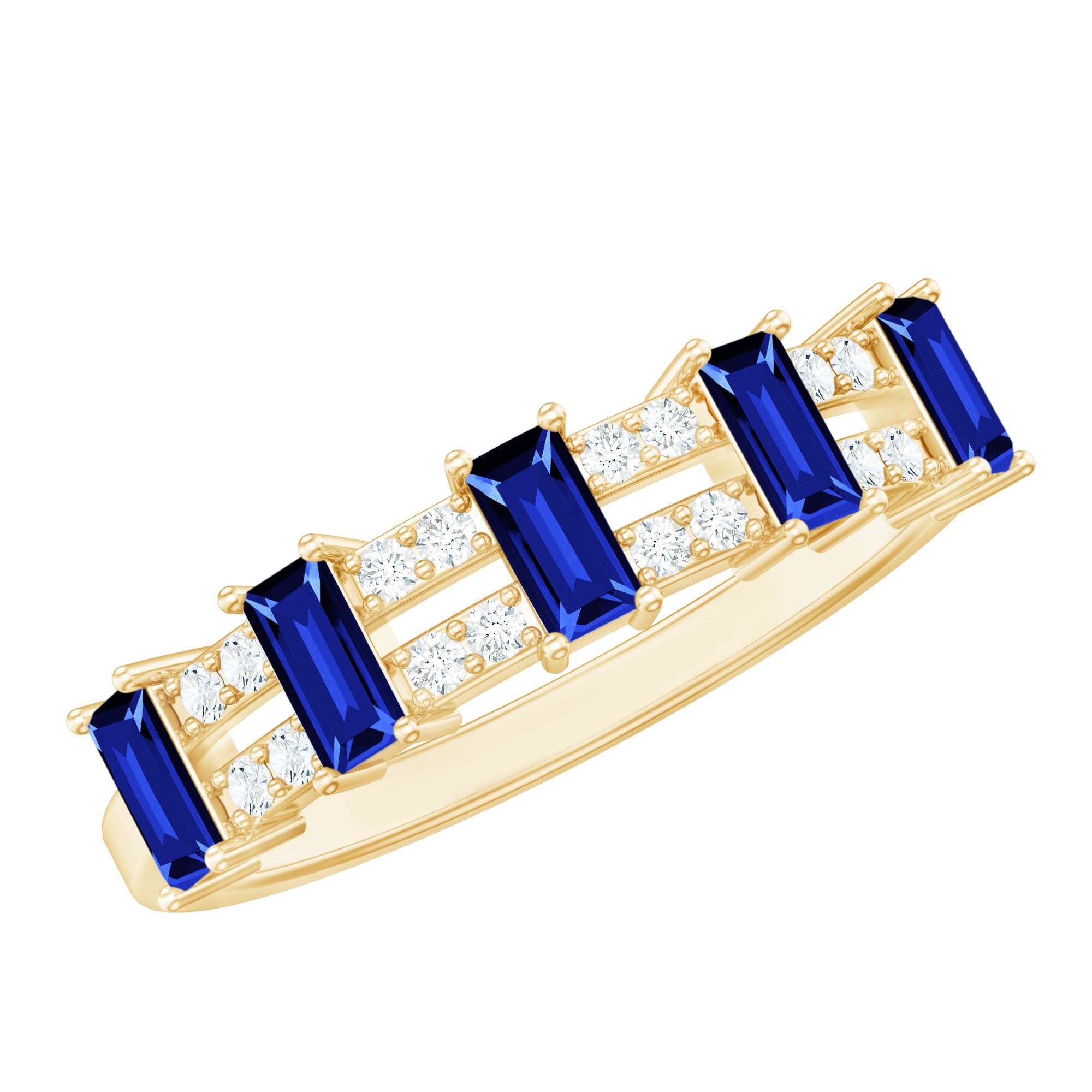 Elevate your style with the opulence of this luxurious Half Eternity Ring, embellished with prong-set baguette-cut lab-created blue sapphires and accented with shimmering Diamond. This exquisite ring exudes charm and elegance, enhancing your overall look. When you present this captivating blue and white gemstone ring to your beloved on your anniversary, her heart will flutter with sheer happiness. The allure of this alluring piece will undoubtedly leave a lasting impression, symbolizing your enduring love and creating a cherished memory on this special occasion.