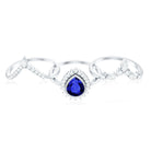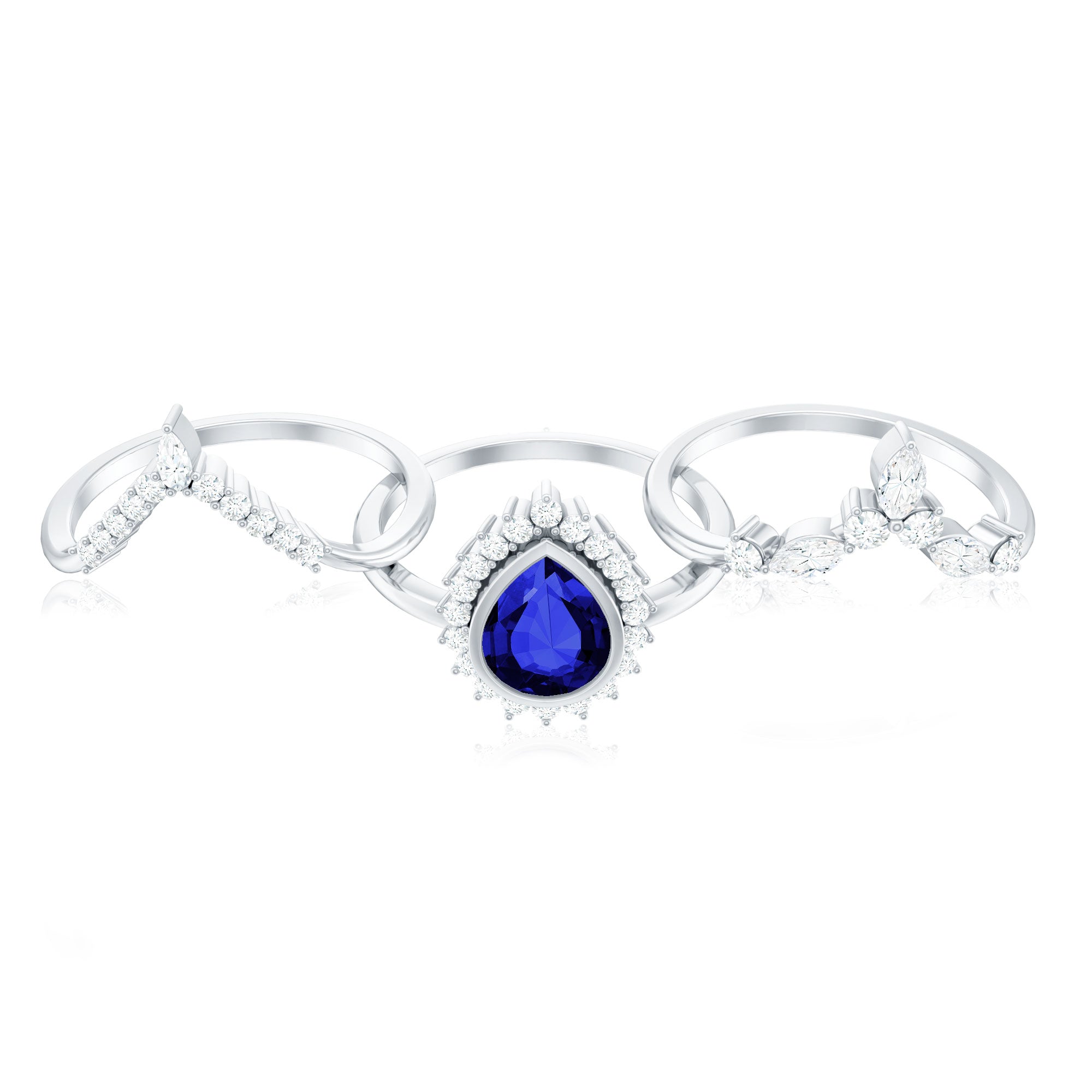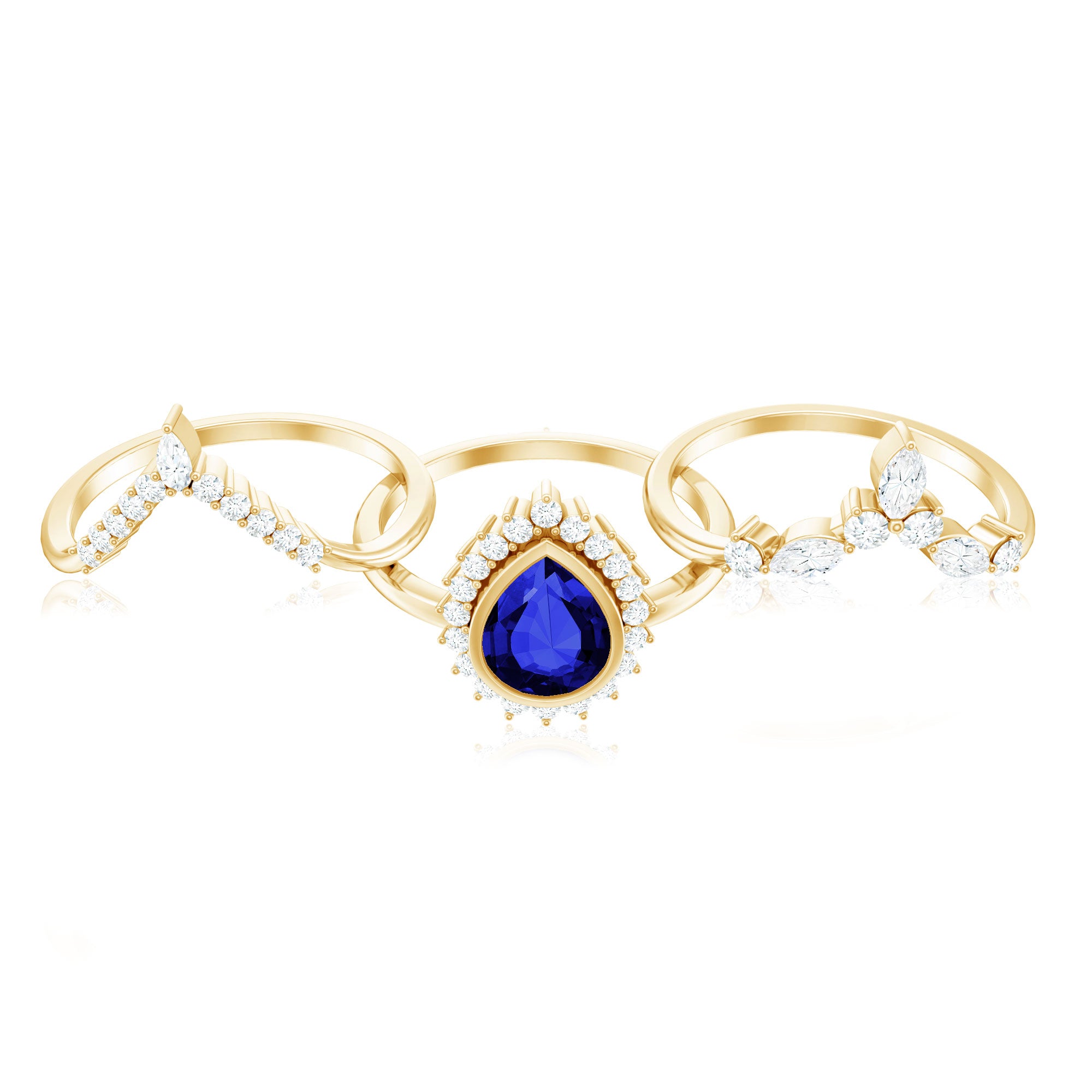 Add a touch of sophistication to your special day with this Art Deco Wedding Ring Set. Crafted from gold, this 3-piece set features a Created Blue Sapphire teardrop ring with Moissanite side stones and a Moissanite enhancer for a luxurious look. Captivate with elegance and charm with this stunning ring set.