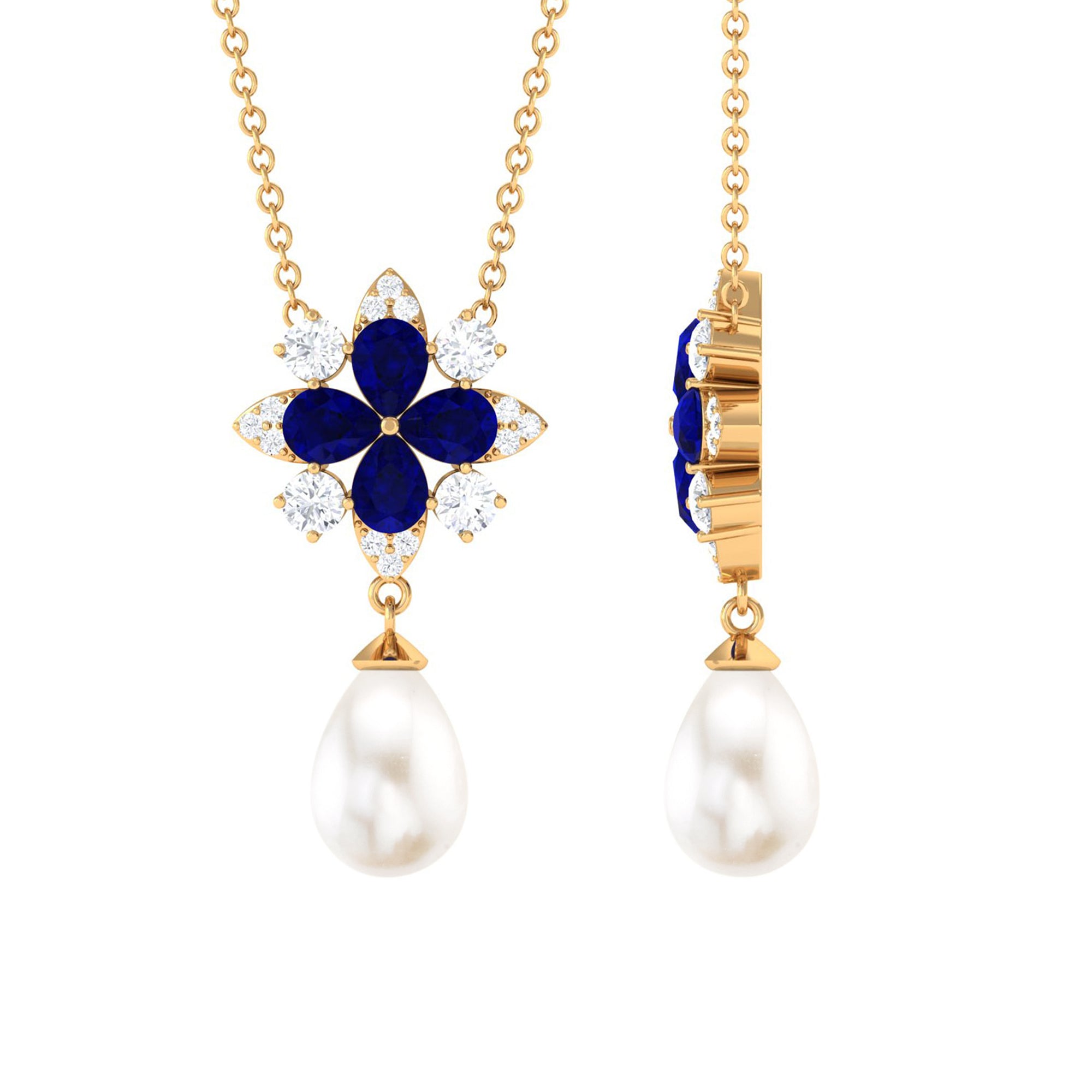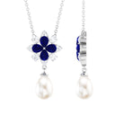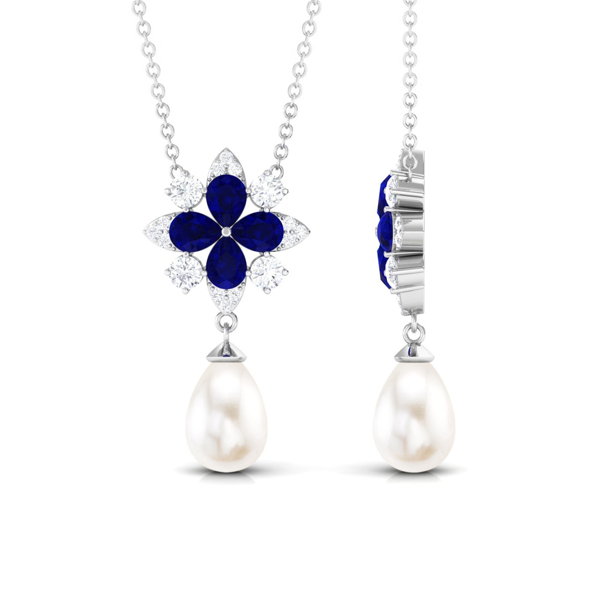 Created Blue Sapphire and Moissanite Flower Necklace with Freshwater Pearl Drop