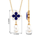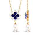 Youll love the Flower Necklace when you add it to your jewelry collection. Showcasing Pear Cut Lab Created Blue Sapphire and Round Moissanites studded on a flower design while a Drop Shape Freshwater Pearl gives it a stunning look. You will look magnificent with its flair of charm thanks to the stunning gleam of this Floral Necklace.
