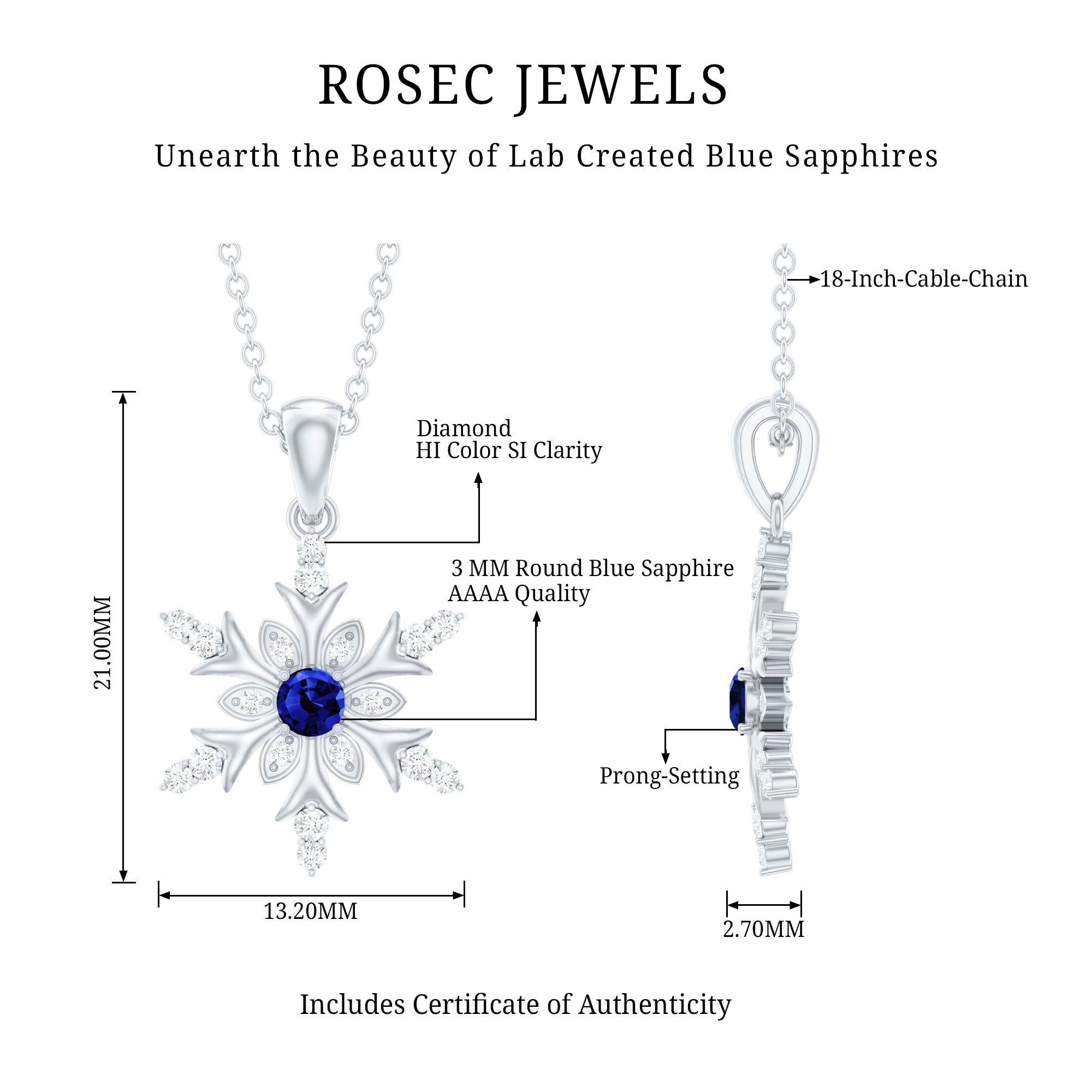 Infuse a festive and glamorous touch into your ensemble with this stunning Snowflake Necklace. Adorned with Round Shape Created Blue Sapphires and sparkling Diamond accents, this necklace exudes a radiant and joyful charm. Let this Snowflake Pendant Necklace be the perfect accessory to celebrate special occasions or add a touch of sparkle to your everyday style. Embrace the enchanting allure of this necklace and embrace the spirit of celebration and beauty.