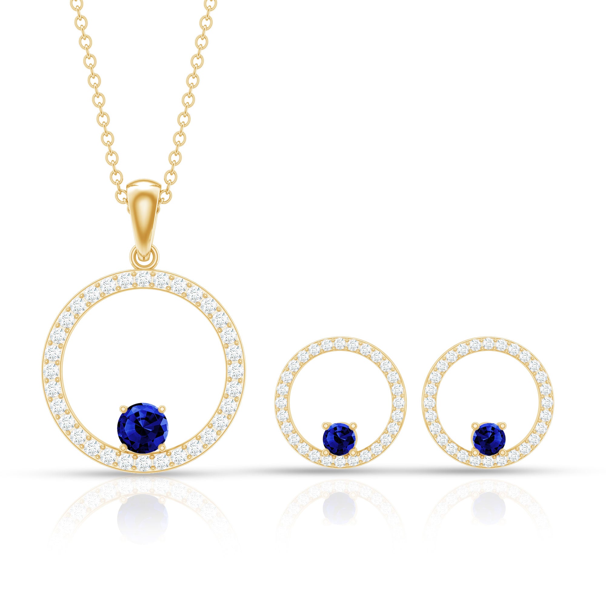 Illuminate your style with our Blue Sapphire Jewelry Set, a delicate piece for you. Features round created blue sapphire and moissanite exuding timeless elegance and eternal sparkle. The jewelry set has a stunning eternity pendant and stud earrings that match your style and preferences. Crafted with secured closures which keep them safe and provide a snug fit all day long. Whether its your birthday eve or going for a dinner date flaunt this blue sapphire jewelry every time you get dressed up and make everyone fall for you.