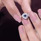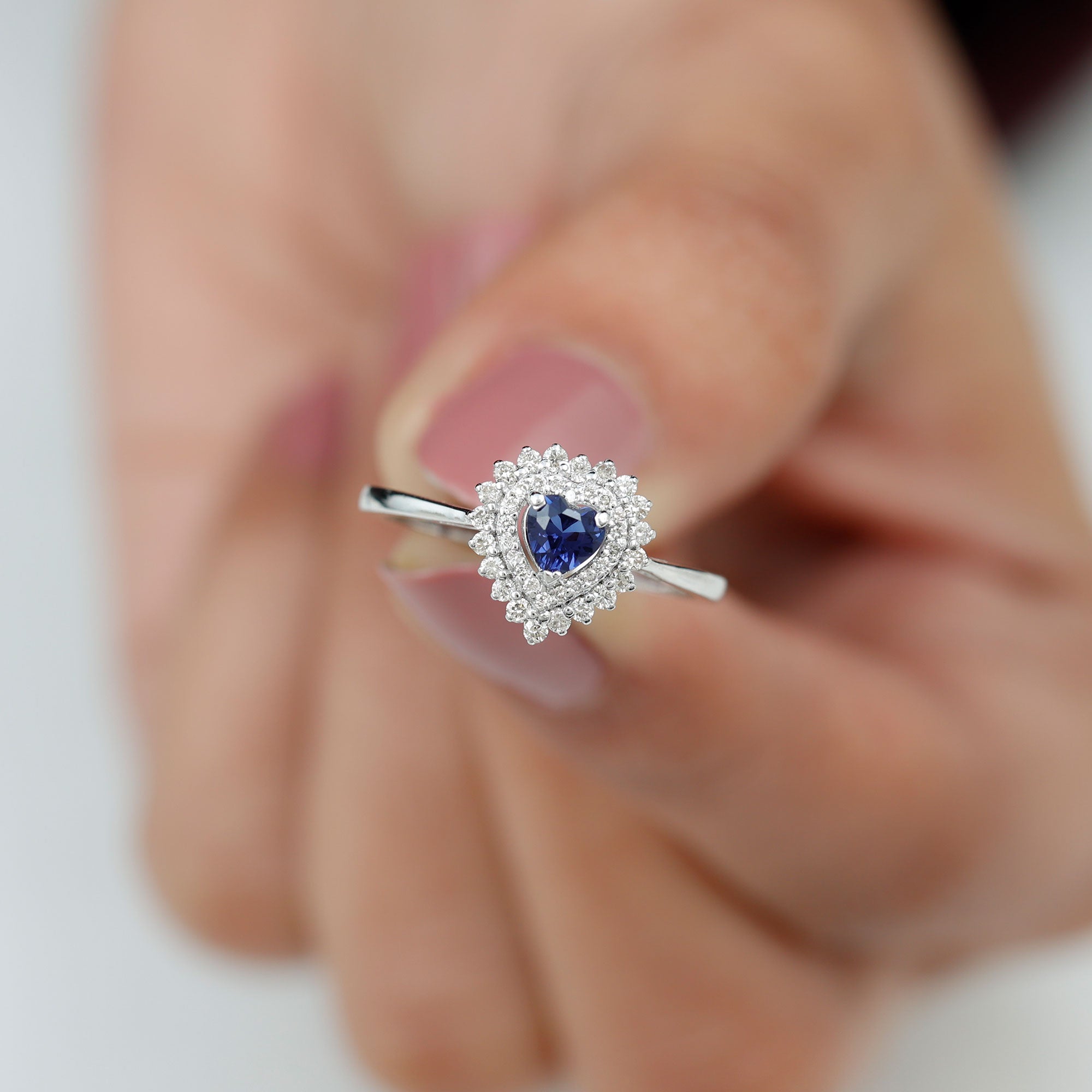 Indulge her with a feeling of being on top of the sky with this stunning Heart Shape Lab Created Blue Sapphire Ring. Adorned with a captivating Heart Shape Created Blue Sapphire, and encircled by a Diamond Double Halo, this statement piece crafted in various metal types, is an essential addition to any jewelry collection.