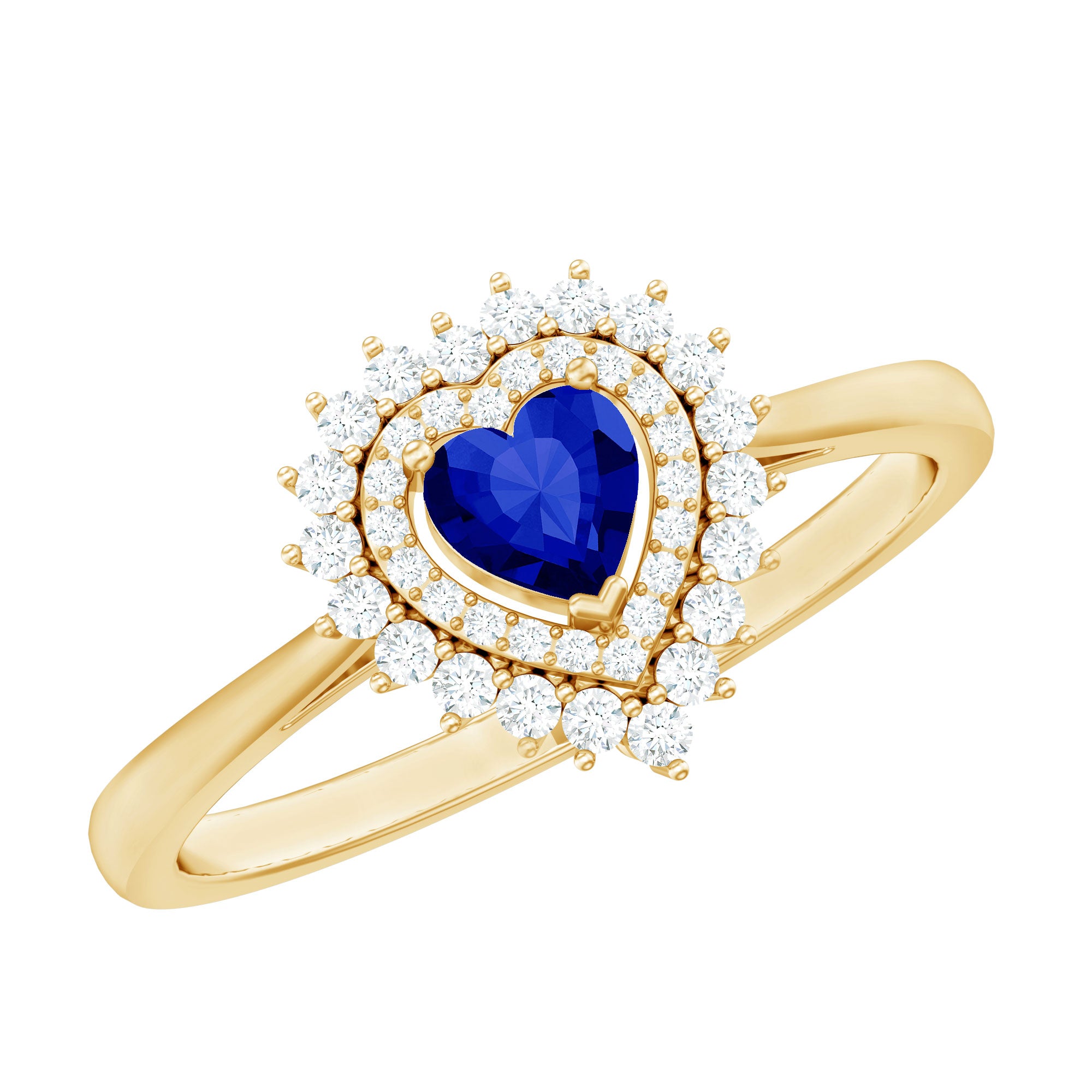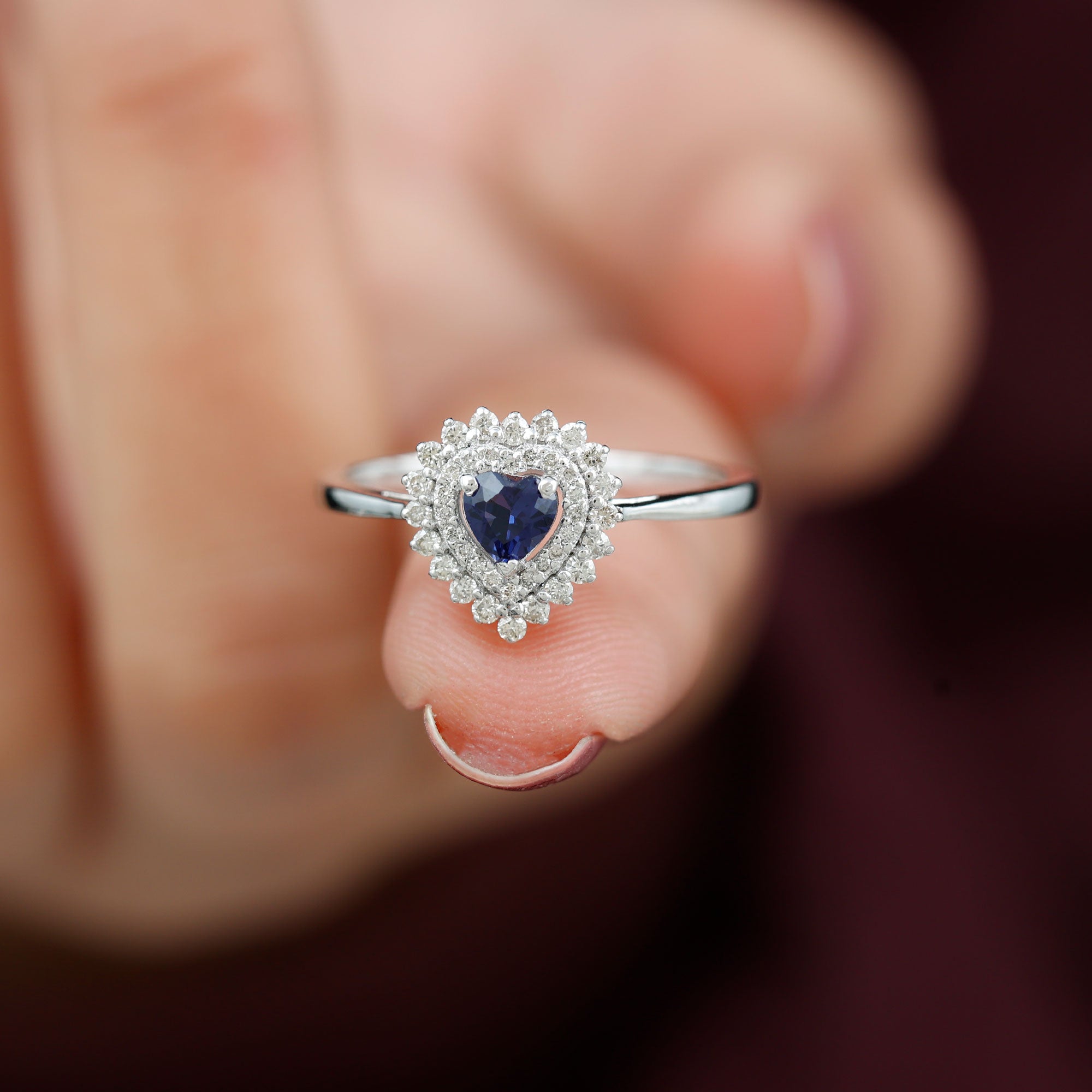 Created Blue Sapphire Heart Engagement Ring with Diamond Double Halo