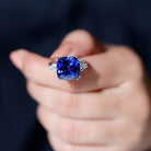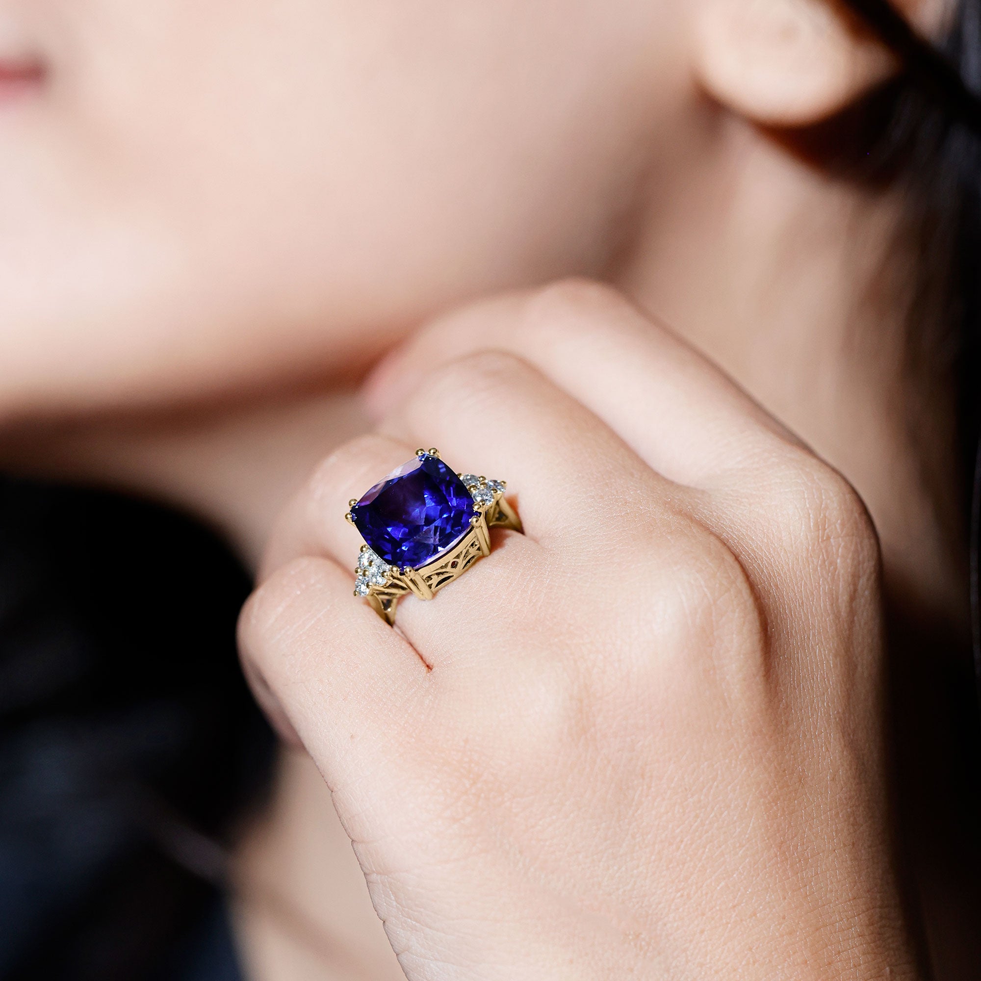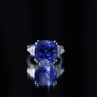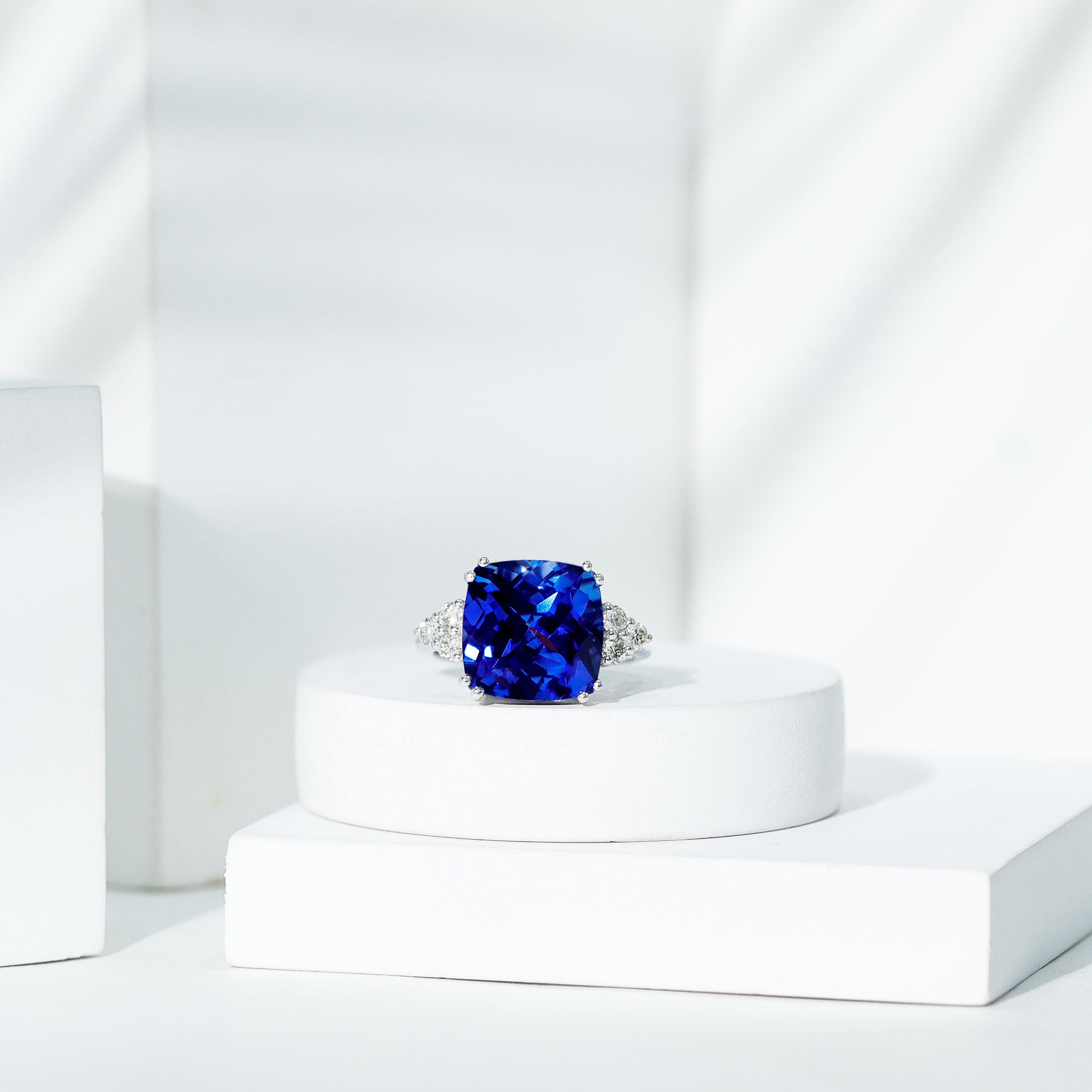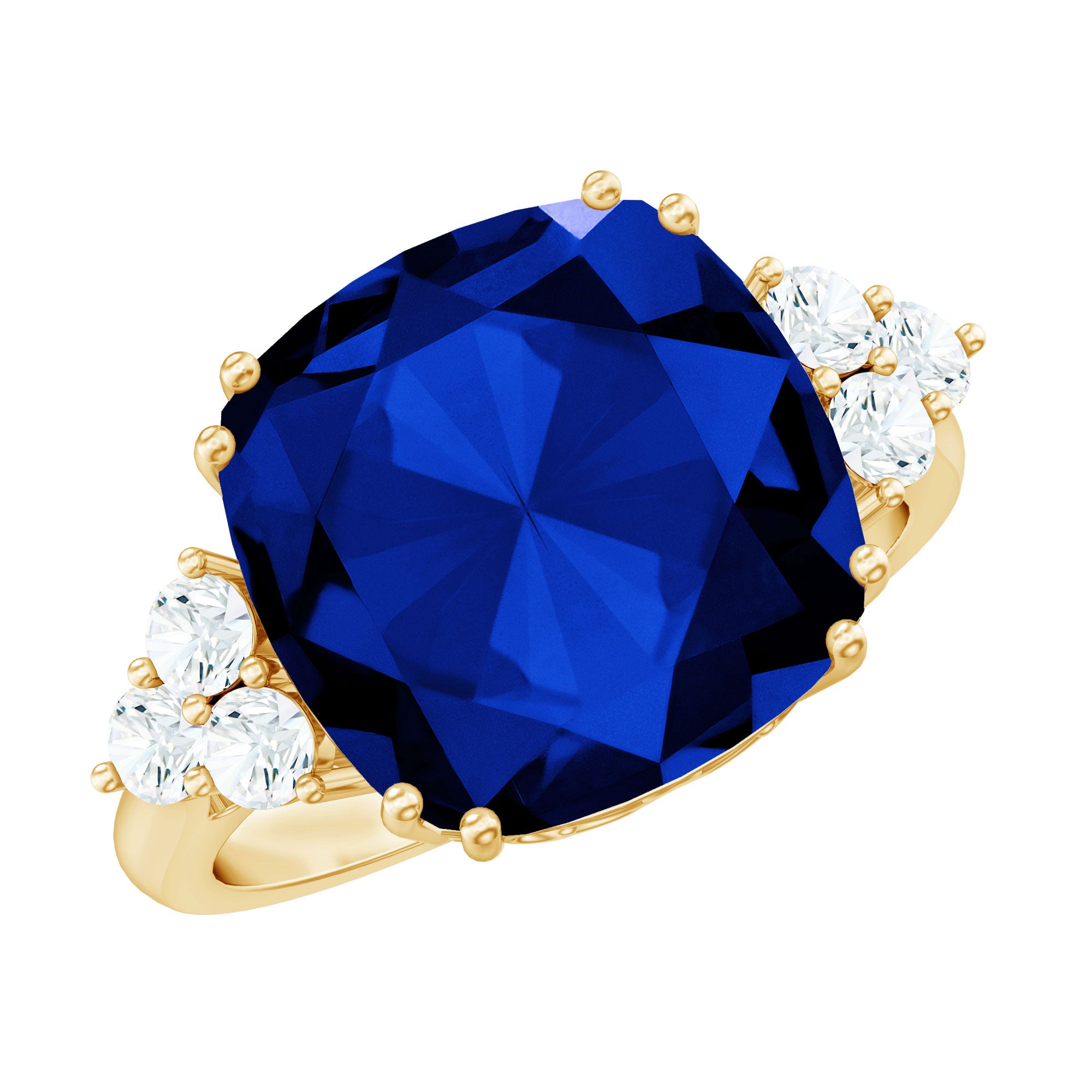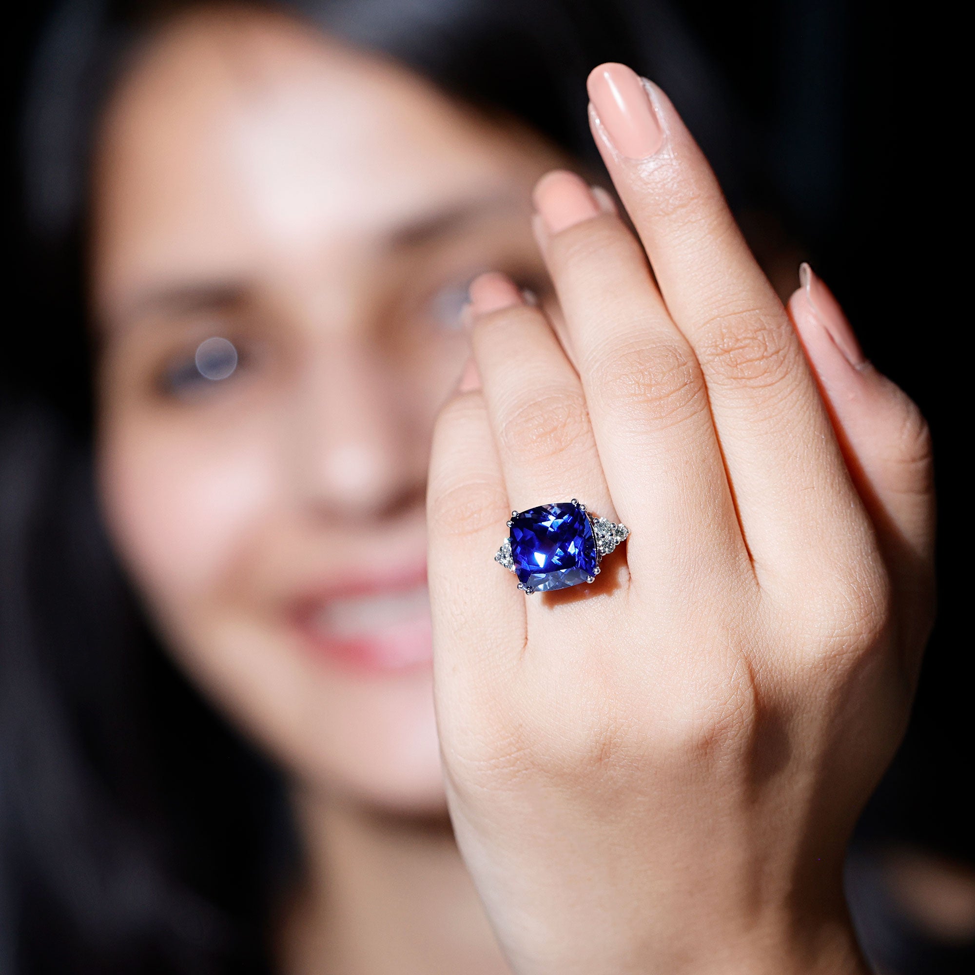 As special as your beloved, this Solitaire Engagement Ring is embellished with Cushion Cut Lab Created Blue Sapphire secured in Prong Setting, while Round Diamond Trio studded on either side. Create a romantic moment by presenting this Created Blue Sapphire Ring on her special day and make her dance with happiness.