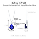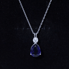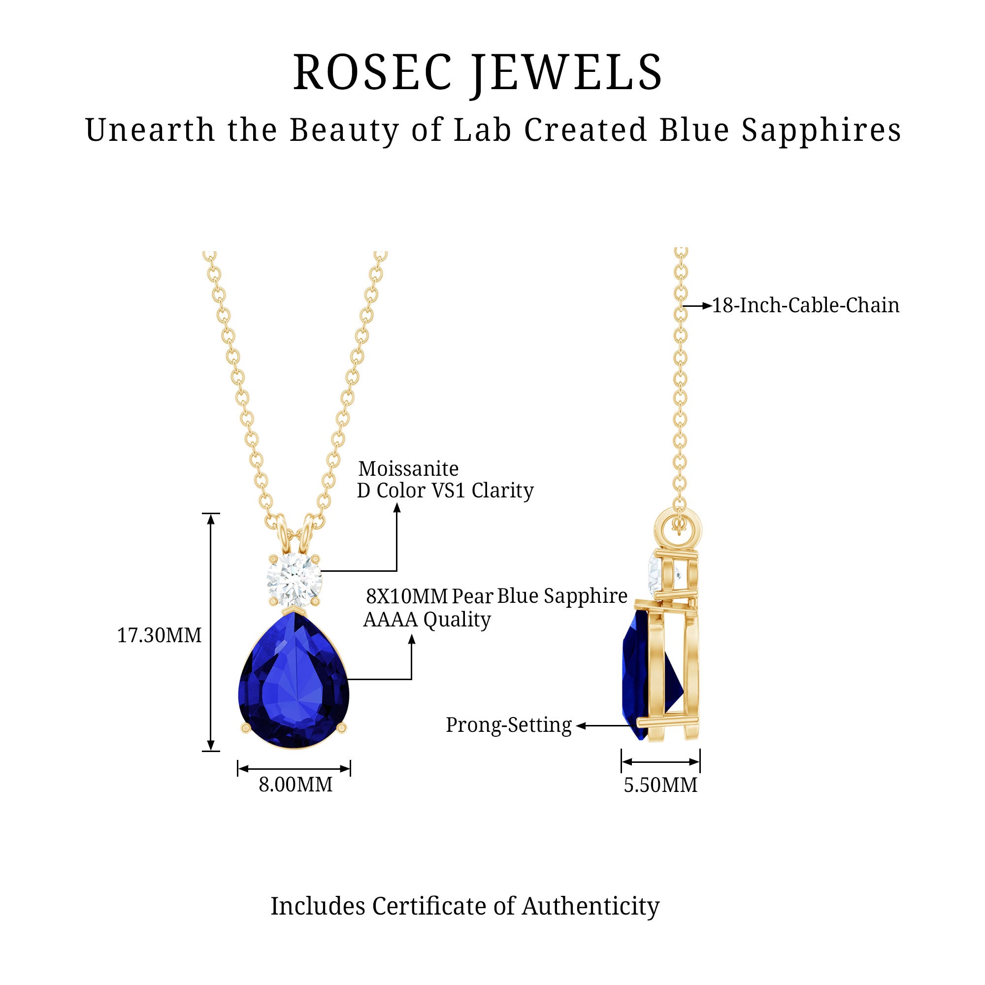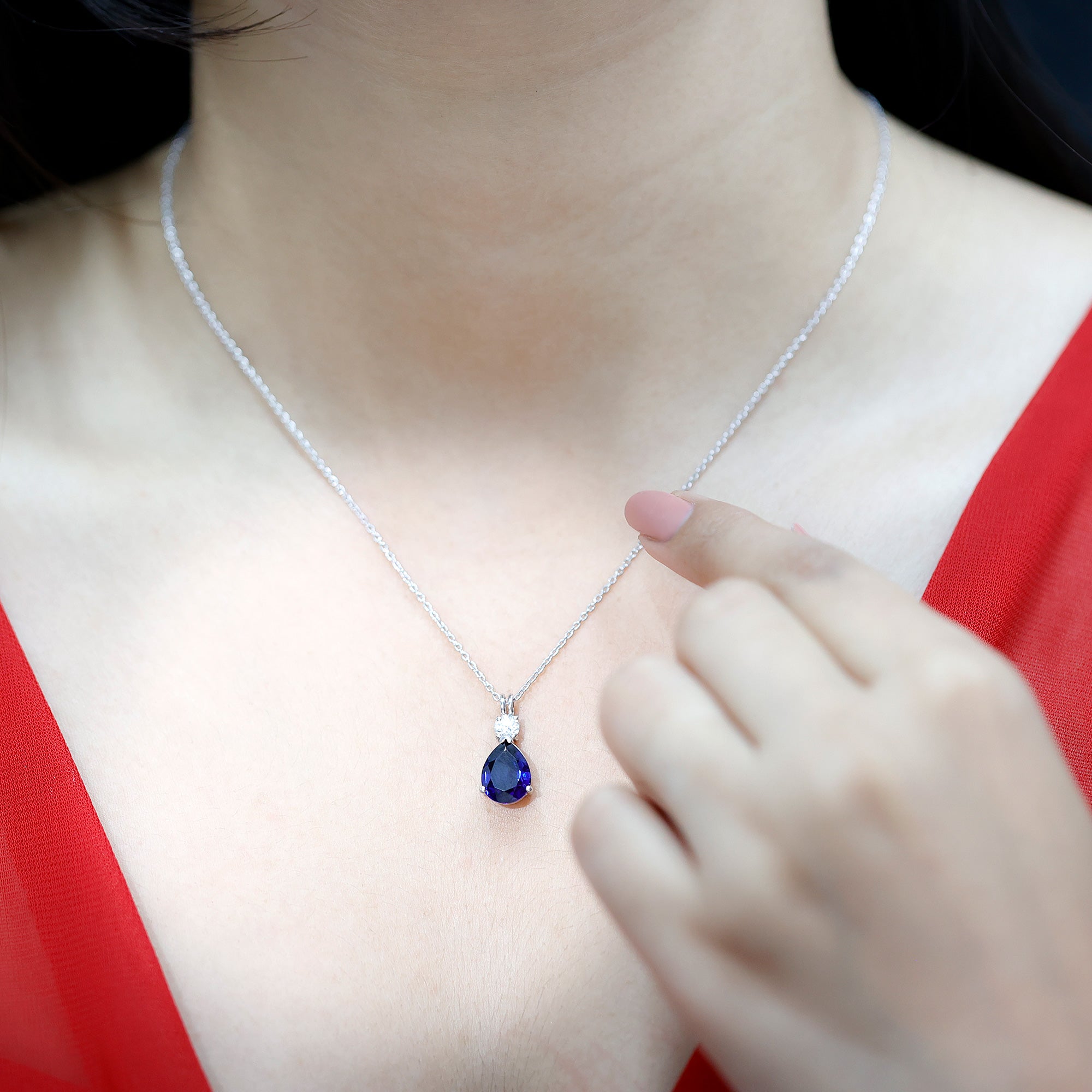 The Teardrop Pendant Necklace is captivating for anyone as it is adorned with Pear Shaped Lab Created Blue Sapphire secured in 3 Prong Setting while Round Cut Moissanite studded on the top.