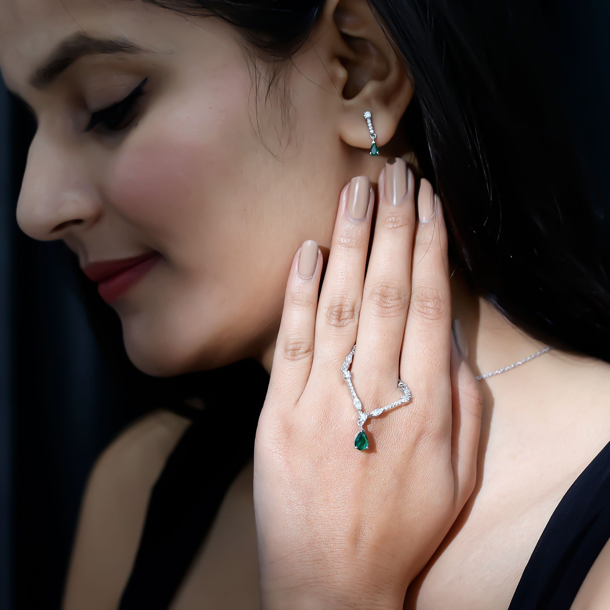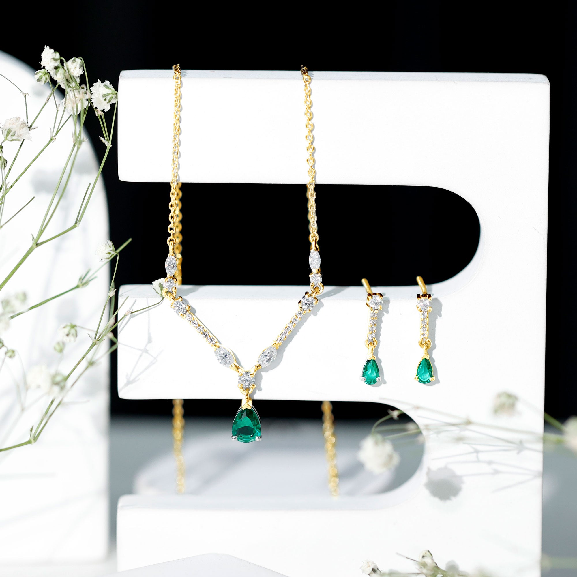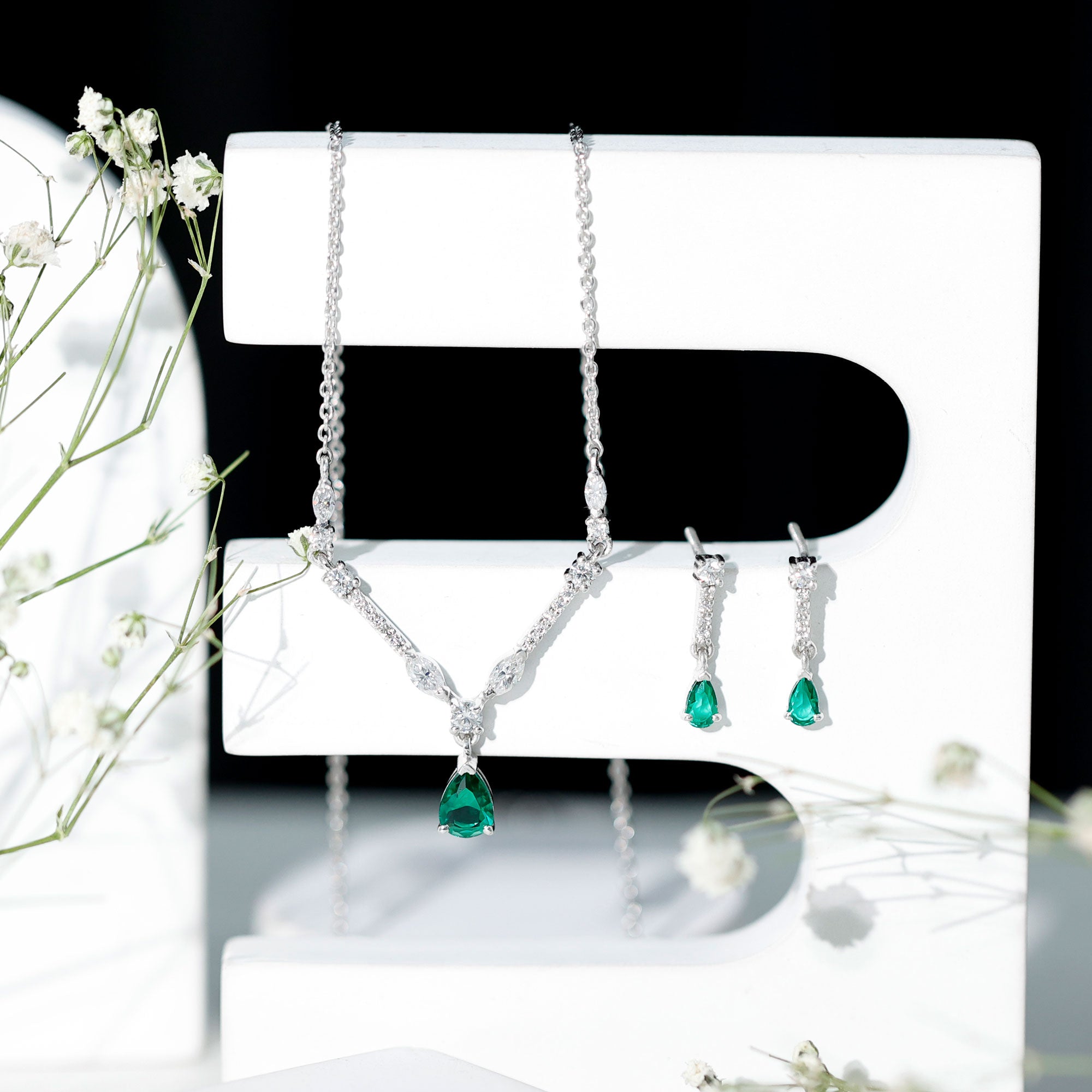 If youre in search of the perfect Necklace Earrings jewelry set to grace your bride-to-be on your wedding day, your search ends here. Feast your eyes on the stunning Created Emerald Jewelry Set, boasting a mesmerizing Pear Cut Created Emerald stone in a reliable Prong Setting, accentuated with glistening Moissanite on both the pendant and drop earrings. This drop jewelry set is guaranteed to create an impression.