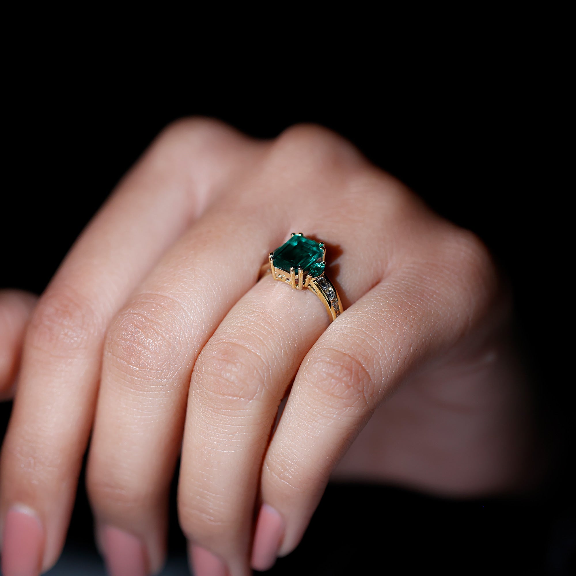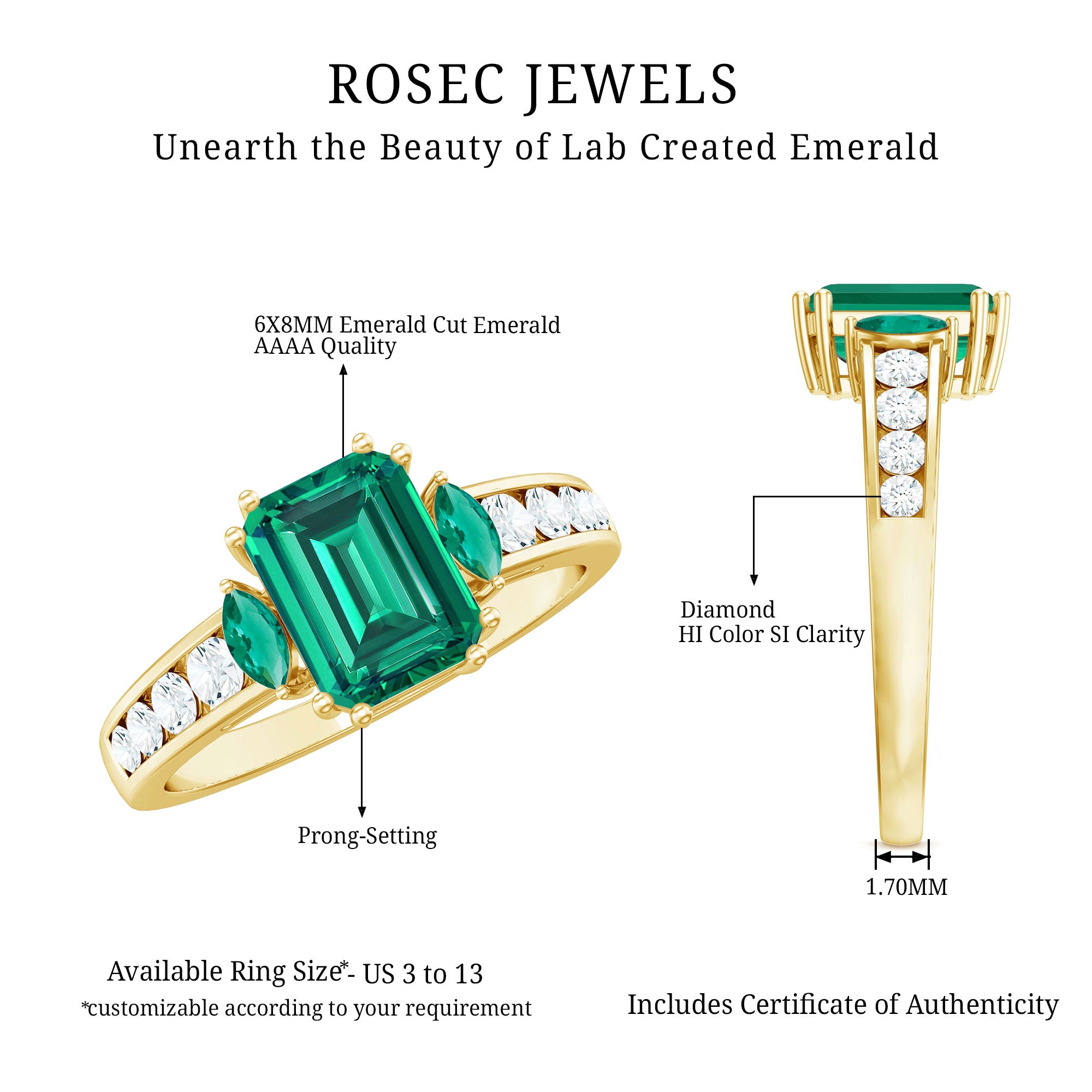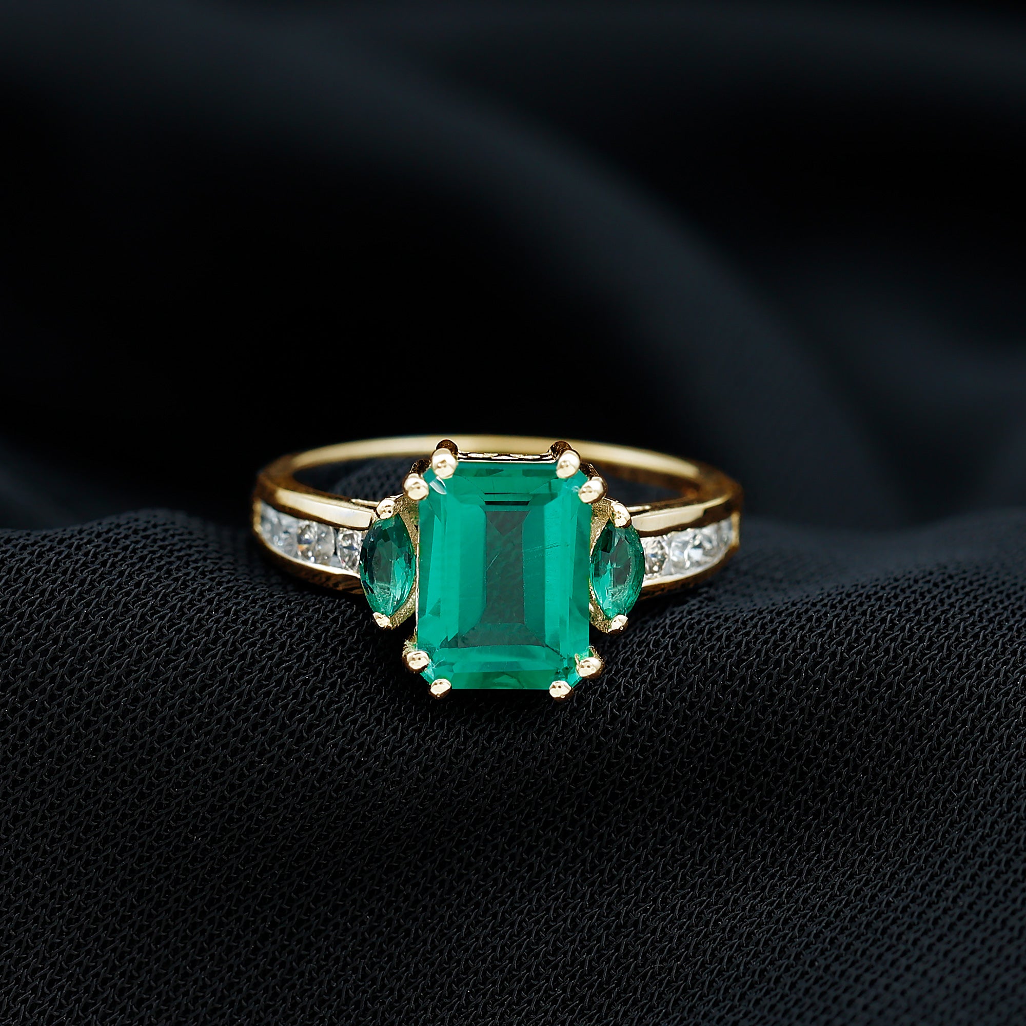 Created Emerald Engagement Ring is splendidly crafted in gold, it has Diamond Side Stones to add more charm to it. This Created Emerald Ring is a graceful and exquisite piece of fine jewelry. Octagon and marquise cut created emerald are held in prong setting and round Diamond held in channel setting beautifully forming excellent cocktail ring.