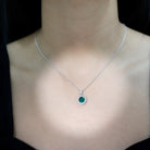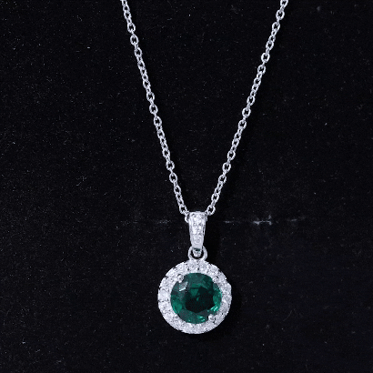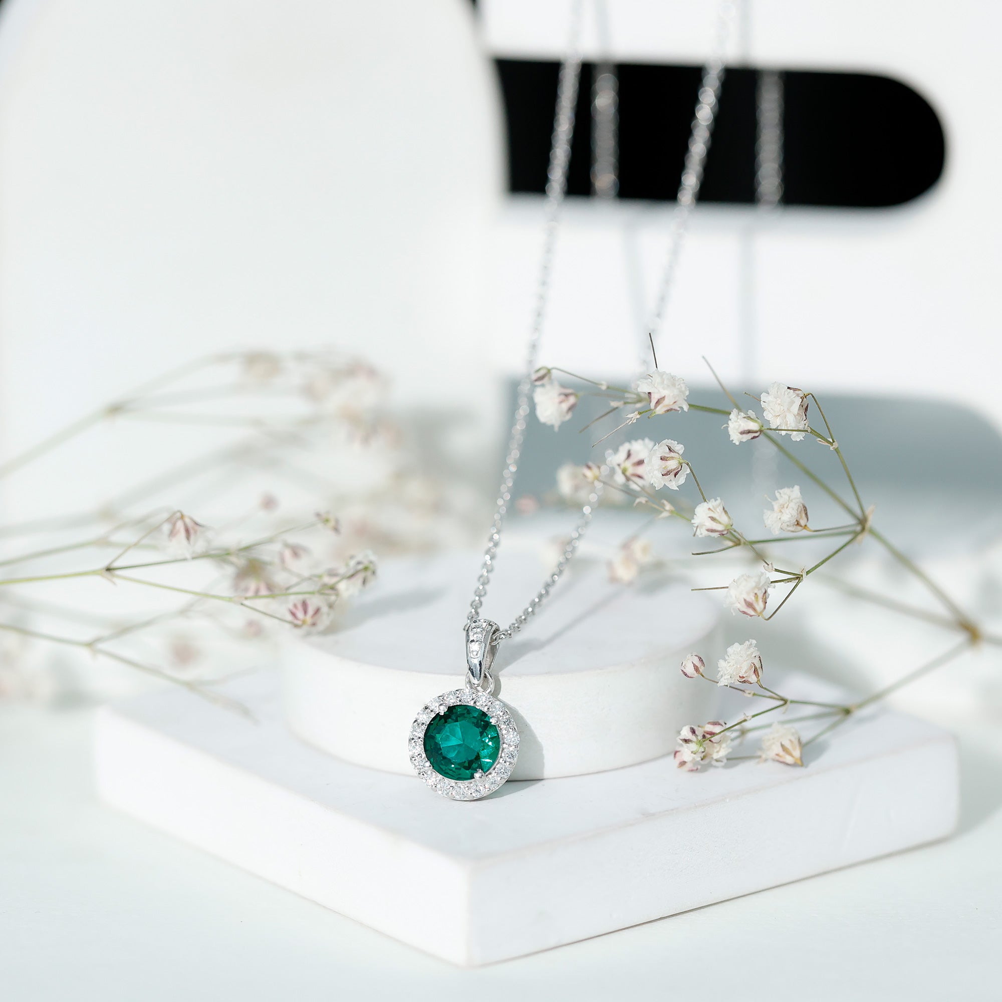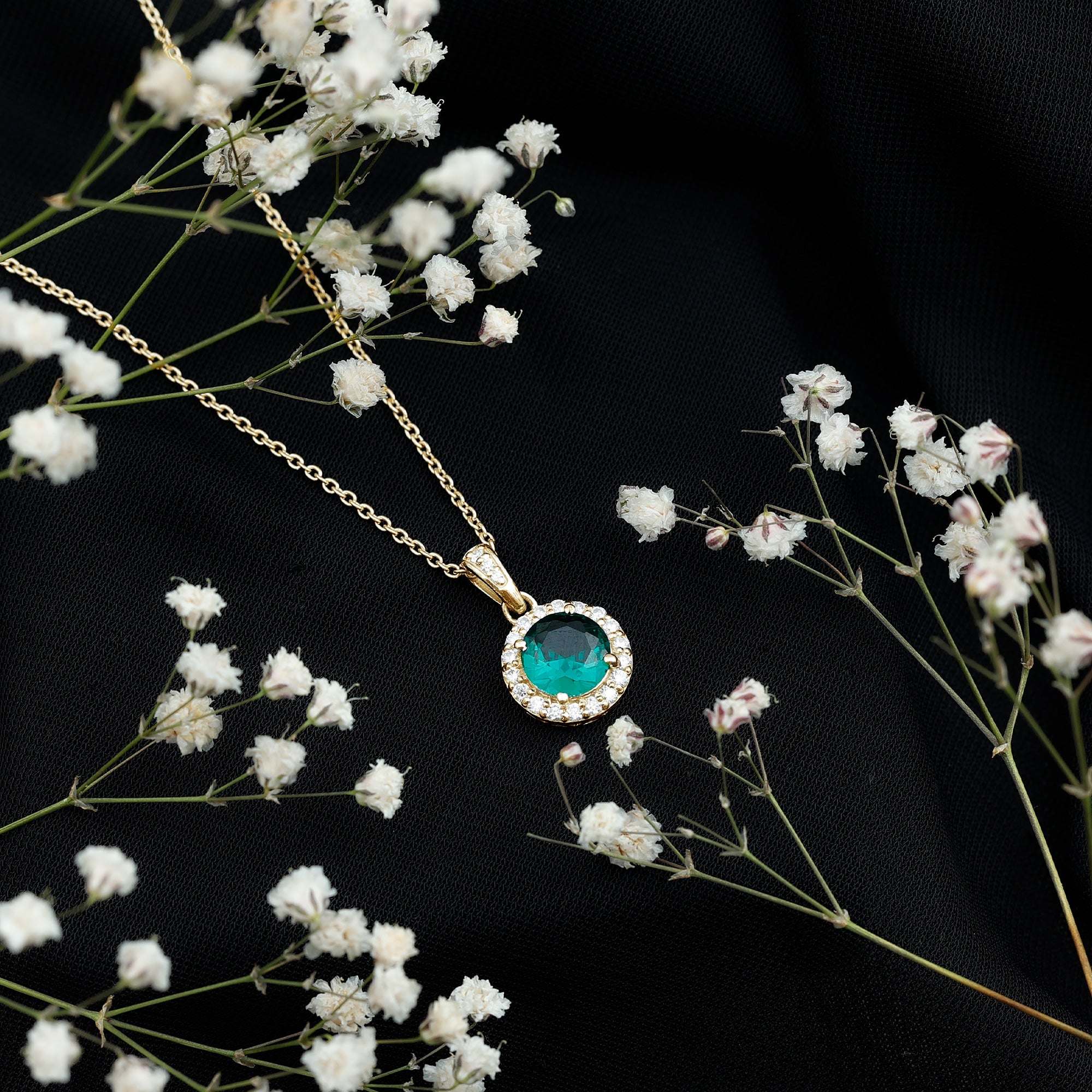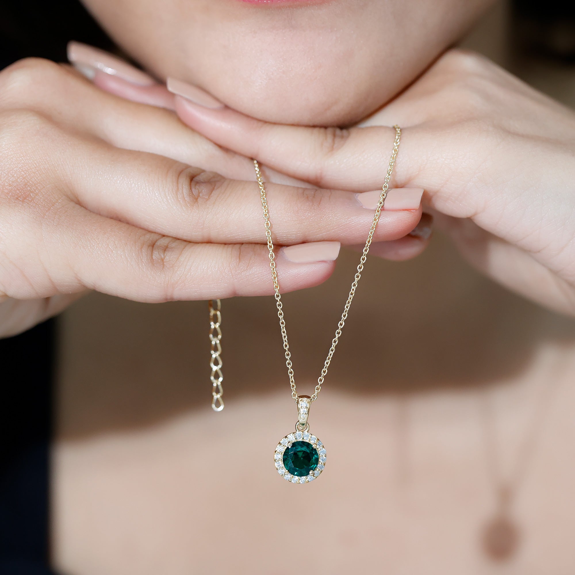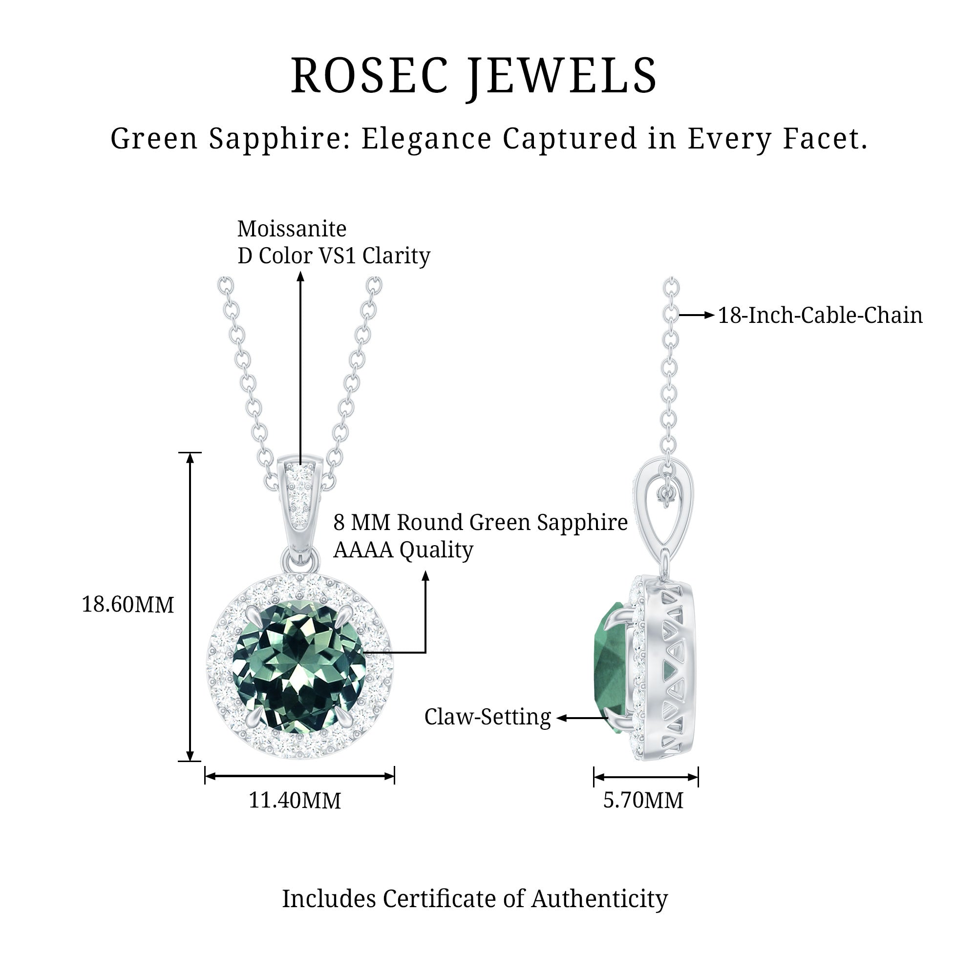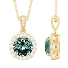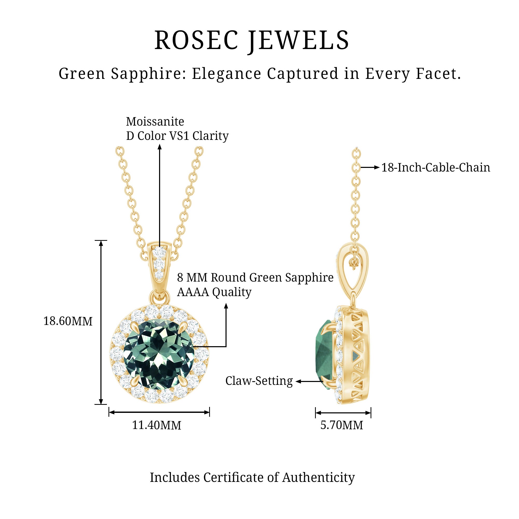 This stunning Pendant Necklace features a Round Cut Lab Created Green Sapphire in the center surrounded by round moissanite halo. The moissanite accent bail adds a touch of sparkle.