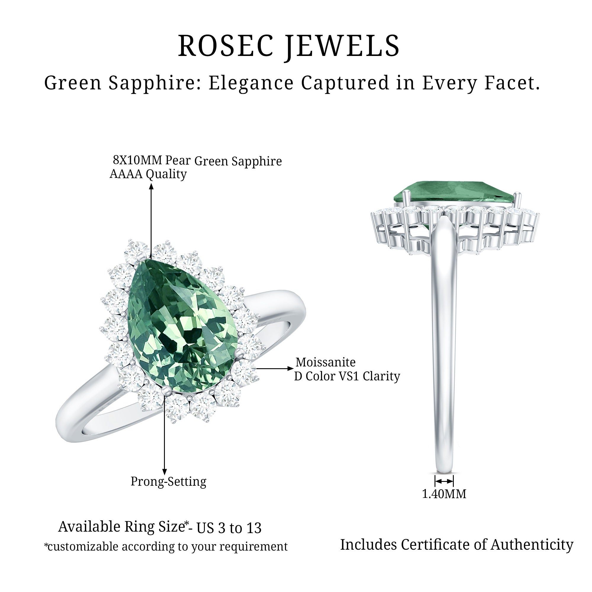 Get ready to make a statement with this stunning Teardrop Ring that is guaranteed to turn heads. Featuring a pear-cut created green sapphire surrounded by round moissanite stones in a halo design, this ring exudes elegance and brilliance.