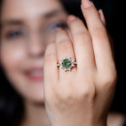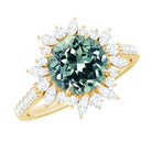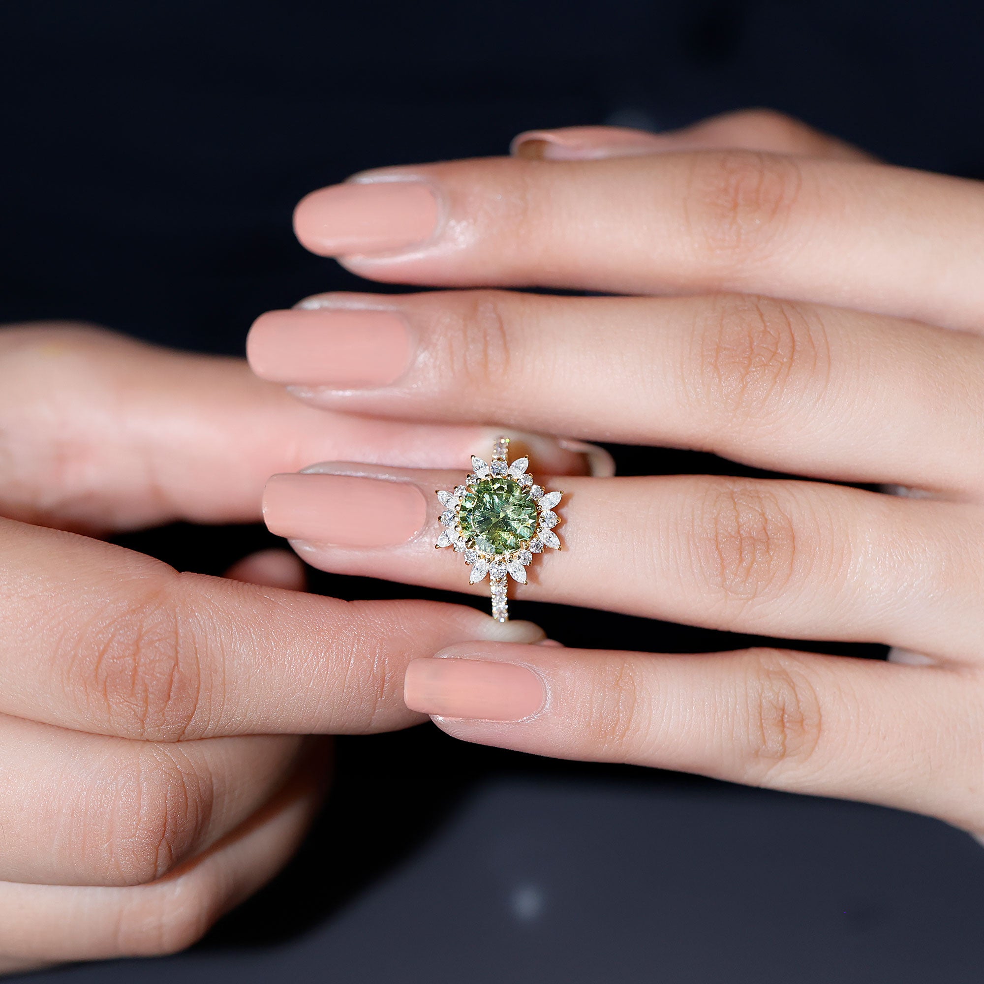 Unique in design, this Flower Engagement Ring is embellished with Round Shape Lab Created Green Sapphire secured in Claw Setting while Marquise and Round Shape Moissanite Halo. This Created Green Sapphire Ring is an excellent one that you should definitely choose, whether it be a Birthday Gift, an anniversary gift for her, New Year Gift, or a proposal.