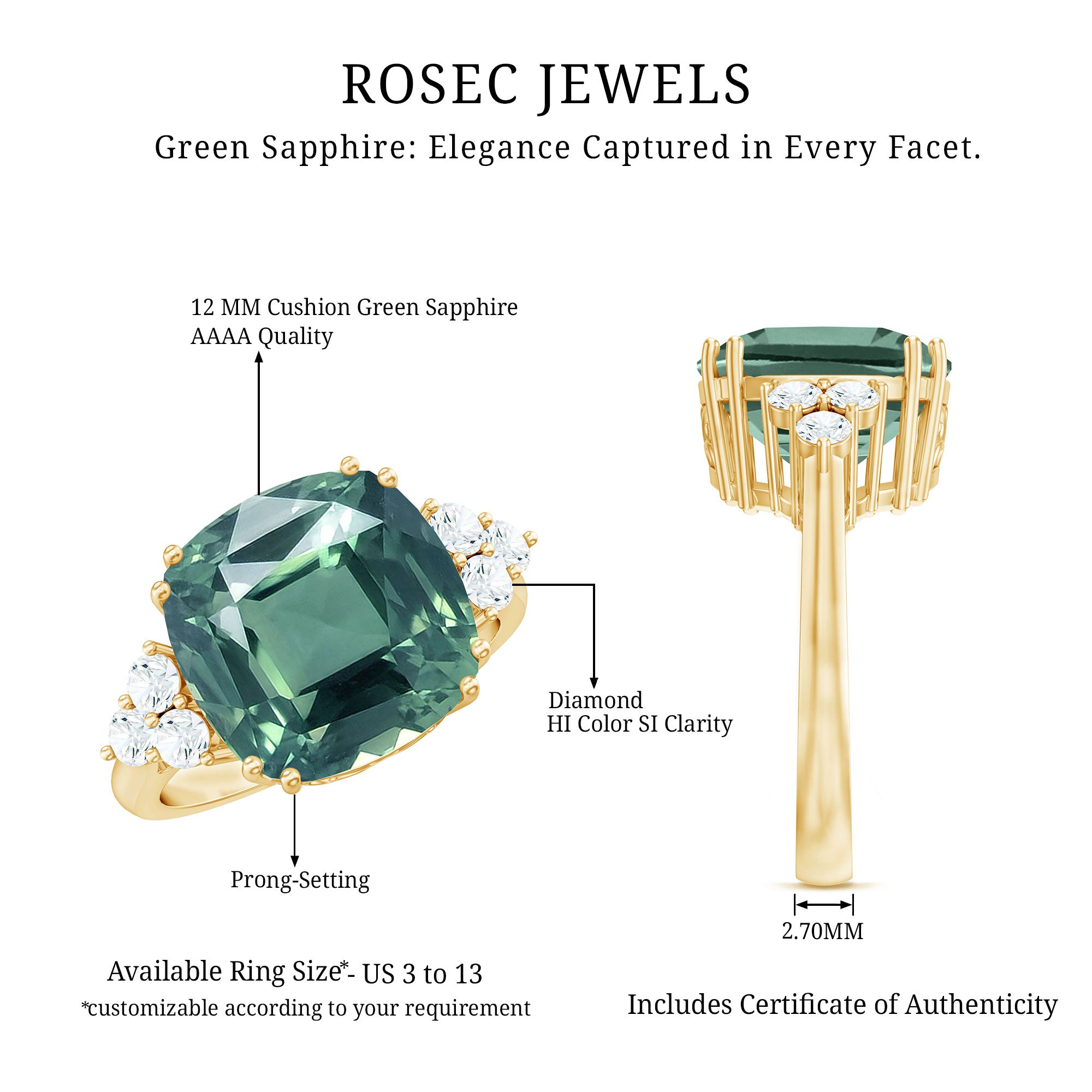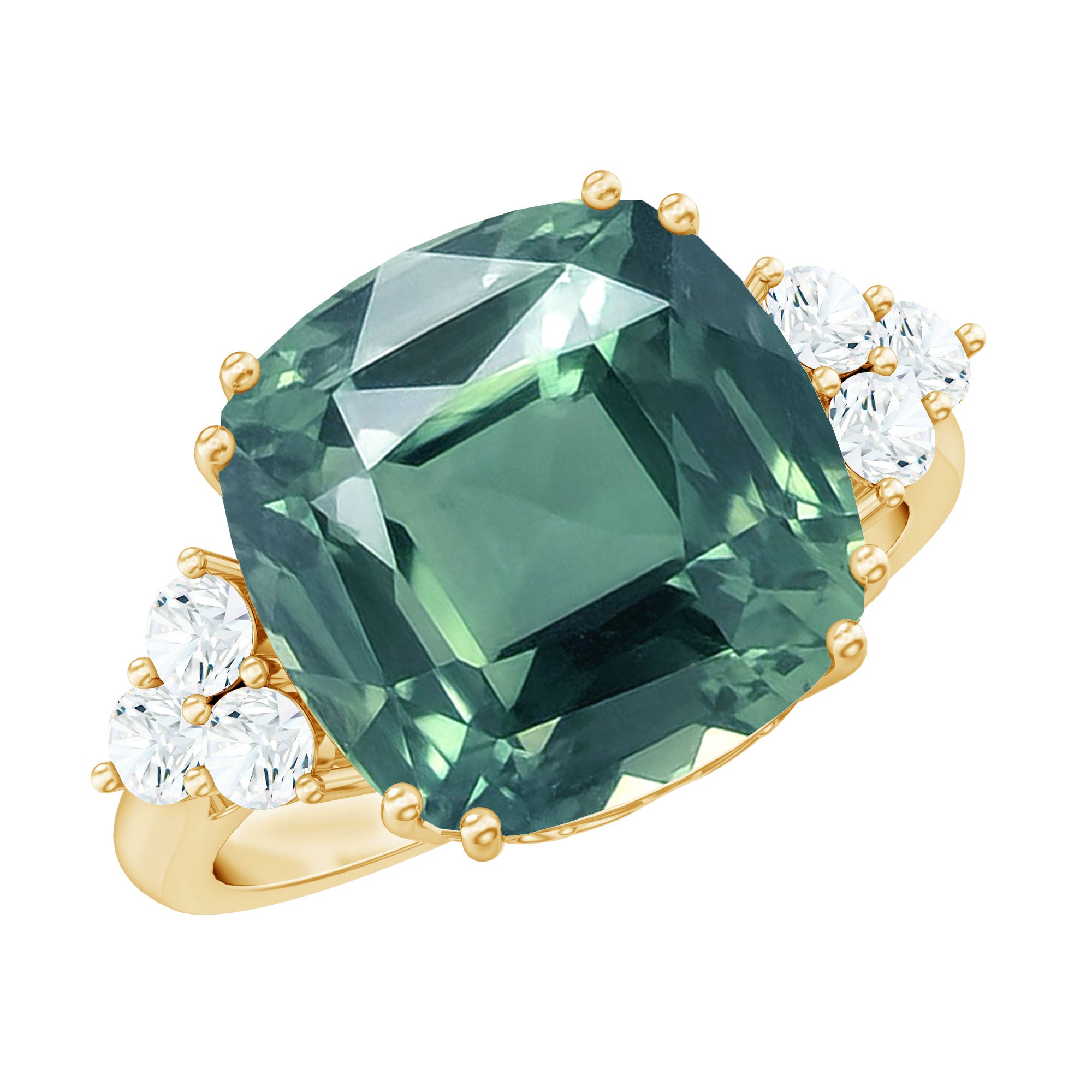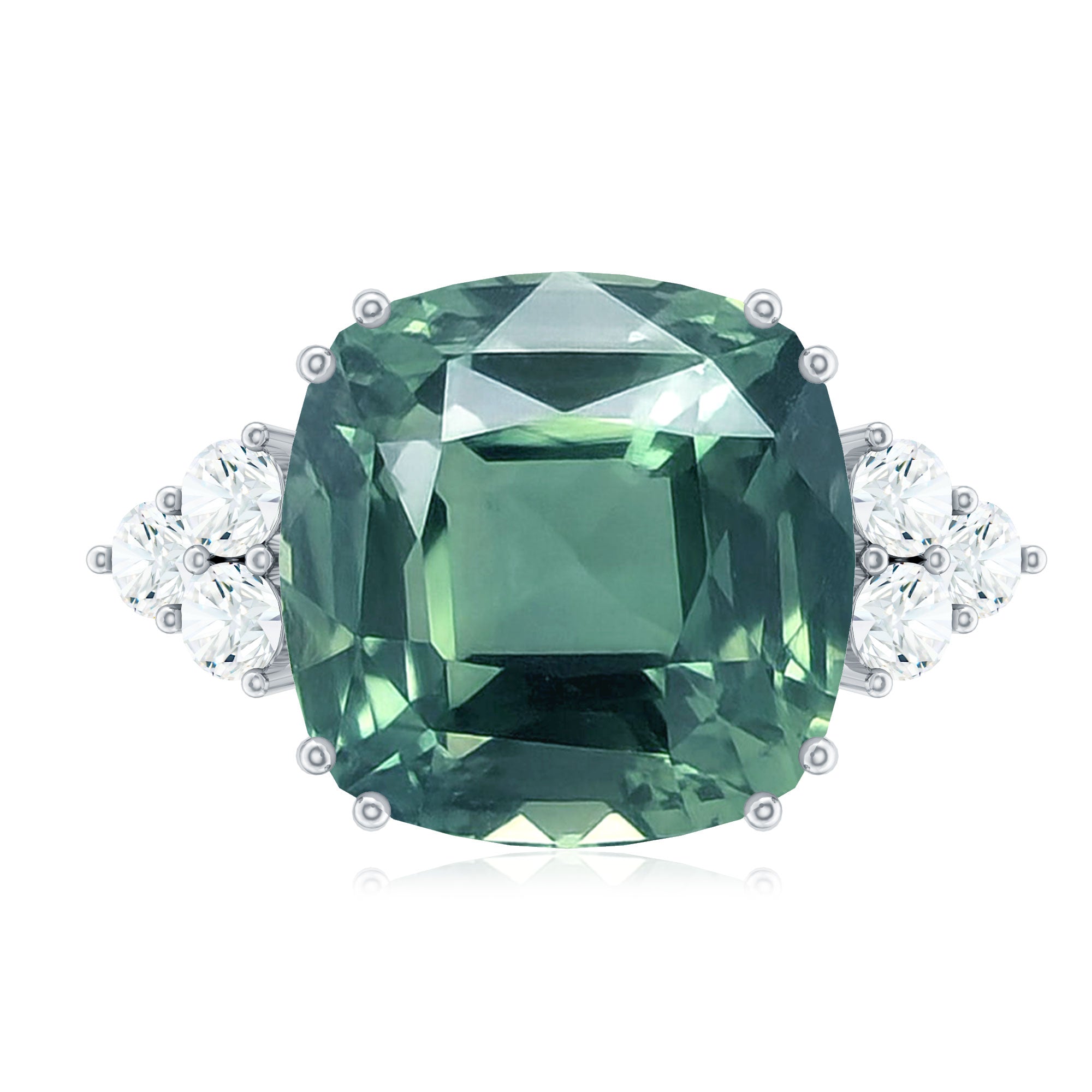 Make a promise to love her forever with this stunning Engagement Ring. Embellished with Cushion Cut Lab Created Green Sapphire secured by Double Prong Setting while Round Moissanite Trio studded on either side of the center stone. Sway her away by getting this gorgeous Solitaire Ring for her as a Birthday Gift or Anniversary Gift, she would surely adore it for her whole life.