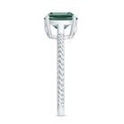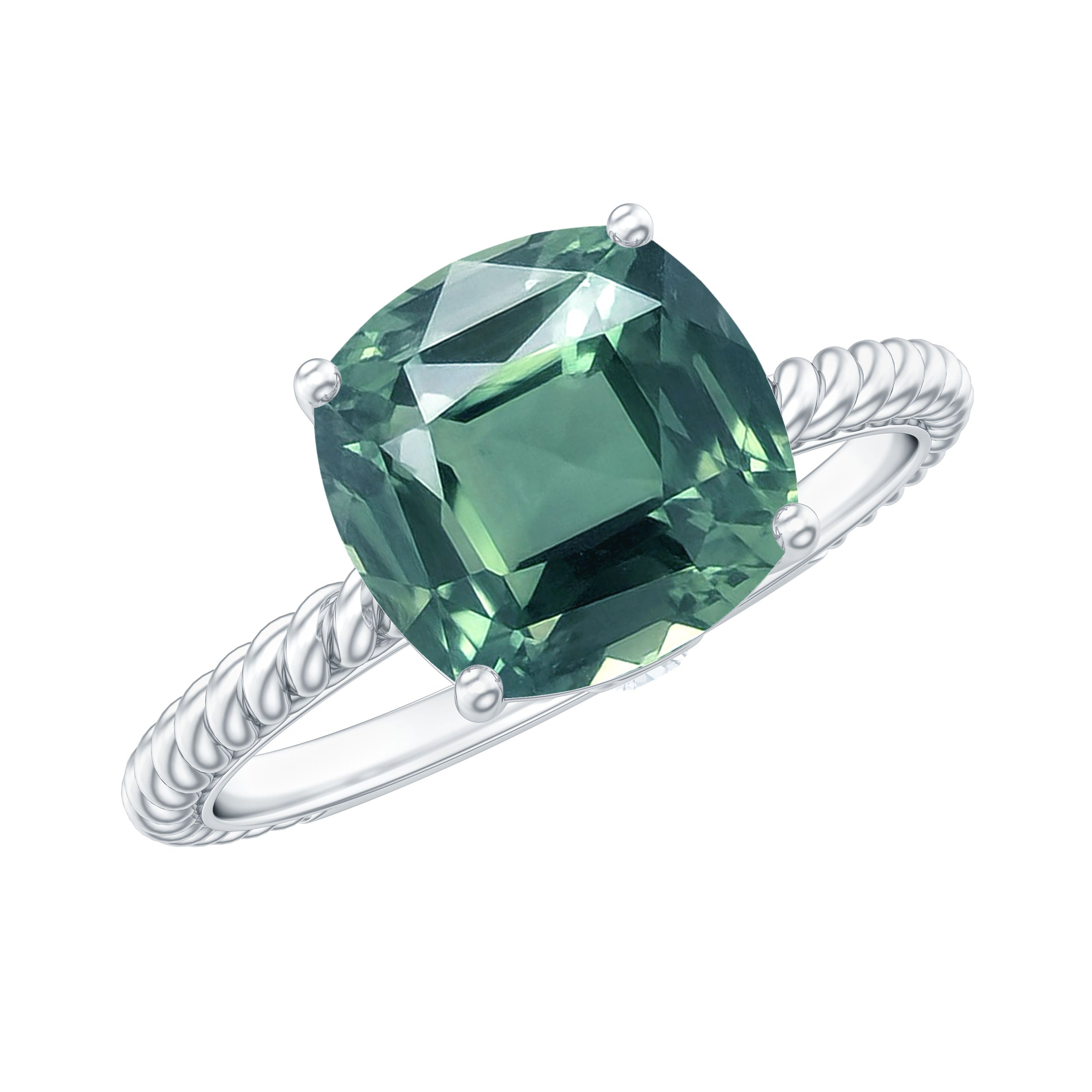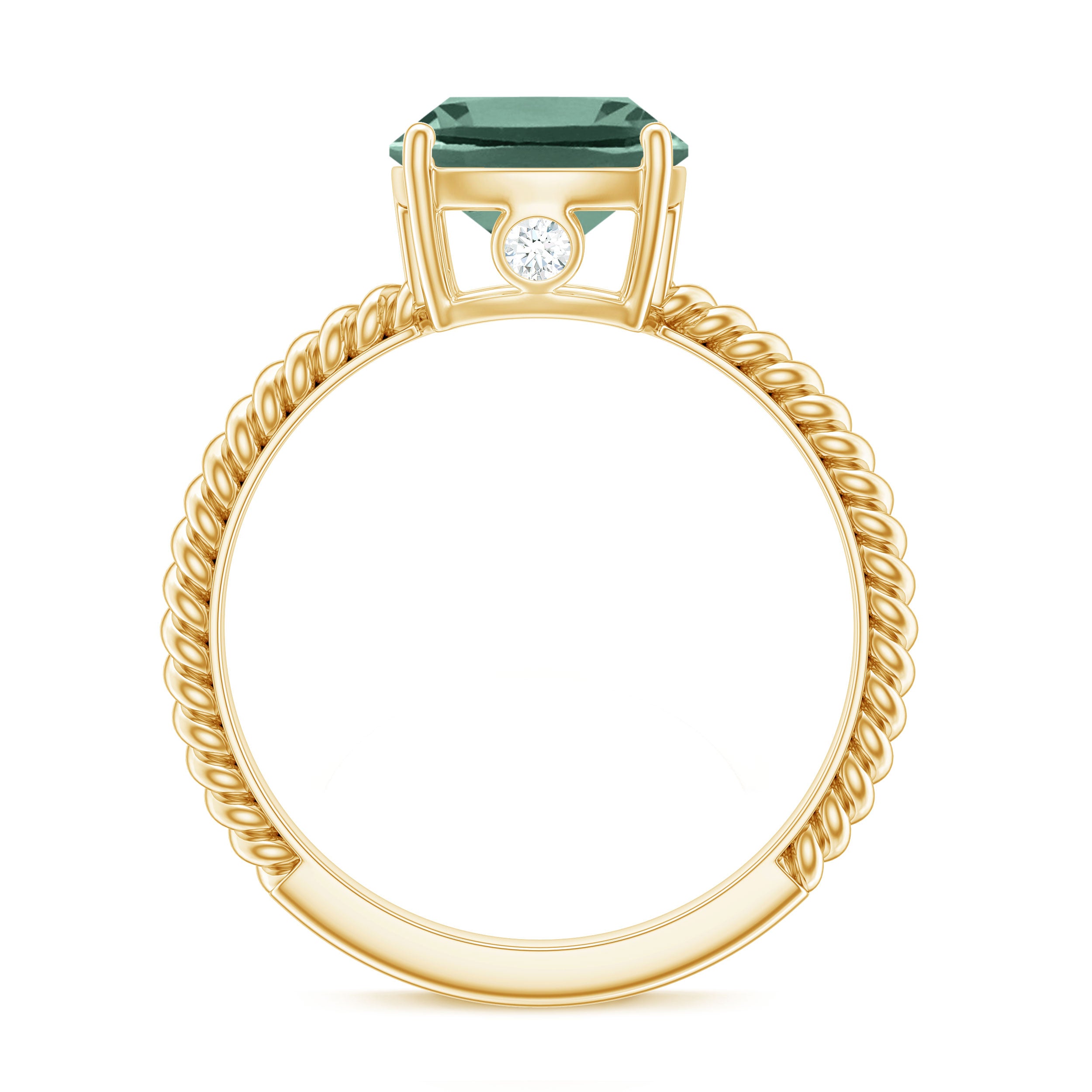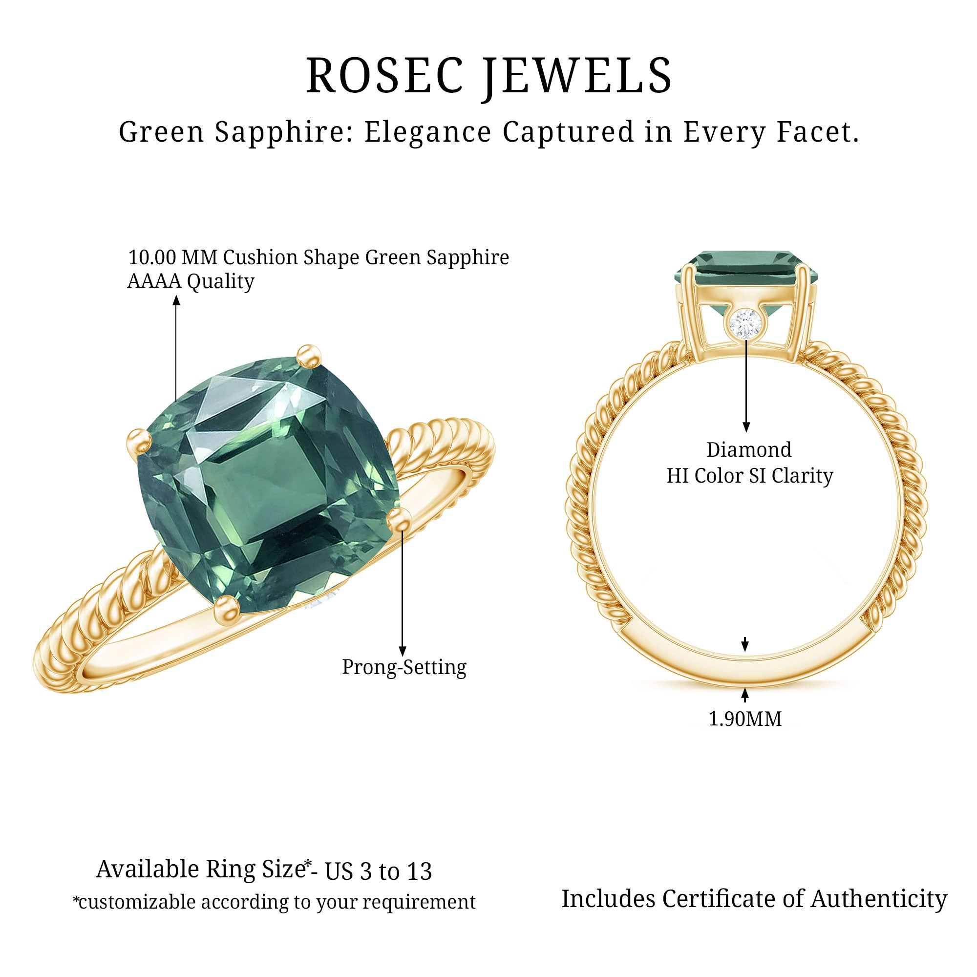 Celebrate your love with this Engagement Ring, embellished with Cushion Cut Lab Created Green Sapphire as a Solitaire in 4 Prong Setting and features Surprise Diamond on the bridge of the ring secured in Bezel Setting. The Twisted Rope Shank gives it a unique and eye-catching look. Adorn her finger with this Created Green Sapphire Ring, by presenting it as a Birthday Gift for Her or an Anniversary Gift.