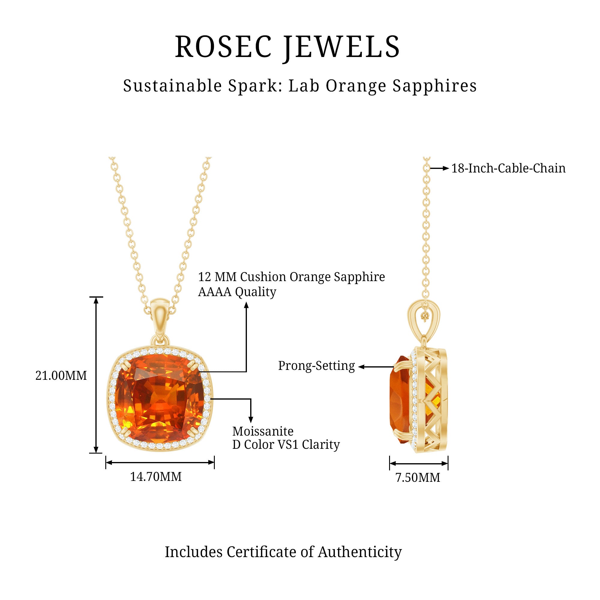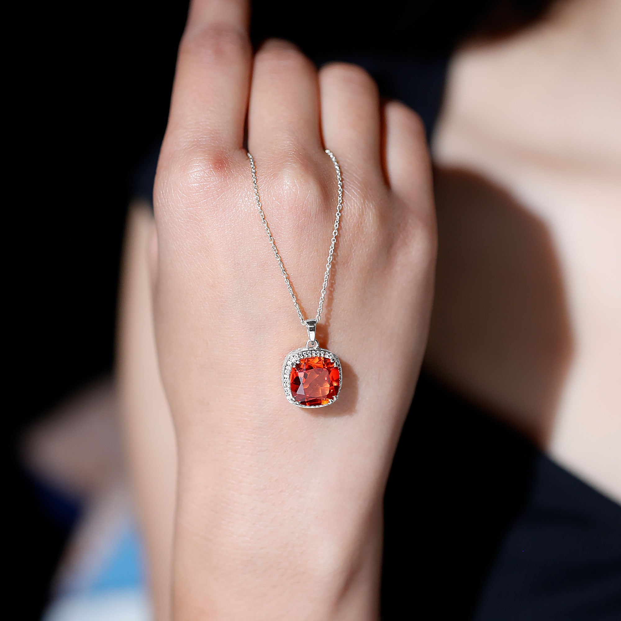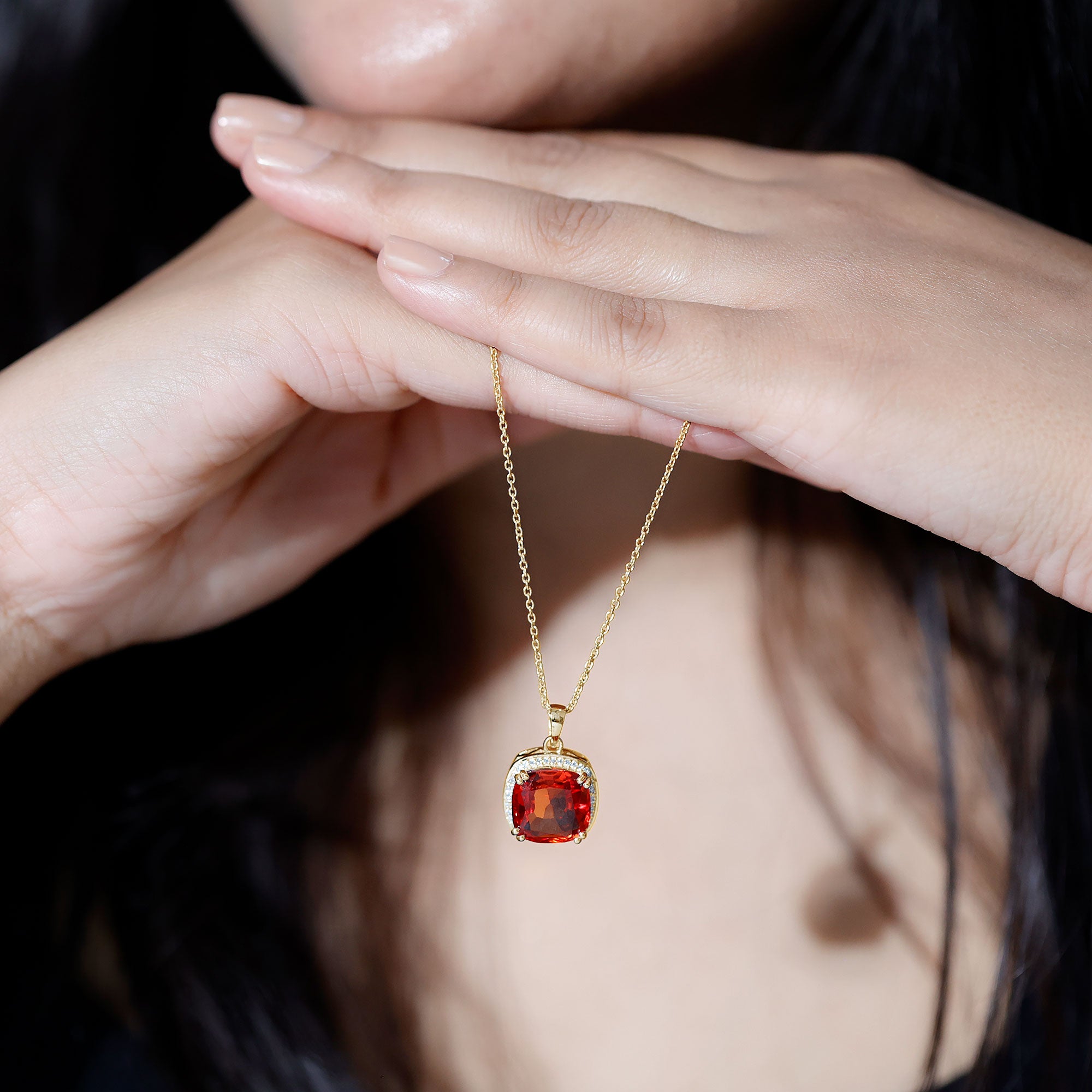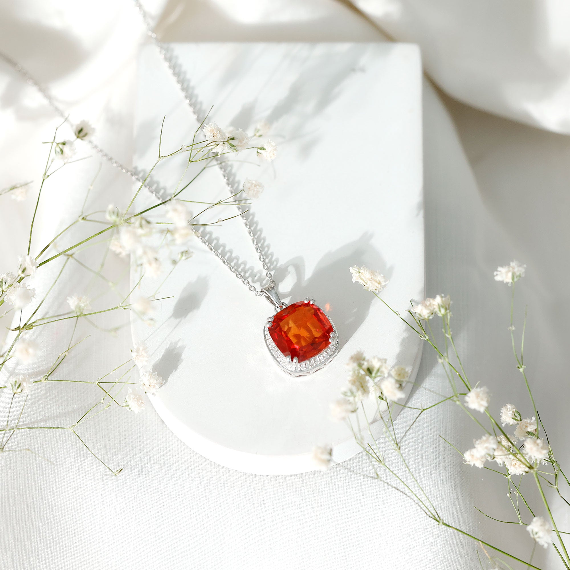 Make her heart skip a beat with this Pendant Necklace. Featuring Cushion Cut Lab Created Orange Sapphire secured in 4 Prong Setting while dainty Round Moissanite studded as Halo. This Created Orange Sapphire Pendant will surely give you the look you want when you style it with your casual or special attires.