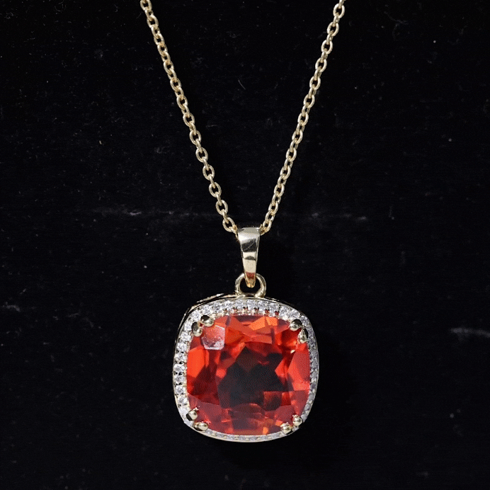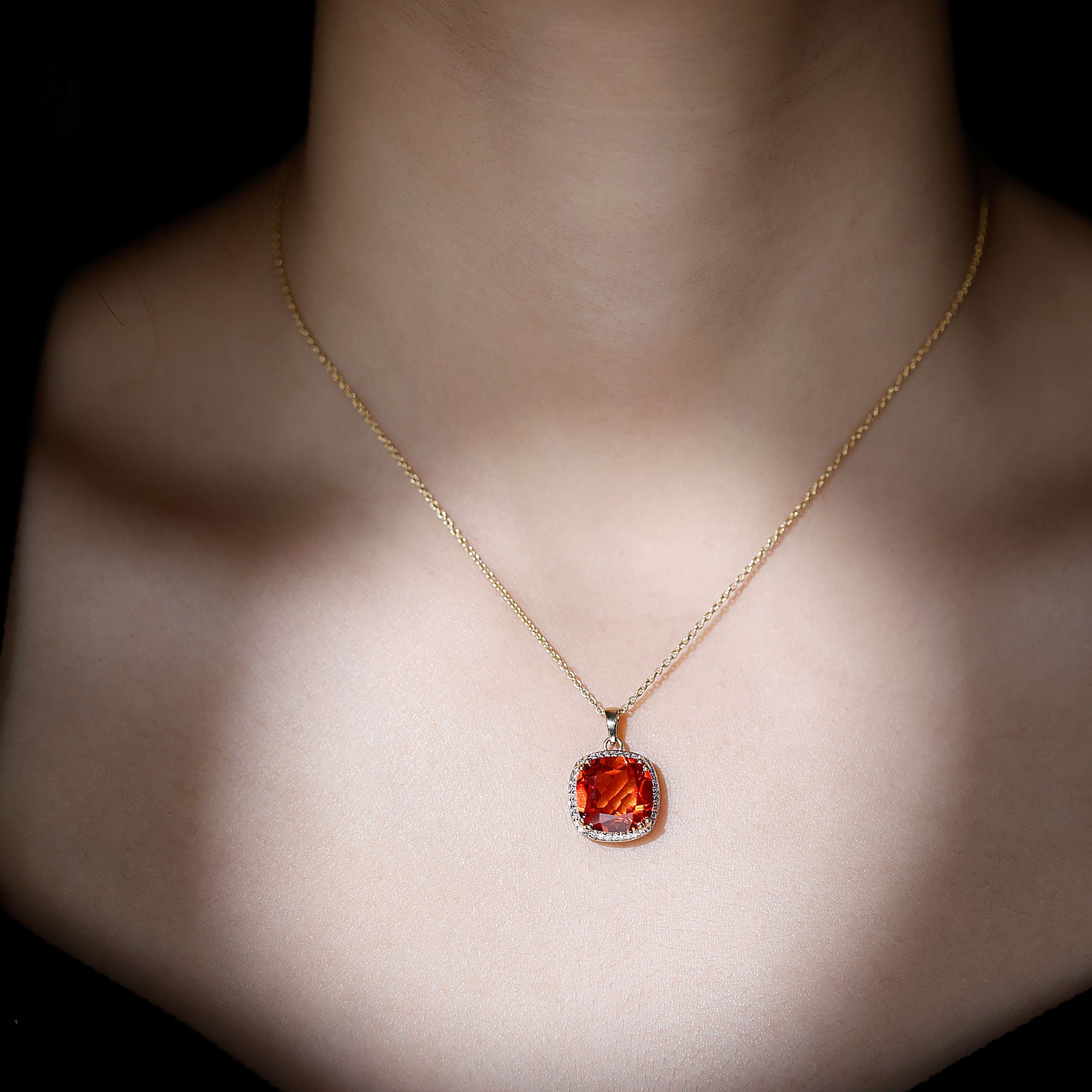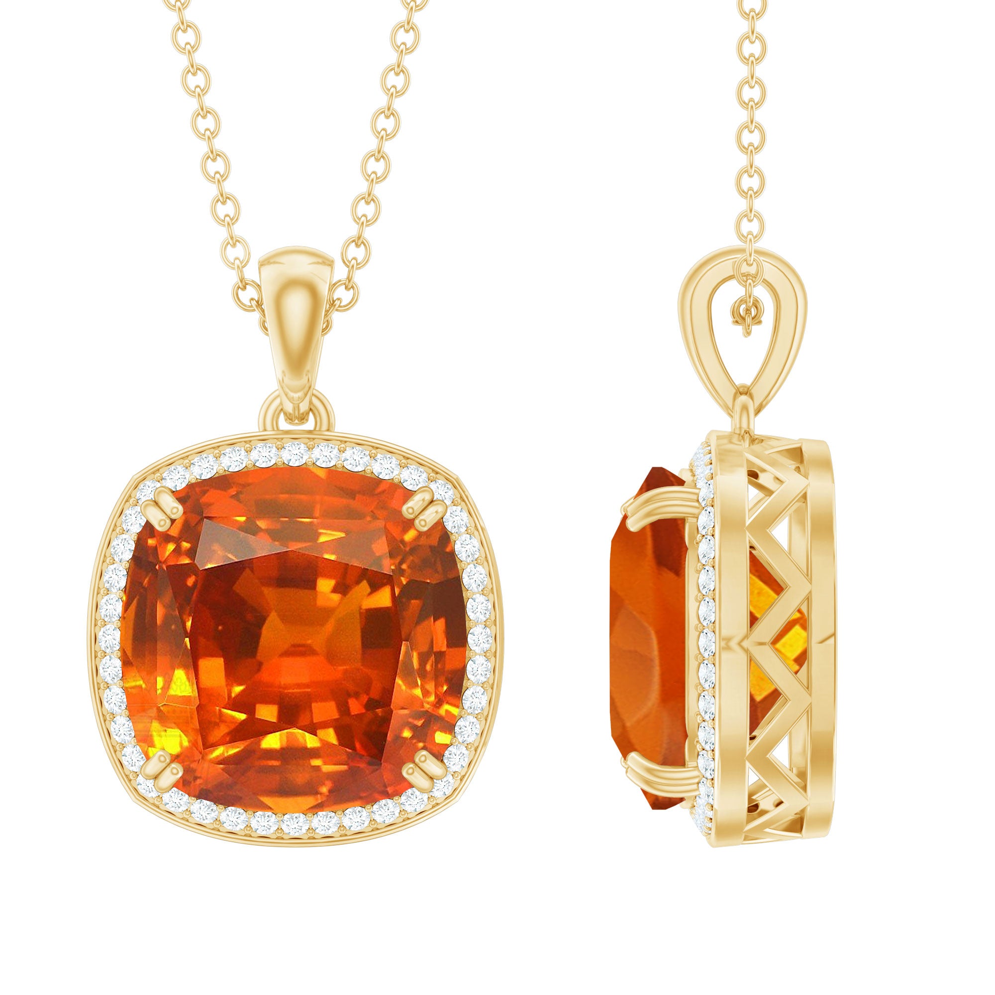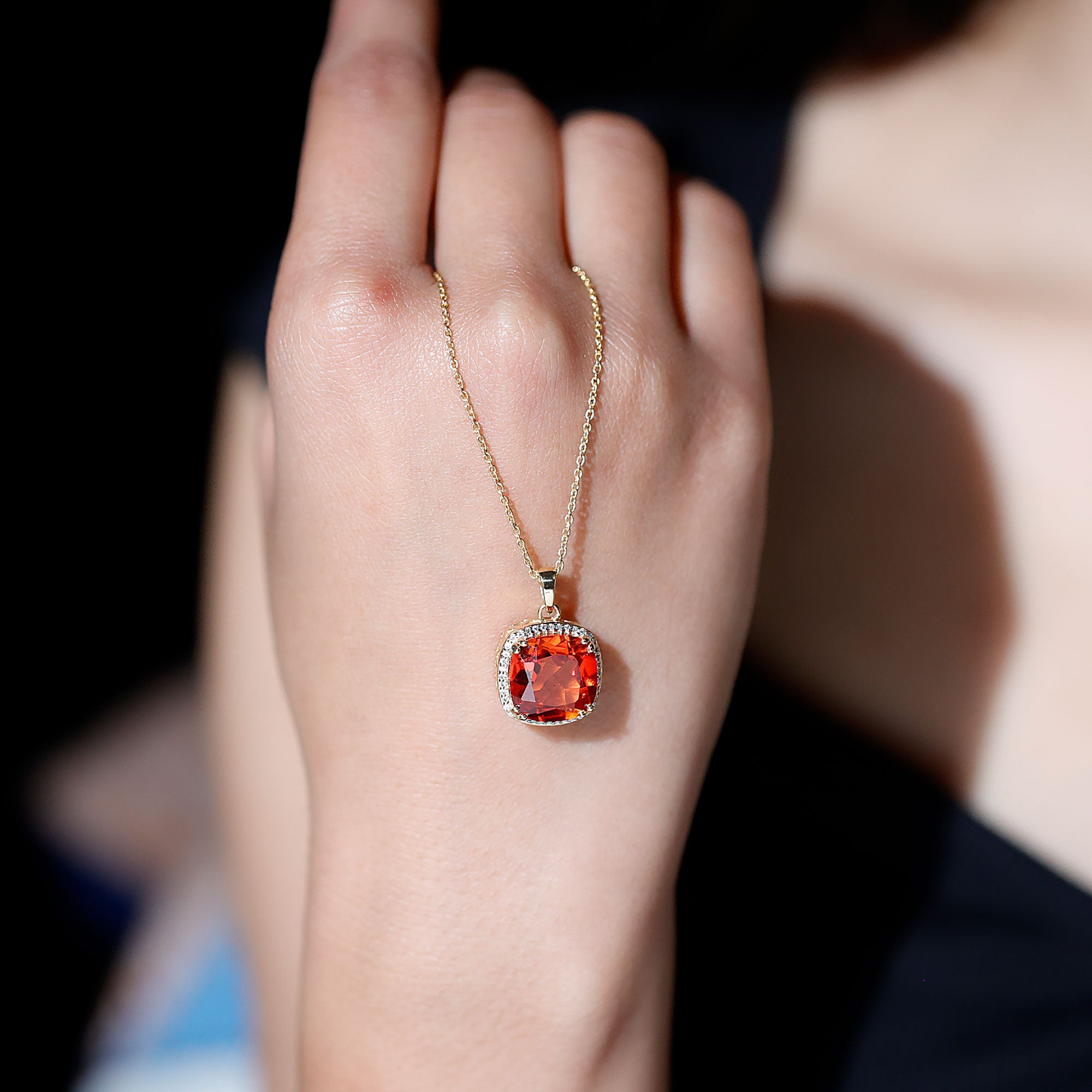 Make her heart skip a beat with this Pendant Necklace. Featuring Cushion Cut Lab Created Orange Sapphire secured in 4 Prong Setting while dainty Round Moissanite studded as Halo. This Created Orange Sapphire Pendant will surely give you the look you want when you style it with your casual or special attires.