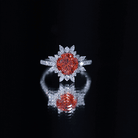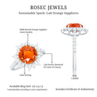 Turn heads and light up the room with this breathtaking Orange Sapphire Halo Ring - an eco-conscious statement piece that also serves as a bold and unforgettable engagement ring. At its heart sits a vibrant 8 MM round cut lab created orange sapphire, secured in claw setting. Encircling the brilliant orange center stone is a floral-inspired halo made up of alternating marquise and round lab created diamonds. This dynamic halo enhances the glow of main gem and gives the Cocktail Ring a romantic yet regal presence. The band adds extra sparkle, with round lab created diamonds adorning each shoulder. Crafted entirely with lab grown gemstones, this Orange Sapphire and Diamond Engagement Ring is not only stunning but also a responsible choice for those who value sustainability and ethical sourcing. Every stone is created with precision and care, offering exceptional clarity and brilliance without harming the environment. Whether you are marking a lifelong commitment or making a fashion-forward statement, this 2 Carat Orange Sapphire Ring is bold, elegant, and full of meaning - a celebration of color, conscience, and everlasting beauty.