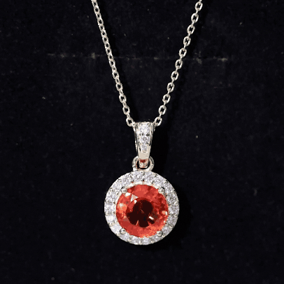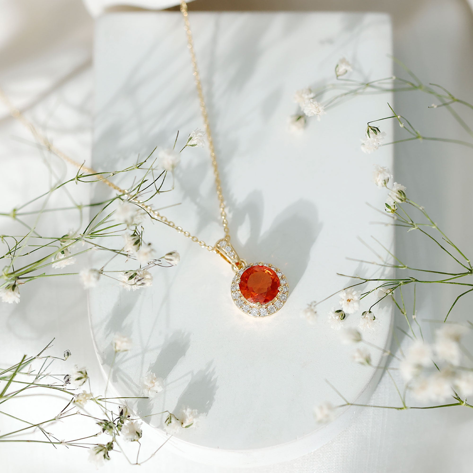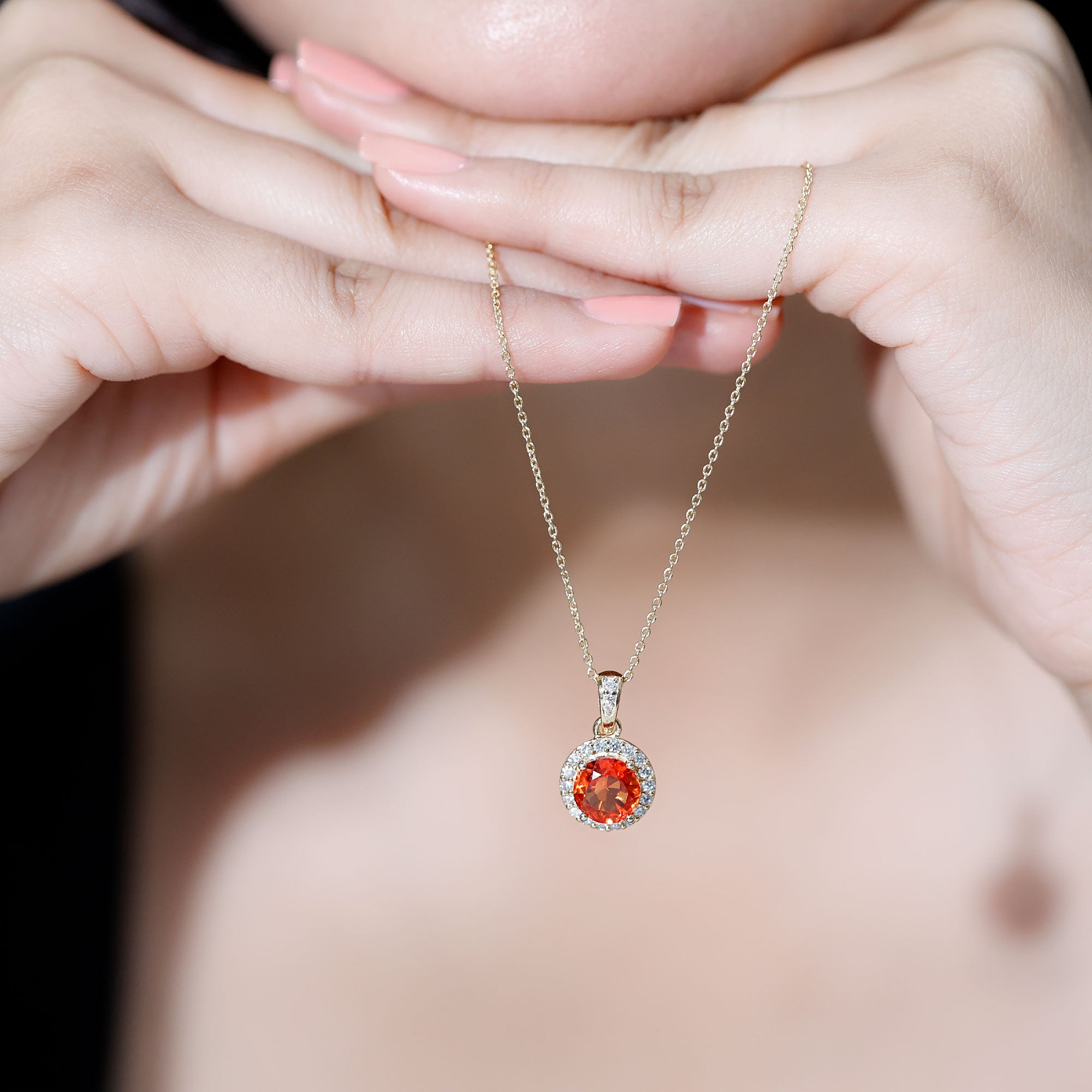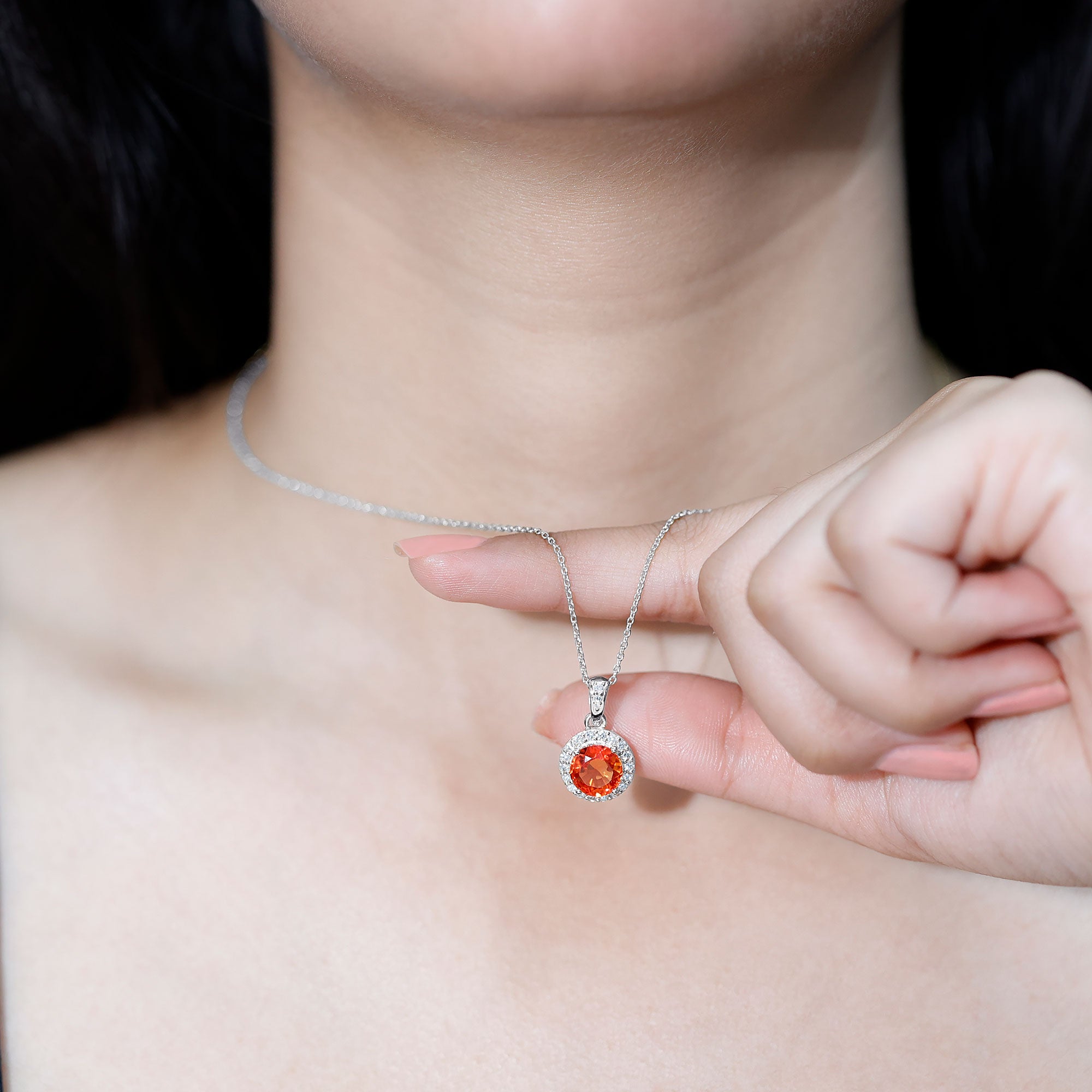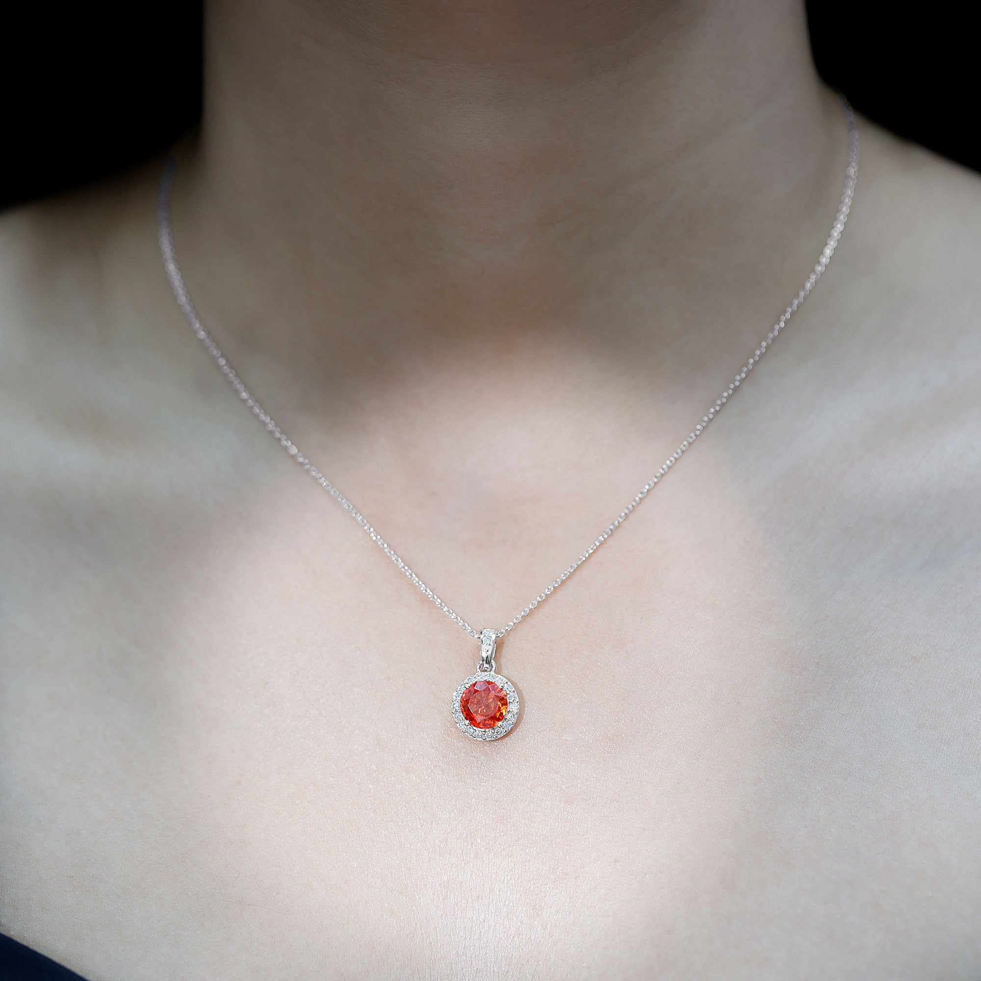 This Pendant Necklace is encased with a Round Shape Lab Created Orange Sapphire secured in Claw Setting while Round Shape Diamond studded as Halo. The Created Orange Sapphire Pendant Necklace will enhance your style and fill your day with compliments. Flaunt this Halo Pendant on days when you feel like adding a little sparkly touch to your looks.