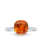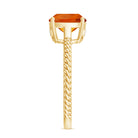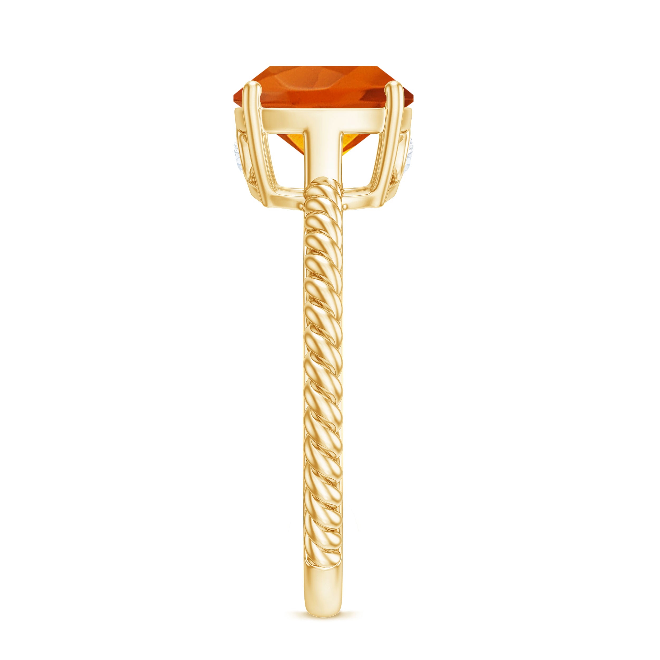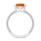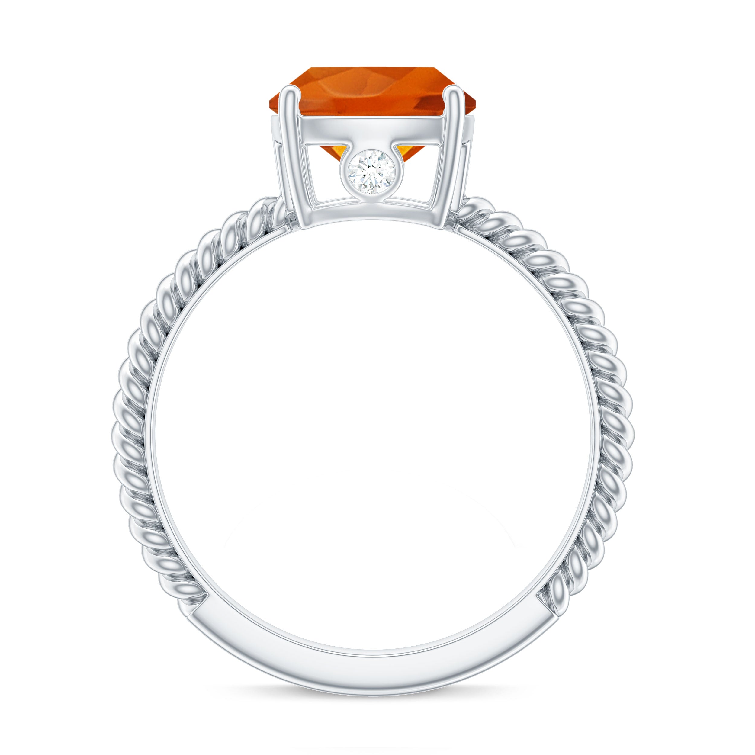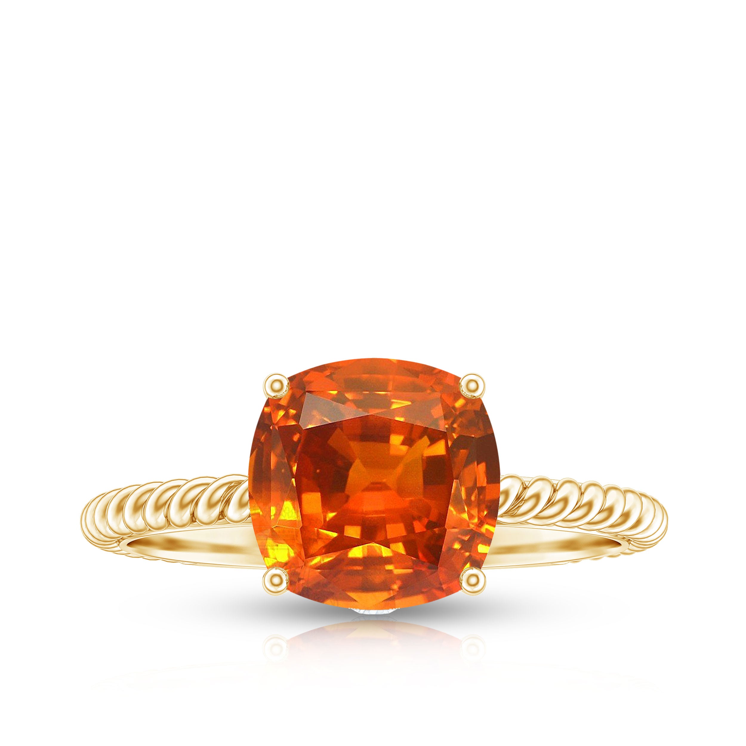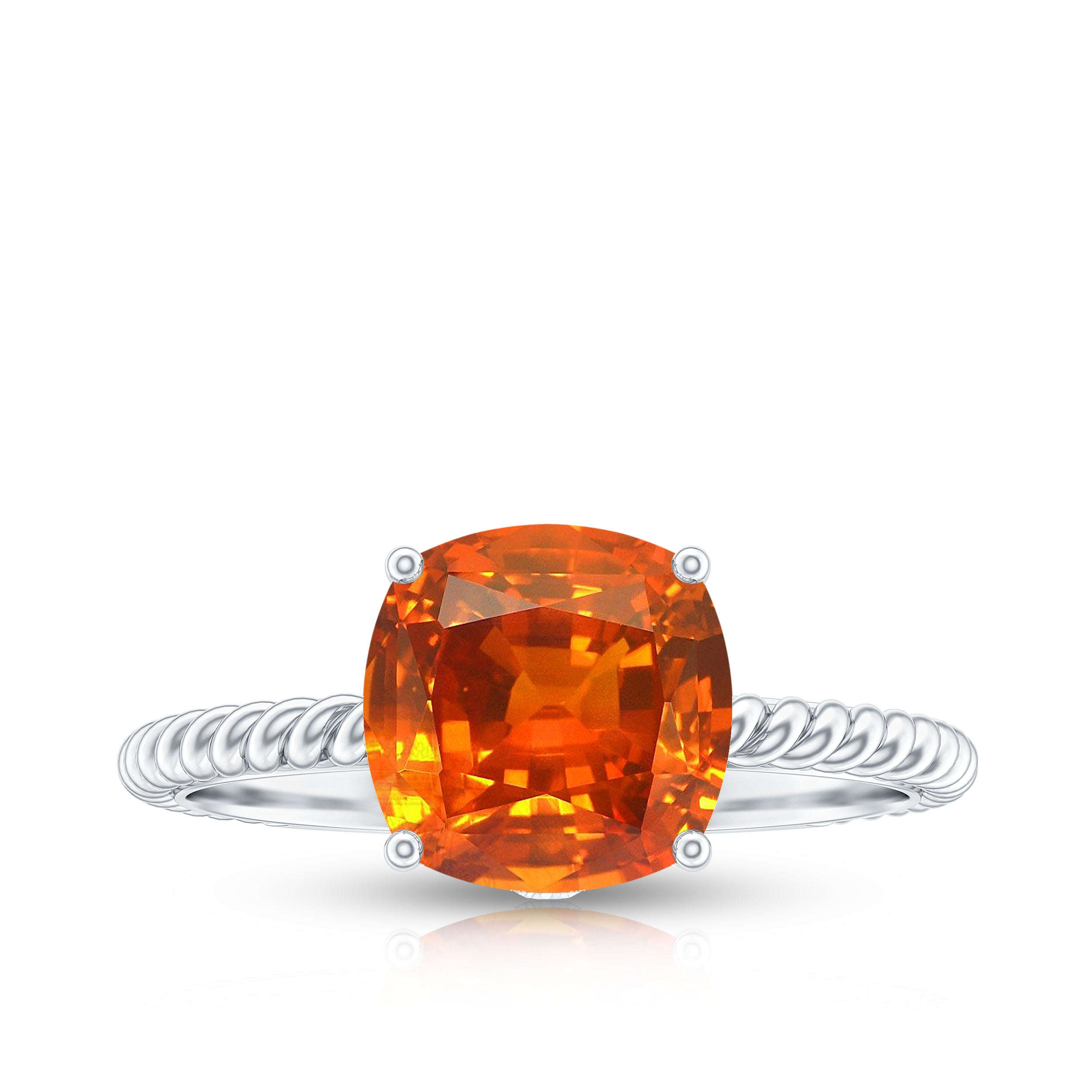Get this gorgeous Solitaire Engagement Ring showcasing Cushion Cut Lab Created Orange Sapphire as a Solitaire secured by 4 Prong Setting while Surprise Diamond studded on the bridge of the ring in Bezel Setting and a Twisted Rope Shank. Grab this Created Orange Sapphire Ring for your loved ones as a Mothers Day Gift, Birthday Gift for Her, Anniversary Gift, or Valentines Day Gift.