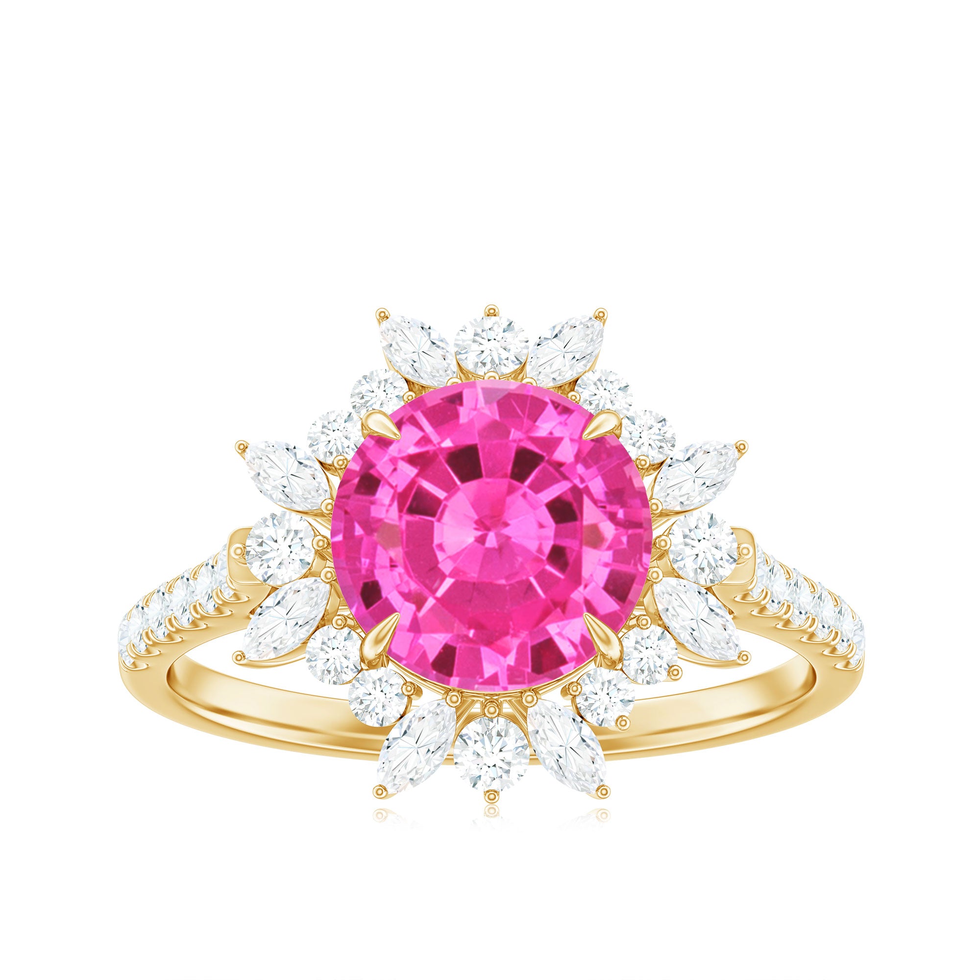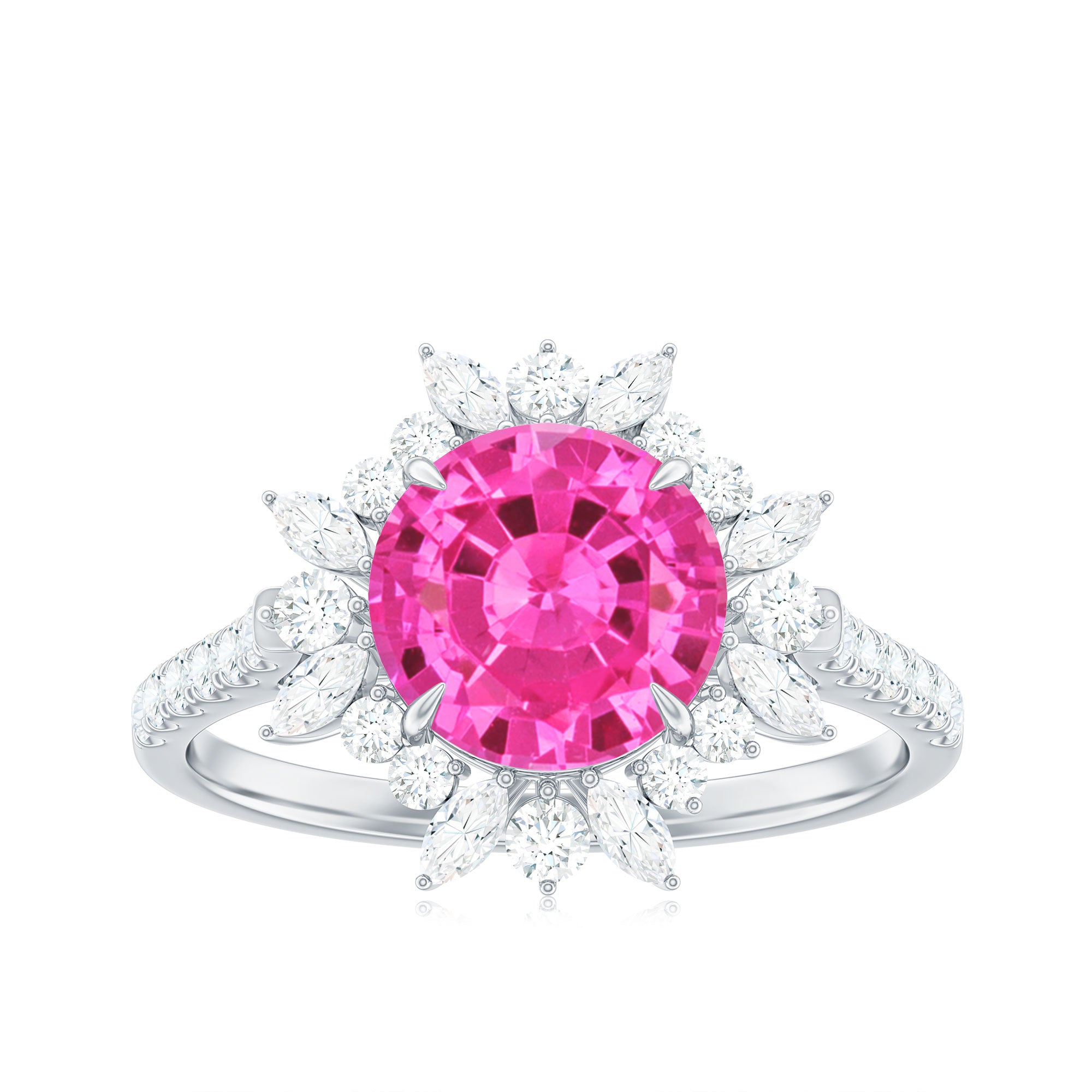 Embrace the splendor of natures blooms with this Cocktail Ring adorned with a captivating sunflower design. Its centerpiece features a Round Cut Created Pink Sapphire, encircled by a mesmerizing halo of Round and Marquise Cut Moissanite stones. This exquisite ring celebrates the beauty of a sunflower, offering a unique and dazzling representation that will enhance your elegance and grace.