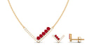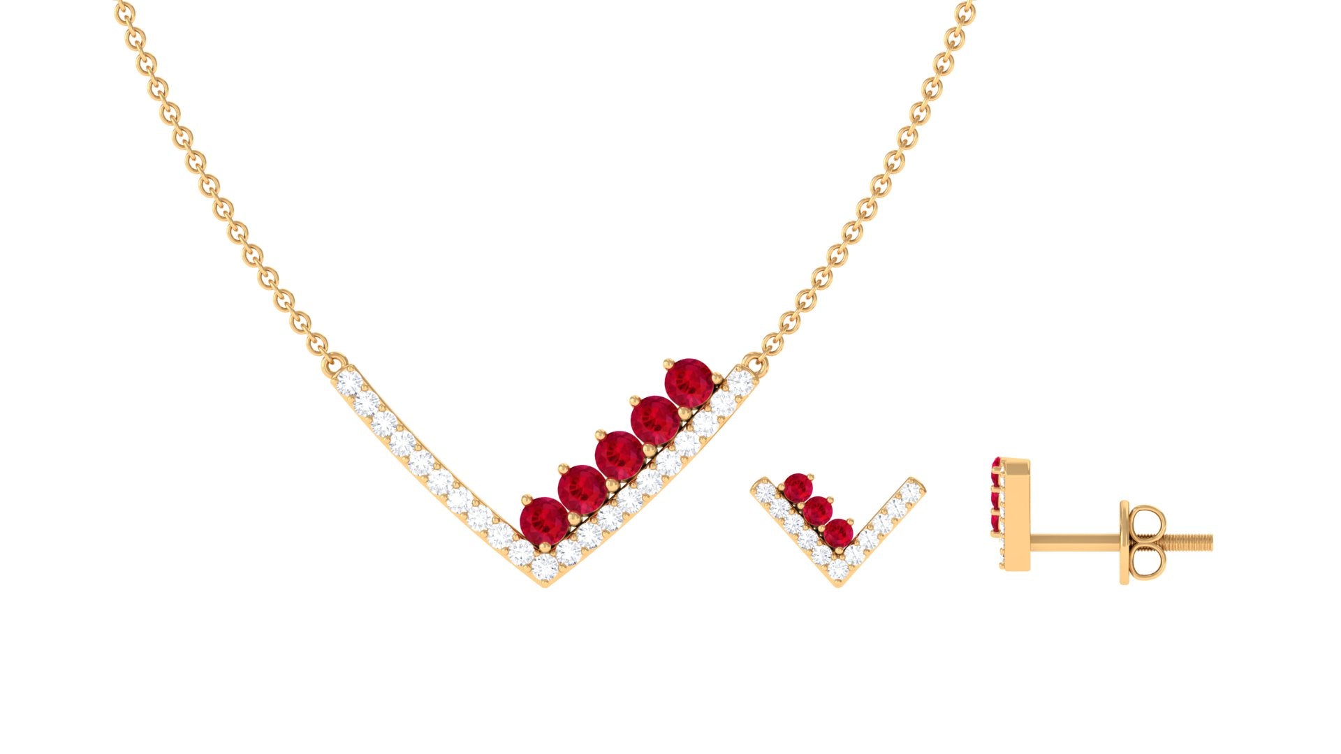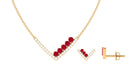 This stunning Created Ruby and Diamond Chevron Necklace and Earrings Set is perfect for any occasion. The striking contrast between the Created Ruby and Diamond stones creates a modern and eye-catching design, while the sleek prong setting adds a touch of elegance and sophistication. Perfect for a special occasion or everyday wear, this Created Ruby jewelry set is sure to become a cherished addition to your jewelry collection.