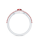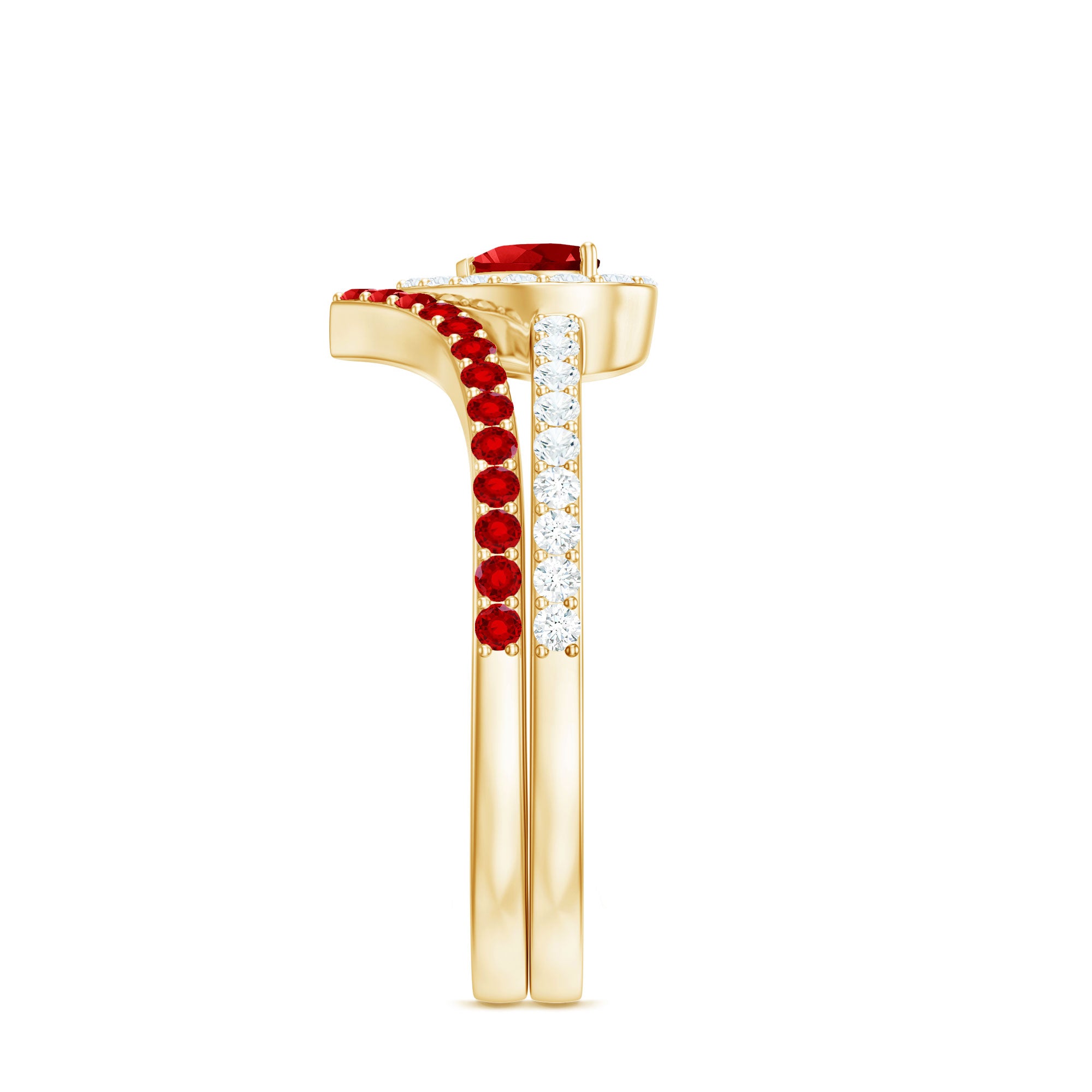 Show your forever kind of love with a ring set that is made to stand out. This stunning Lab Created Ruby Wedding Ring Set brings together deep romance and timeless beauty in the most charming way. Designed with a heartfelt twist, it includes a heart shaped engagement ring paired with a chevron style enhancer band that wraps around it perfectly. At the center of the engagement ring sits a 4 MM heart shaped lab grown ruby, held safely in prong setting. The vibrant red stone is surrounded by a halo of shimmering diamonds, giving this Bridal Ring Set just the right pop of sparkle. More petite diamonds line the band, making the whole piece glow with elegance and love. The matching enhancer band curves naturally around the engagement ring, completing the look with a stylish stacked design. It is detailed with tiny round lab created rubies that add a subtle yet stunning finish. Together, the rings tell a story of connection, commitment, and lasting passion. Made with AAAA quality lab ruby and sparkling HI-SI quality diamonds, this Heart Engagement Ring with Enhancer is perfect for any woman who loves classic pieces with a meaningful touch. Packed beautifully in a signature jewelry box and complete with a certificate of authenticity, it is ready to gift or keep as a treasure for years to come.