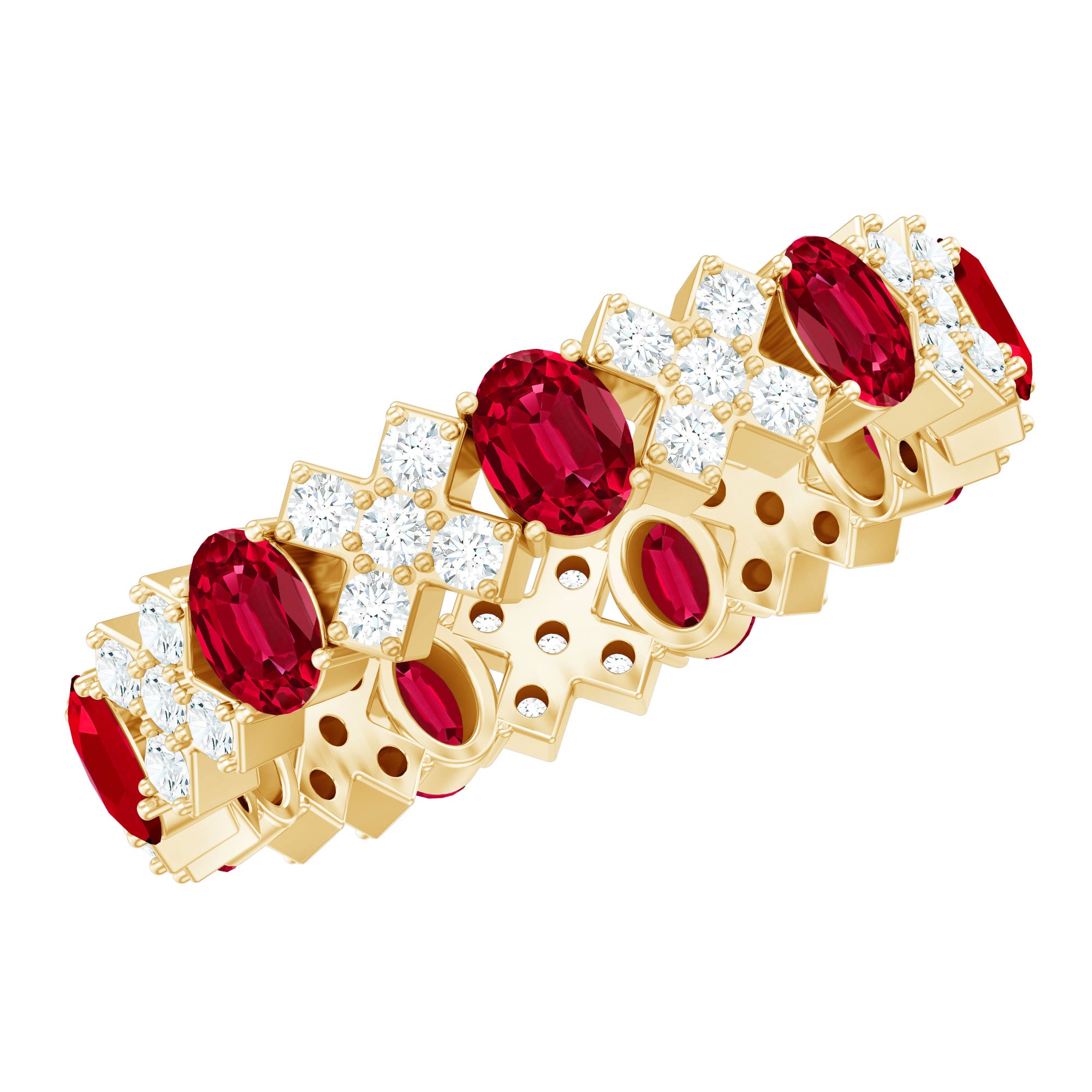 Let her know how much you love her with this elegant oval eternity band ring. This designer band is adorned with oval-cut lab-created rubies in a prong setting and round moissanite in a prong setting, all crafted in a gorgeous gold metal. Dont wait, make this stunning eternity band yours today.