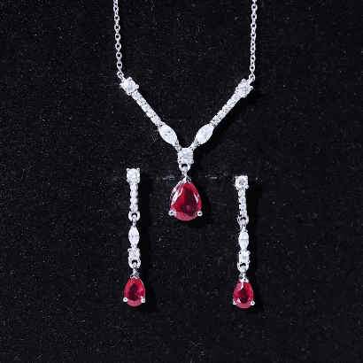 If youre searching for the perfect jewelry set to adorn your bride-to-be on your wedding day, look no further than this stunning Created Ruby Jewelry Set. With a gorgeous Pear Cut Created Ruby stone set in a secure Prong Setting and accented with sparkling Moissanite on both the pendant and drop earrings, this drop jewelry set is sure to make a statement. The elegant design is both classic and modern, making it a versatile addition to any jewelry collection.