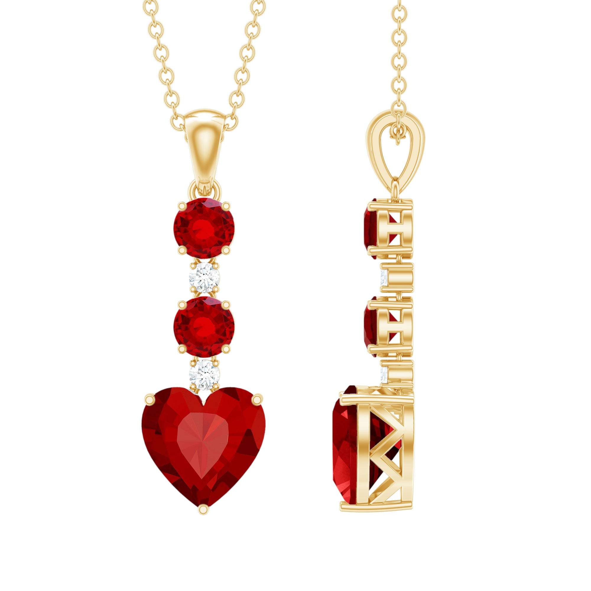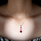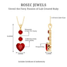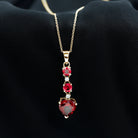Turn heads with this elegant Dangle Pendant Necklace, designed to bring sparkle and charm to every outfit. At the heart of the design hangs a brilliant 8 MM heart shaped lab created ruby, a symbol of love and passion. This striking ruby is suspended from a vertical row of alternating round moissanite and lab created ruby stones, each carefully secured in prong setting to maximize brilliance and shine. The thoughtful arrangement of gemstones ensures a balanced and eye-catching look, allowing the Lab Grown Ruby Necklace to catch light beautifully from every angle. Its sleek vertical design adds length and elegance, creating a flattering and graceful appearance around the neckline. Hanging from a delicate chain, this Ruby Heart Pendant sits comfortably and securely, making it suitable for daily wear or special occasions. Perfect for birthdays, anniversaries, Valentine’s Day, or romantic gifts, this Ruby and Moissanite Necklace symbolizes love, elegance, and timeless style.
