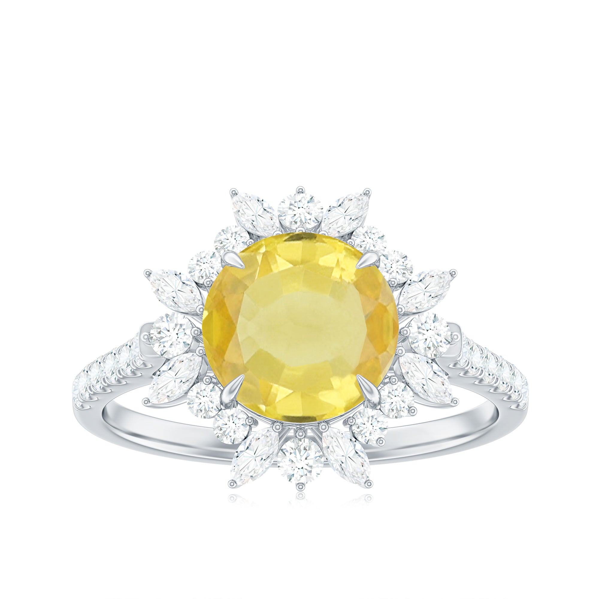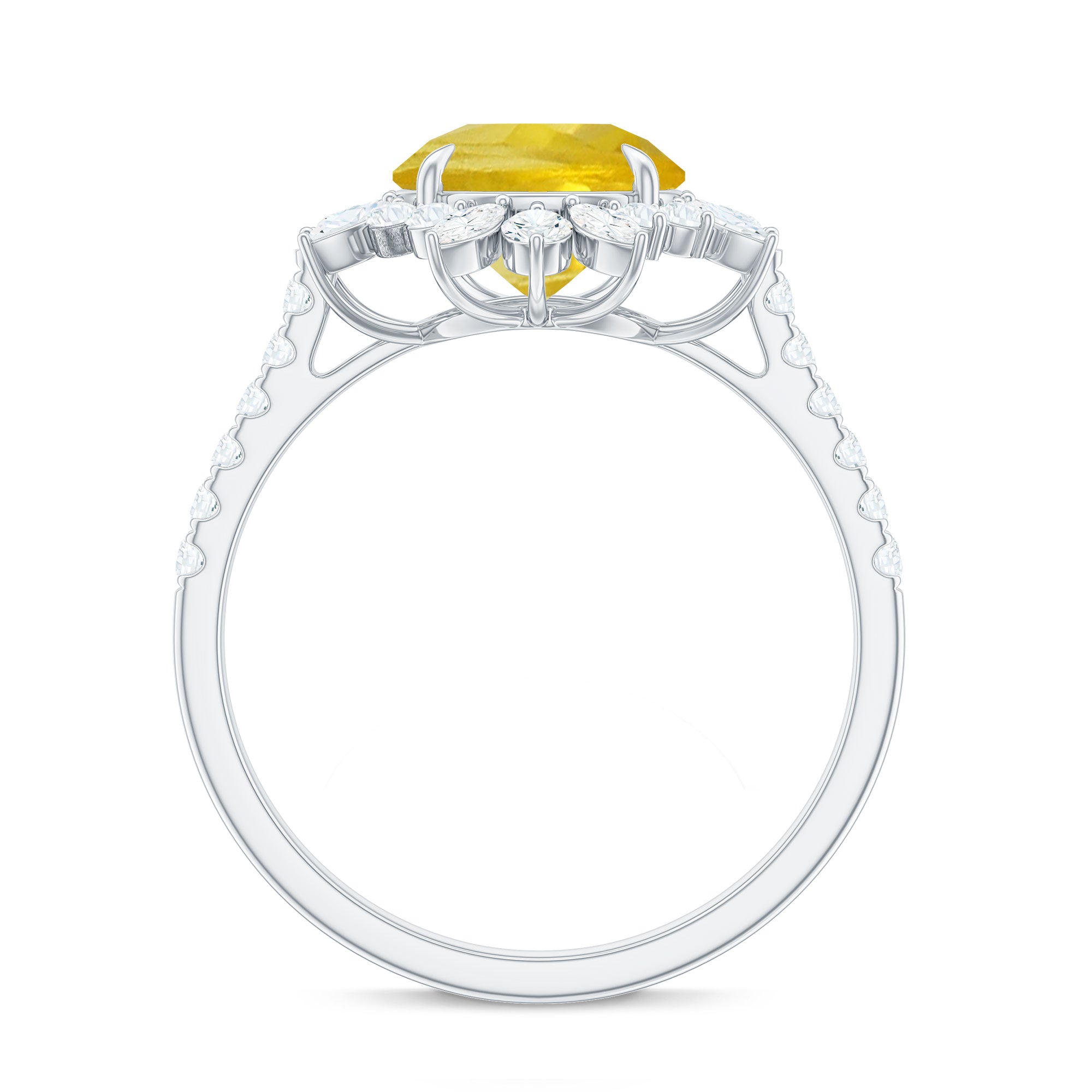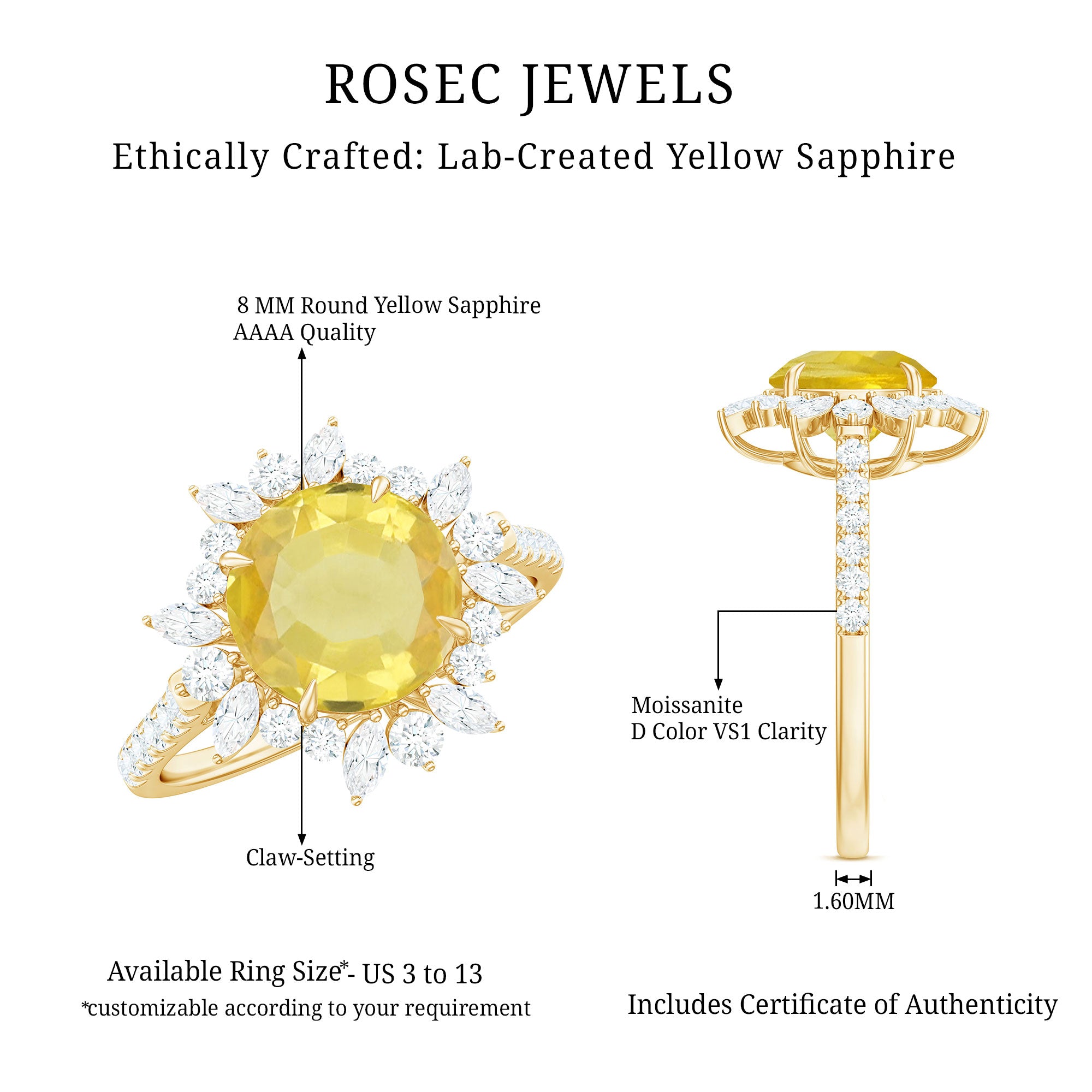 Update your evening looks with this Floral Engagement Ring featuring Round Shape Lab Created Yellow Sapphire secured in Claw Setting while Marquise and Round Shape Moissanite studded as Halo. Gift this exquisite Created Yellow Sapphire Ring to your better half as Anniversary Gift and let her shine and dazzle at all her events.
