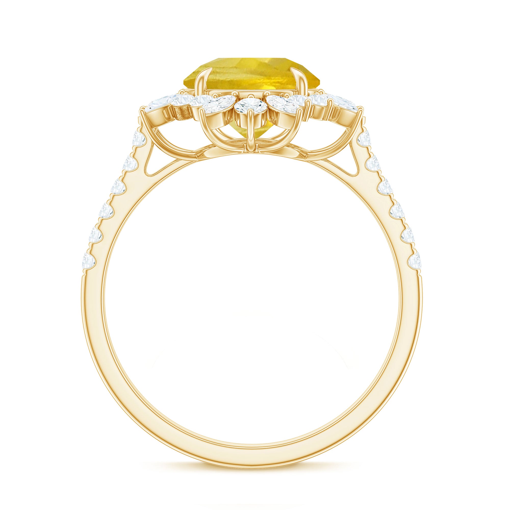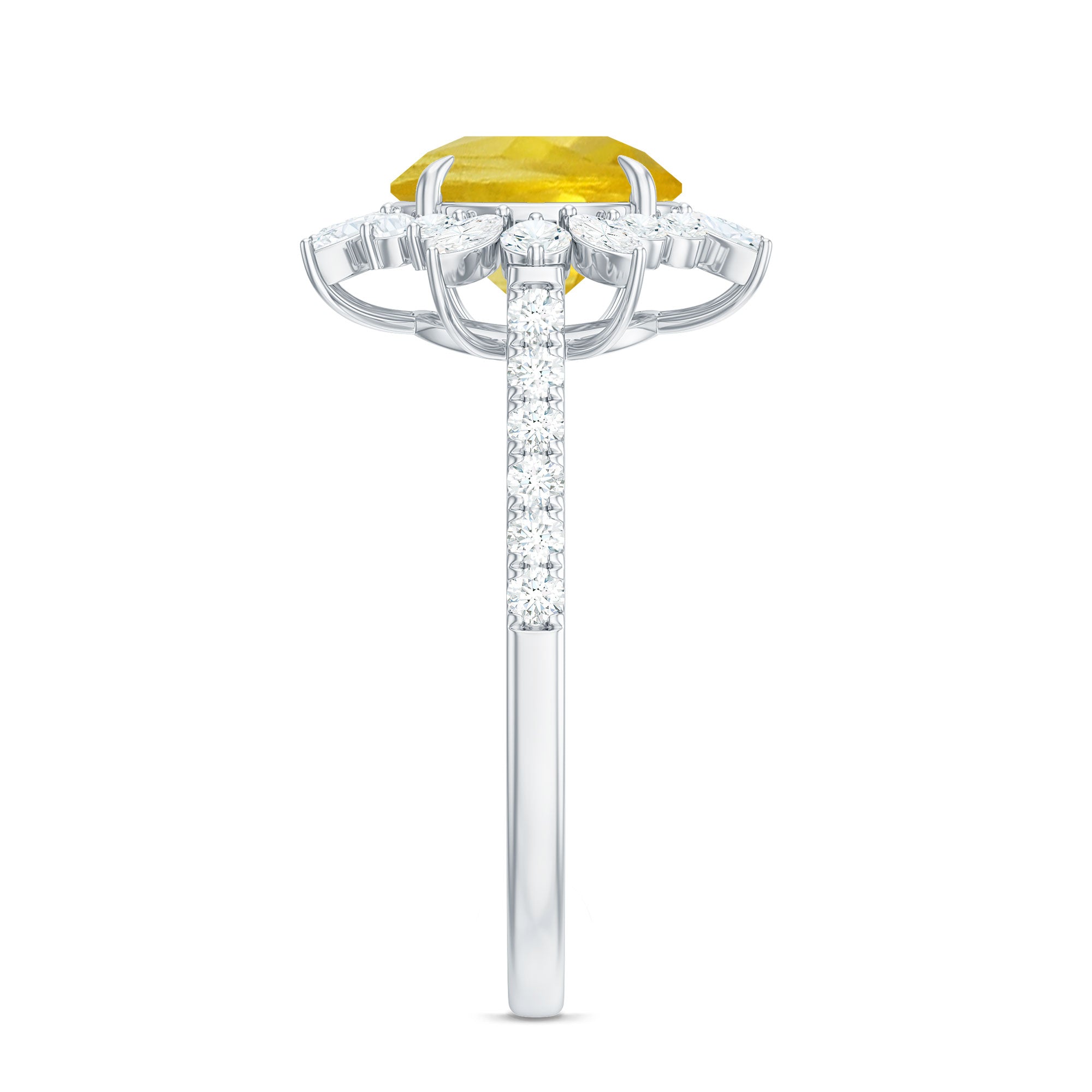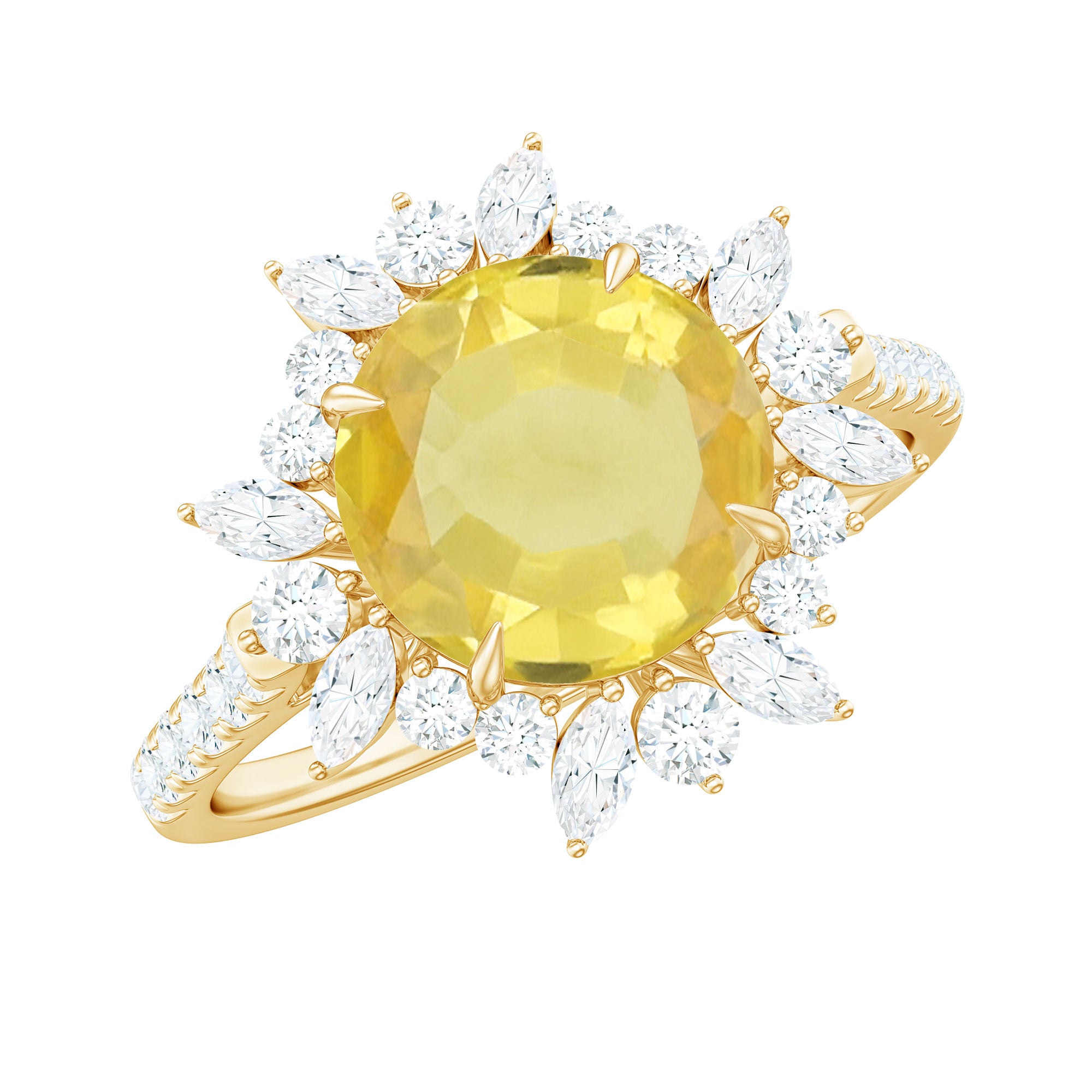 Update your evening looks with this Floral Engagement Ring featuring Round Shape Lab Created Yellow Sapphire secured in Claw Setting while Marquise and Round Shape Moissanite studded as Halo. Gift this exquisite Created Yellow Sapphire Ring to your better half as Anniversary Gift and let her shine and dazzle at all her events.