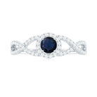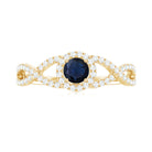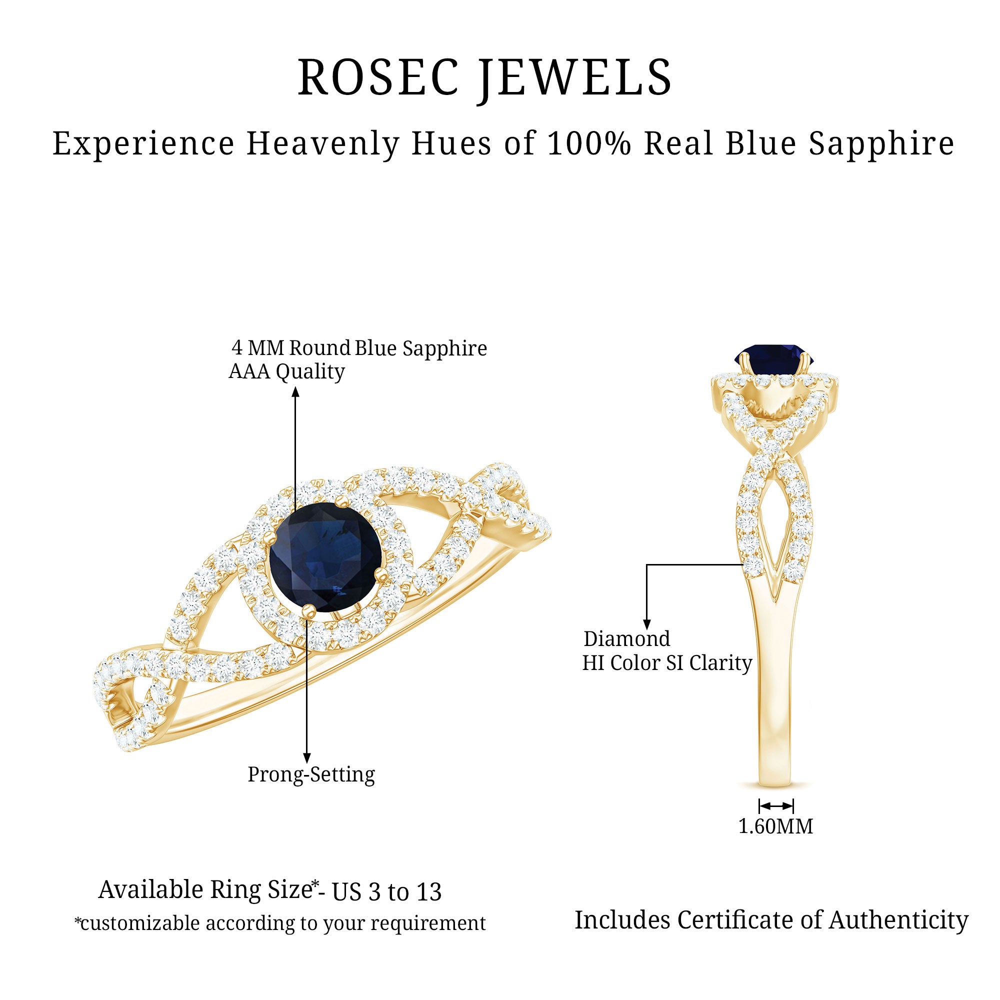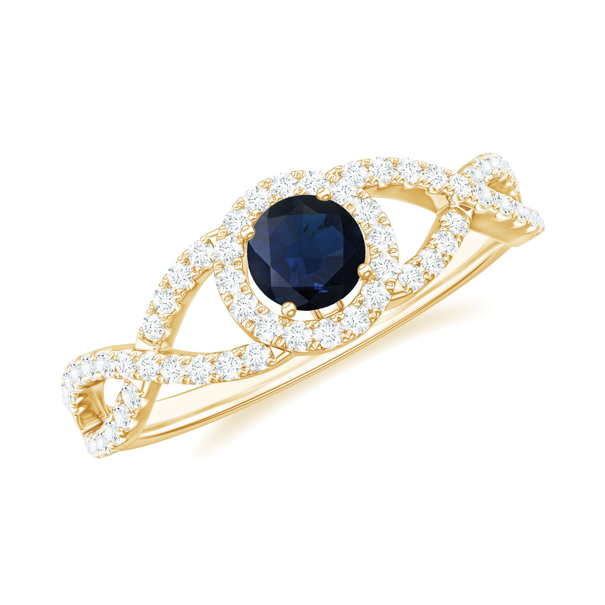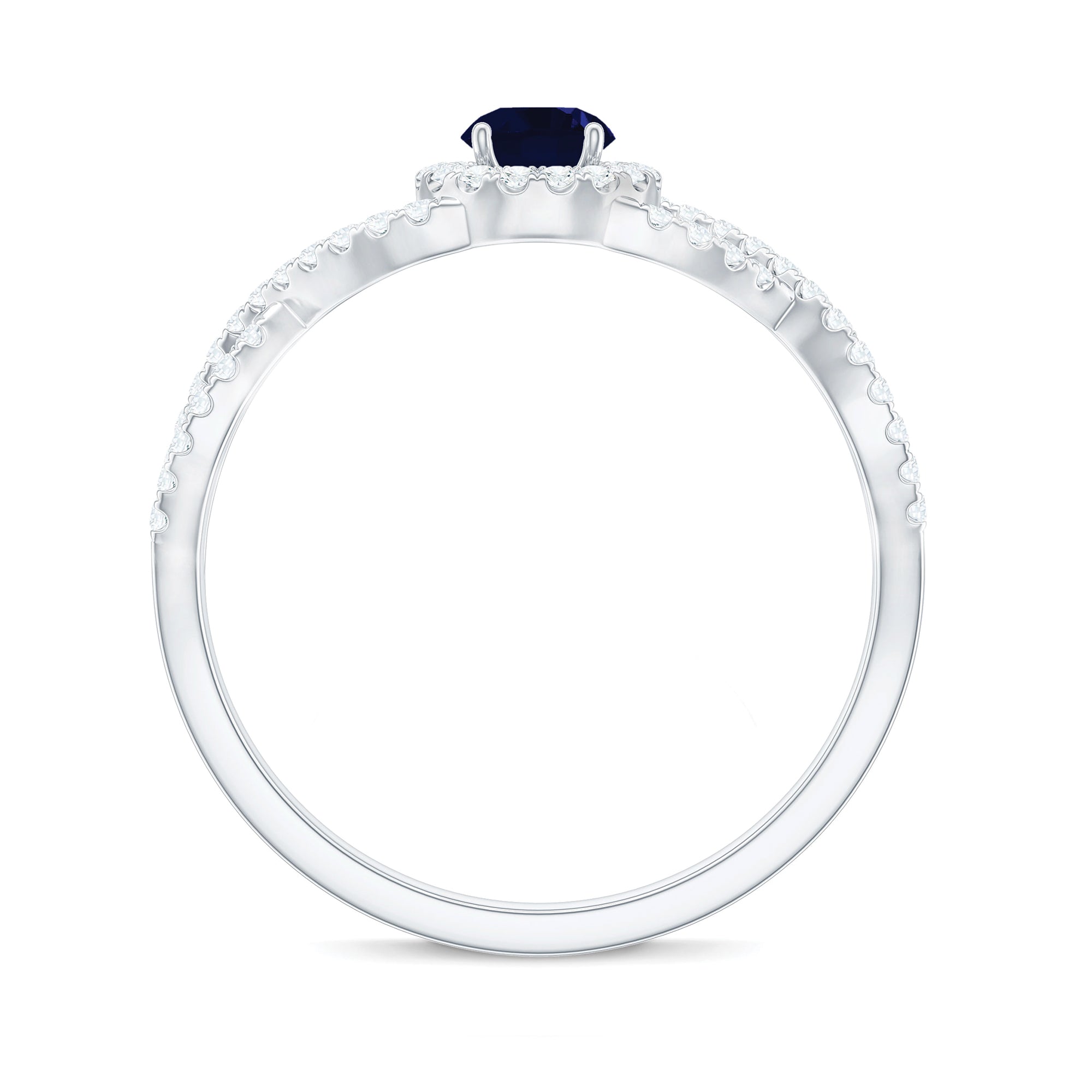Criss Cross Shank Blue Sapphire and Diamond Halo Engagement Ring