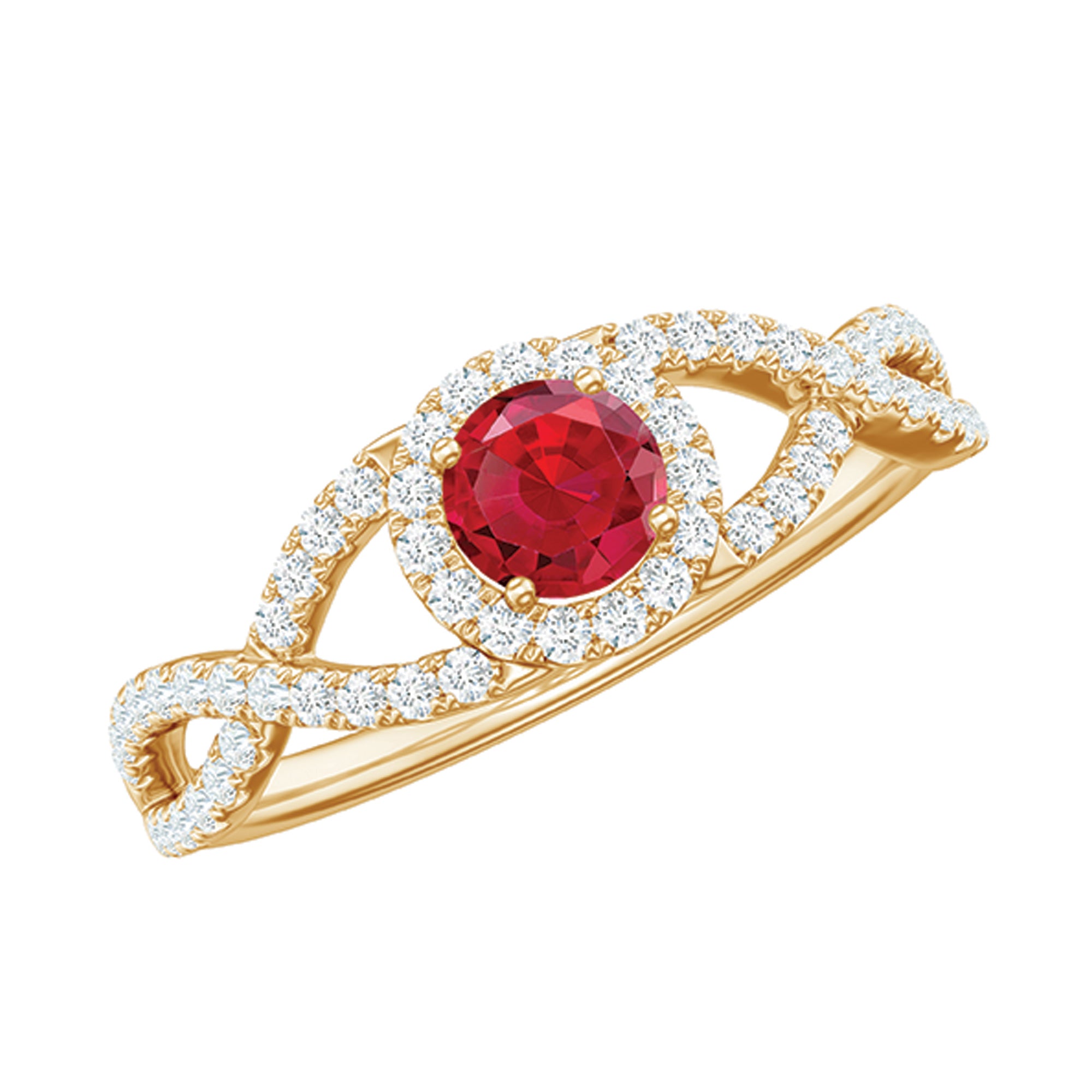Criss Cross Shank Created Ruby and Diamond Halo Engagement Ring