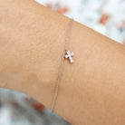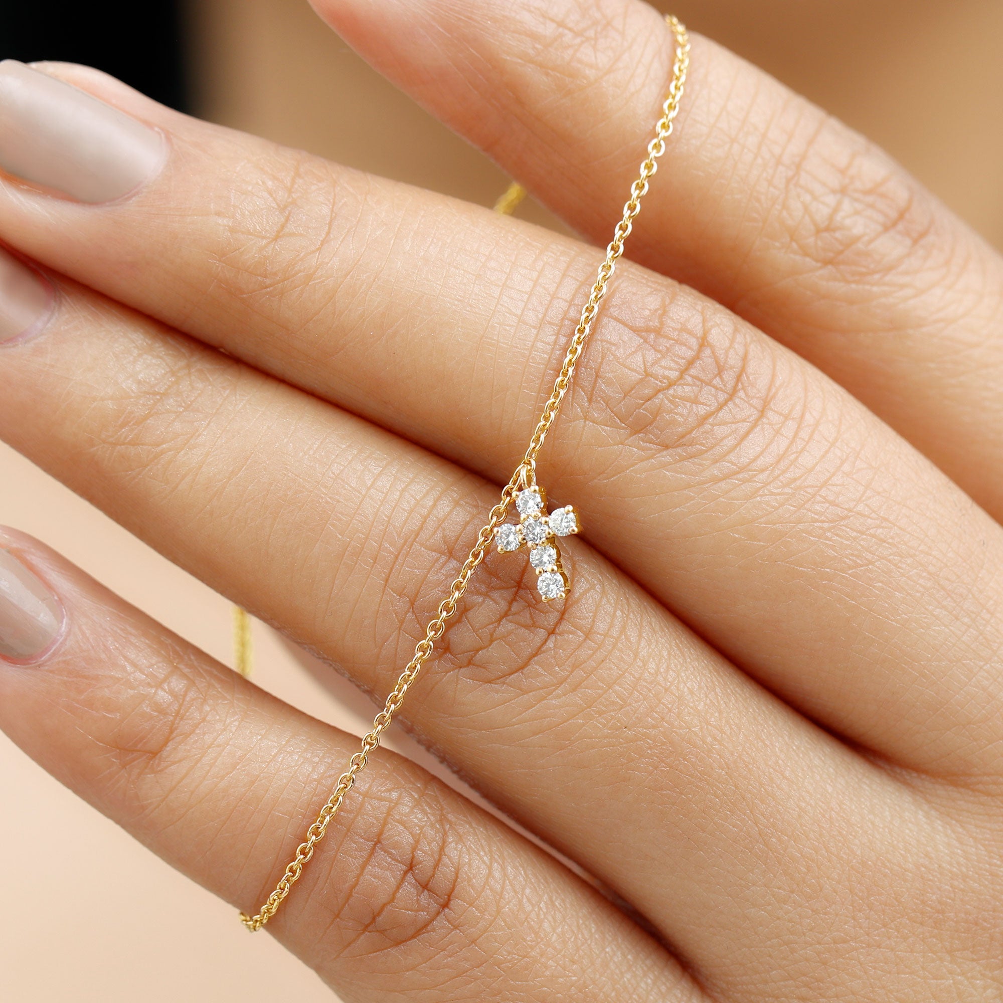 This Moissanite Cross Bracelet embodies spirituality, faith, and a divine connection. Its subtle design transcends trends and seasons, exemplifying timeless elegance. Adorned with round cut Moissanites arranged in a cross motif, this bracelet combines spiritual significance with a minimalist style, rendering it a meaningful accessory that exudes understated elegance. Symbolizing hope, faith, and eternal love, this Catholic Cross Bracelet possesses a distinctive charm and allure. The Cross bracelet design is suspended from a secure cable chain, fastened with a lobster clasp to ensure a perfect fit. Radiate sophistication and enhance your appearance with this signature piece. With its charm and appeal, this Cross Charm Bracelet seamlessly merges prominence with elegance. The D color VS1 clarity moissanite make a bold statement with their beauty and brilliance, capturing attention with their style.