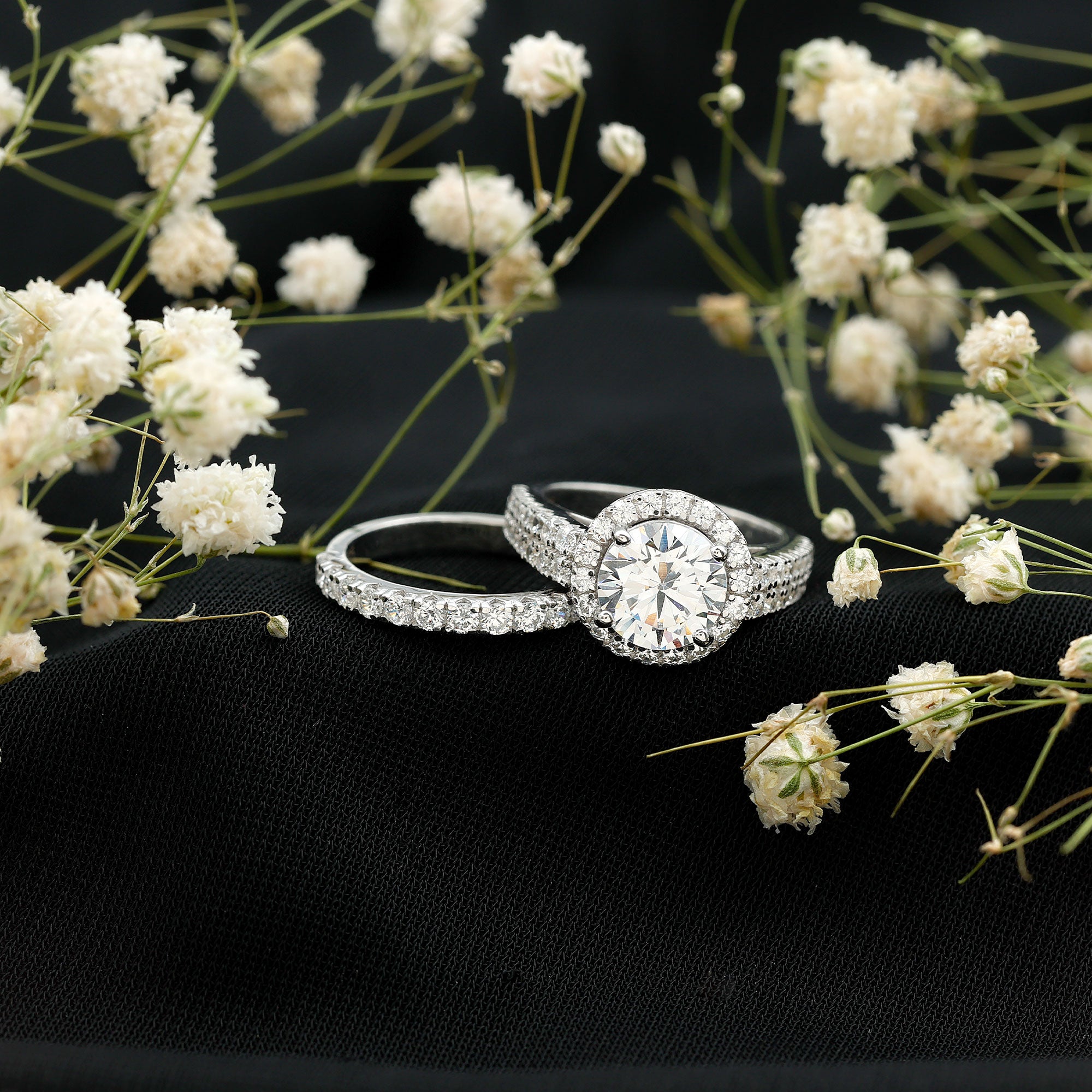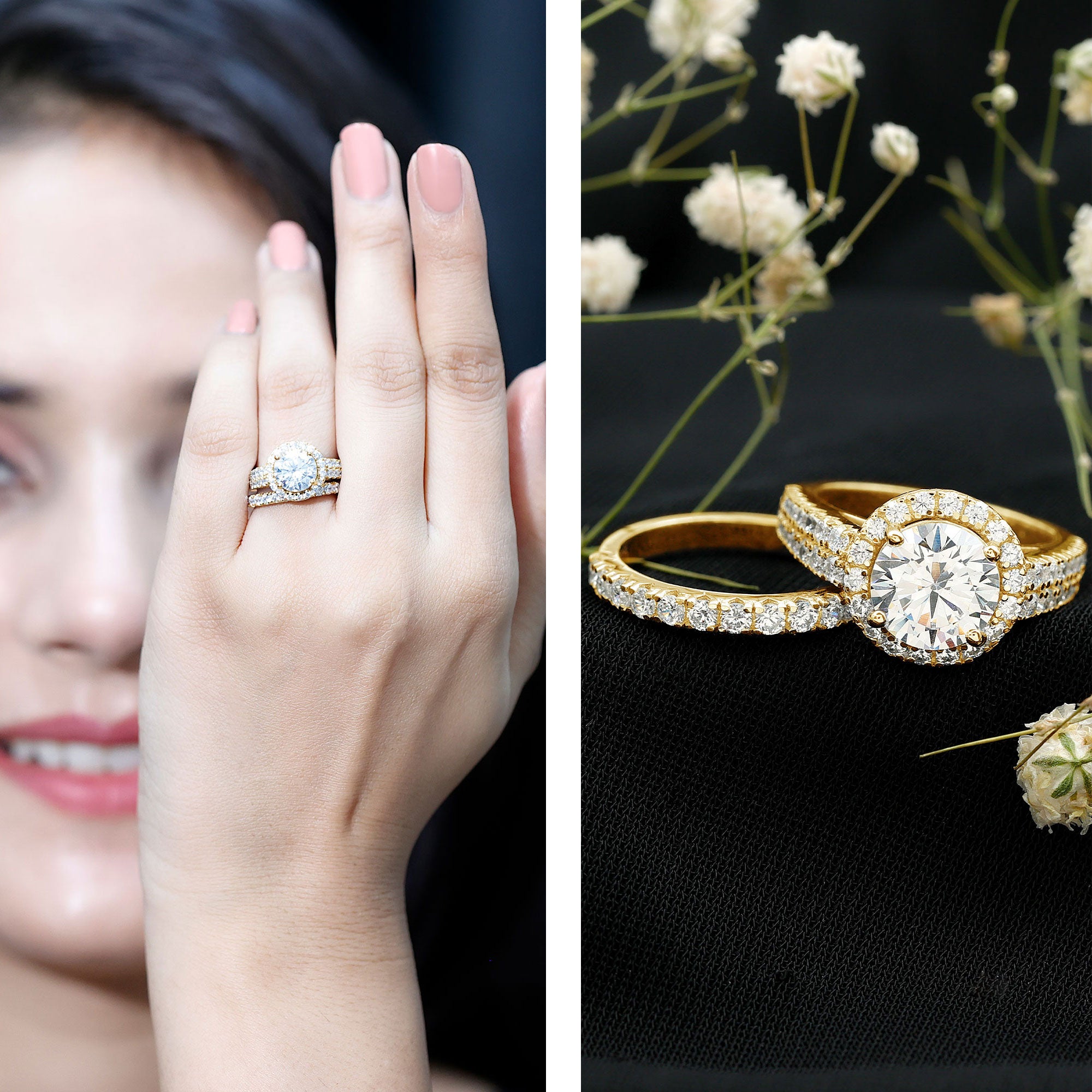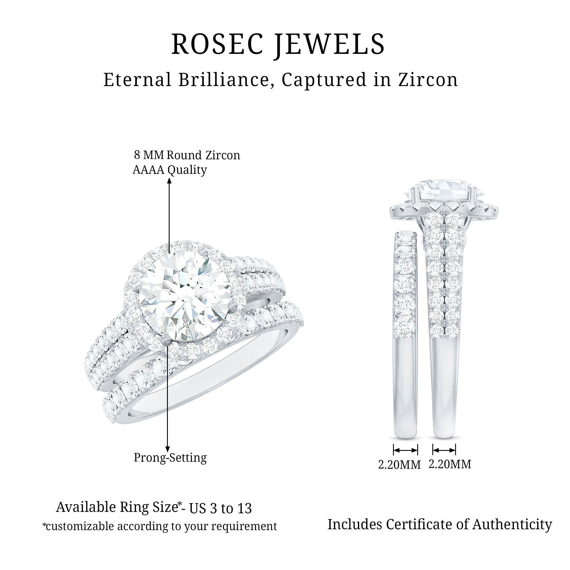 Preserve every romantic moment with the Zircon Wedding Ring Set, featuring a central Round Shape Zircon embraced by a delicate halo and side stones. This exquisite Enhancer Band Ring is also adorned with round cubic zirconia. This ensemble of Cubic Zirconia ring set will add a sparkling touch to her attire.